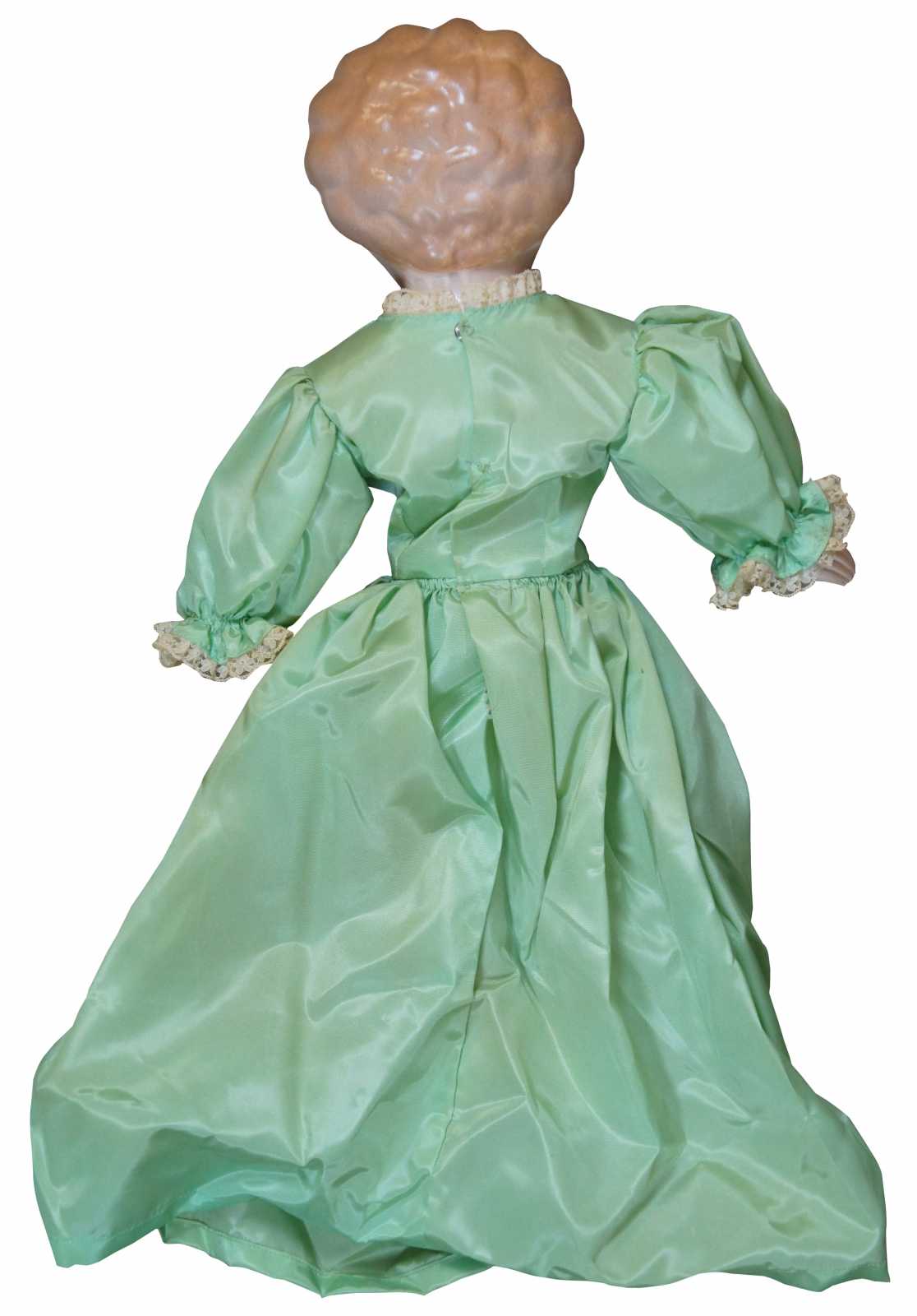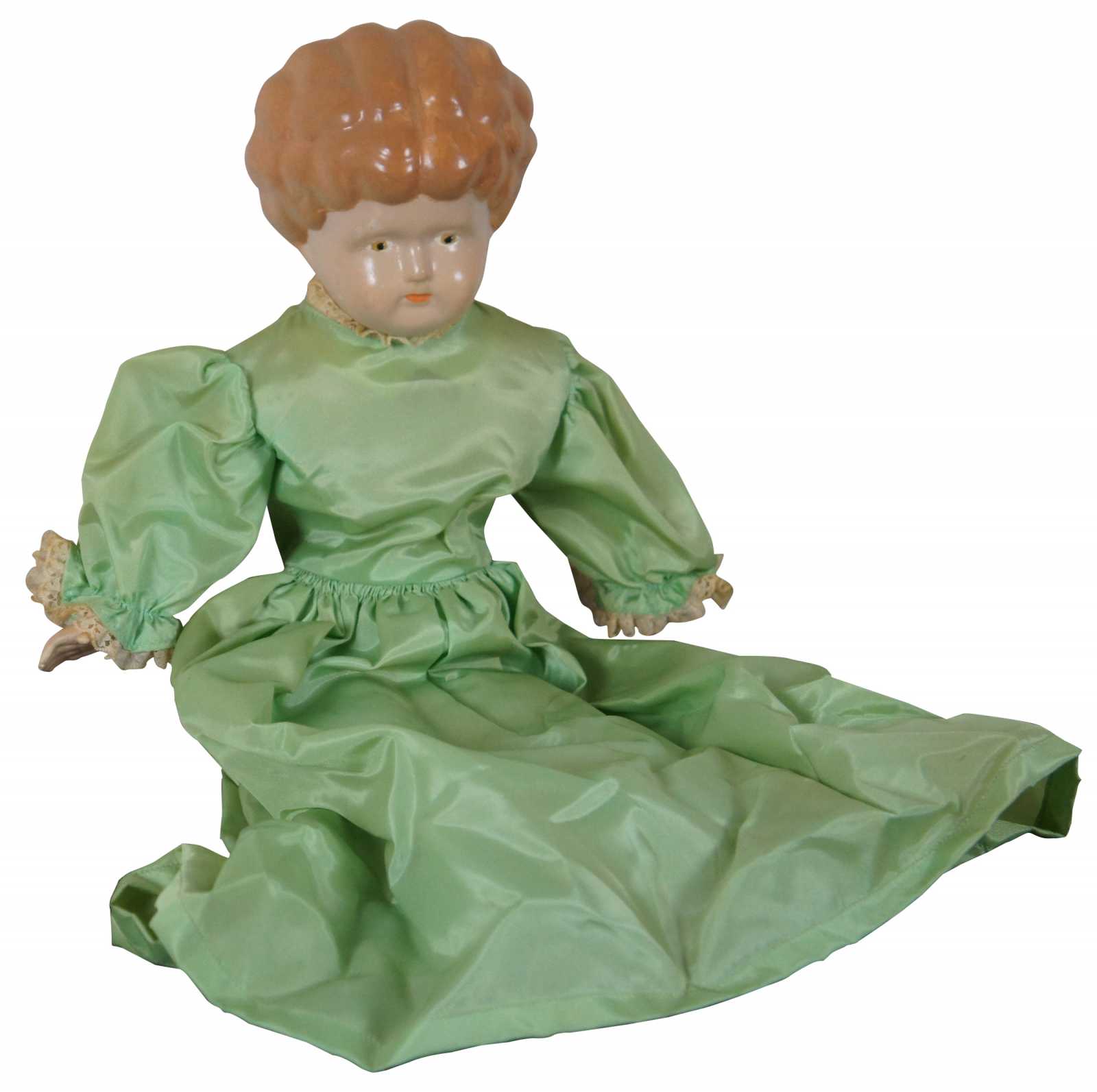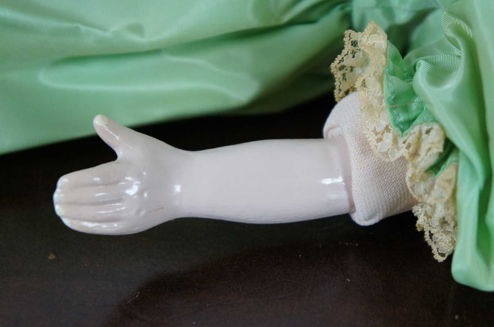 Antique mid 19th century German china doll with painted porcelain bust, feet and hands, cloth body and green dress.