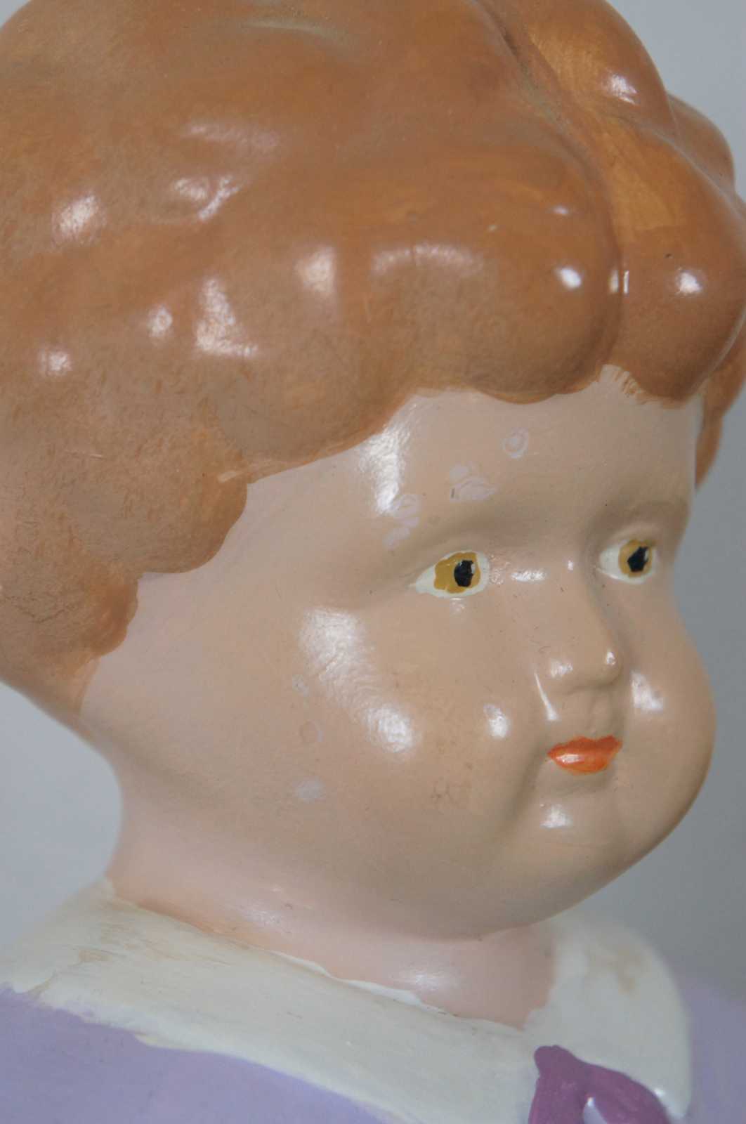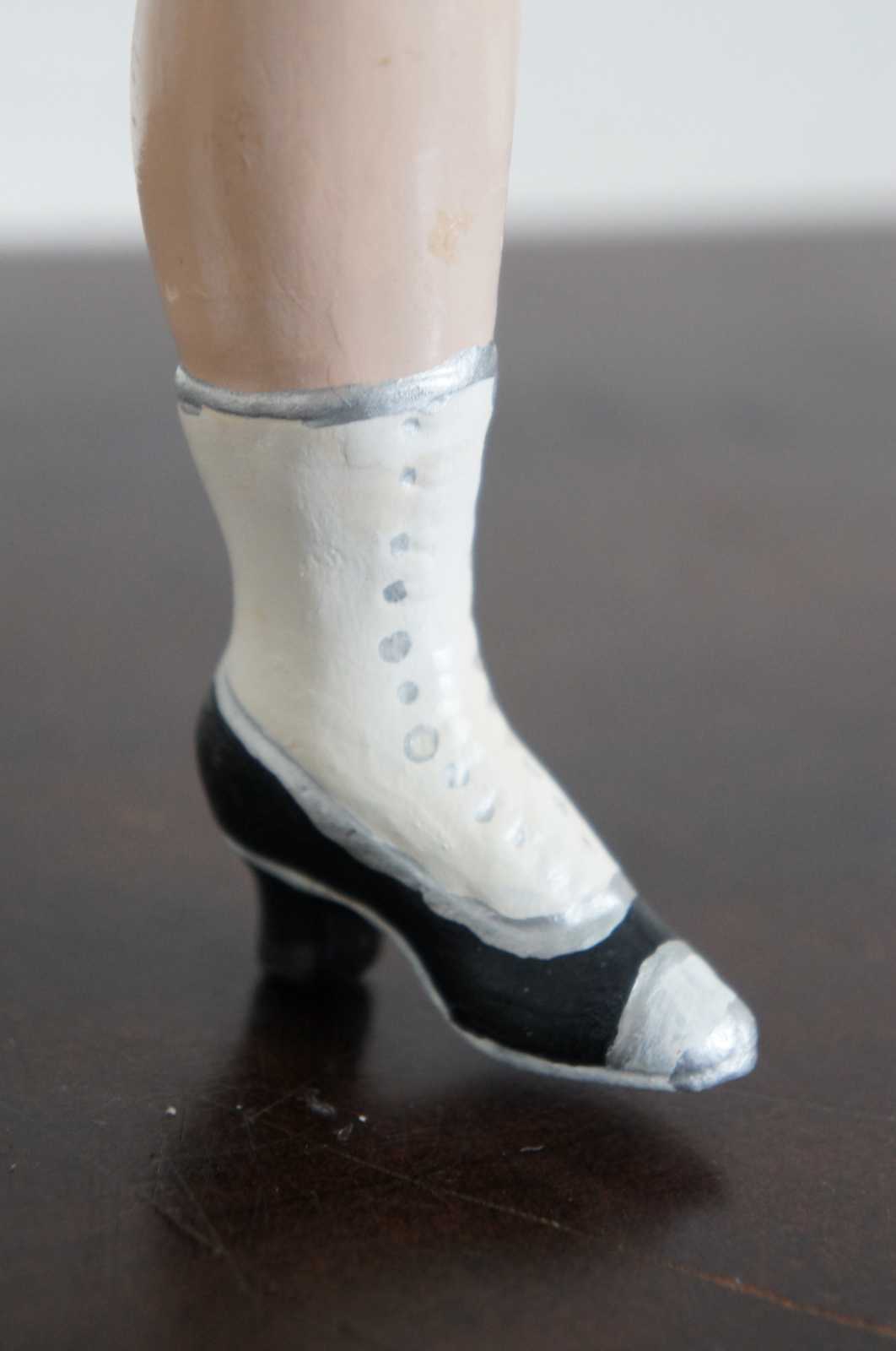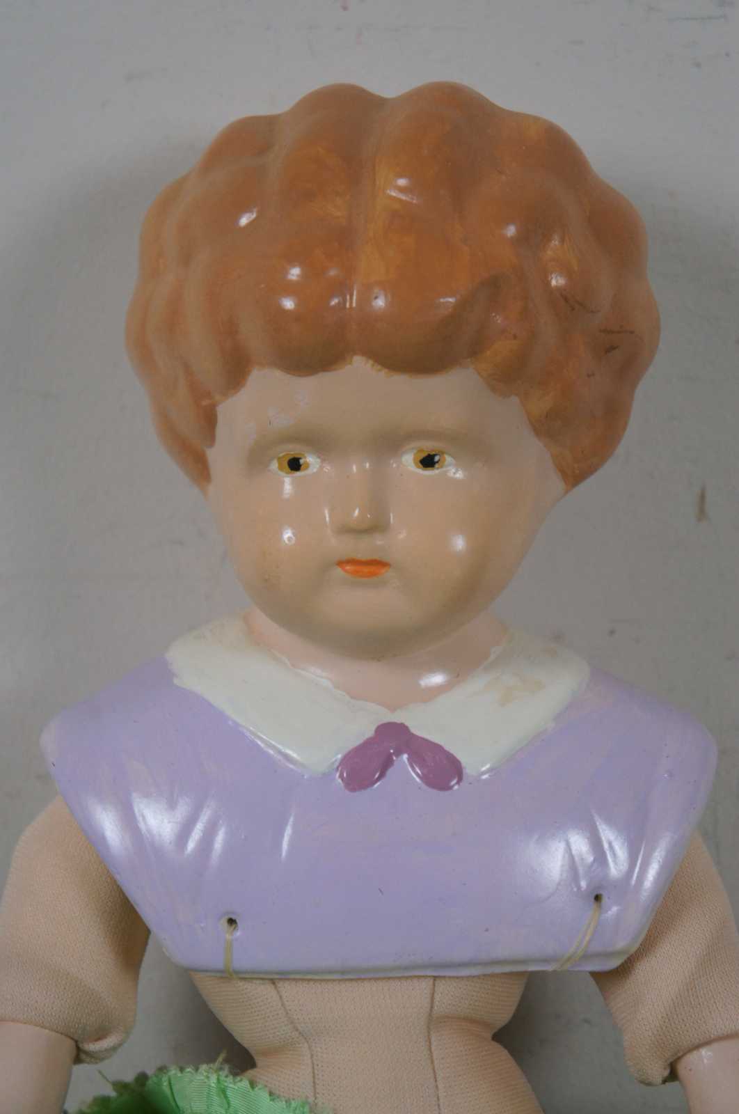 Antique mid 19th century German china doll with painted porcelain bust, feet and hands, cloth body and green dress.