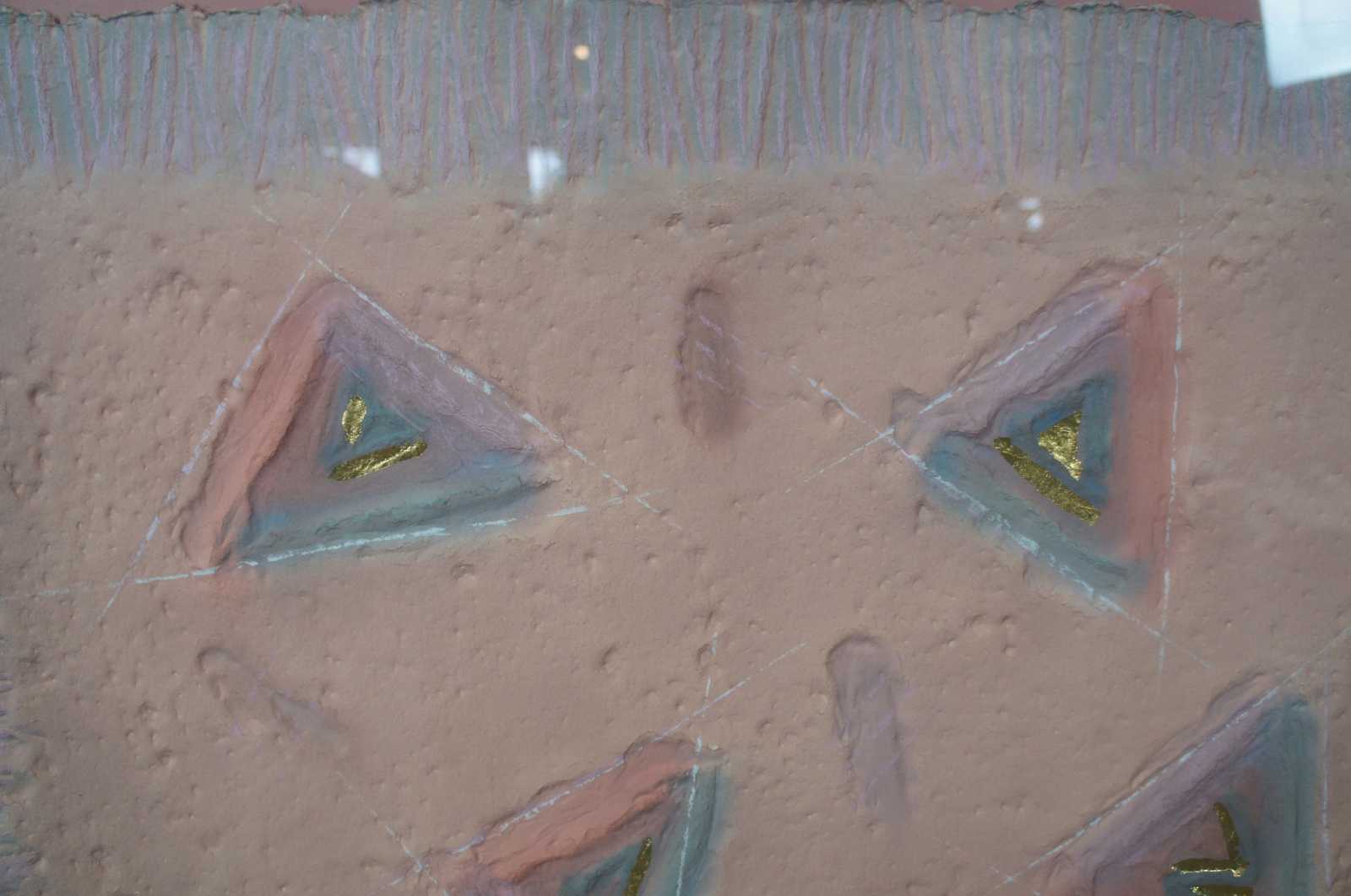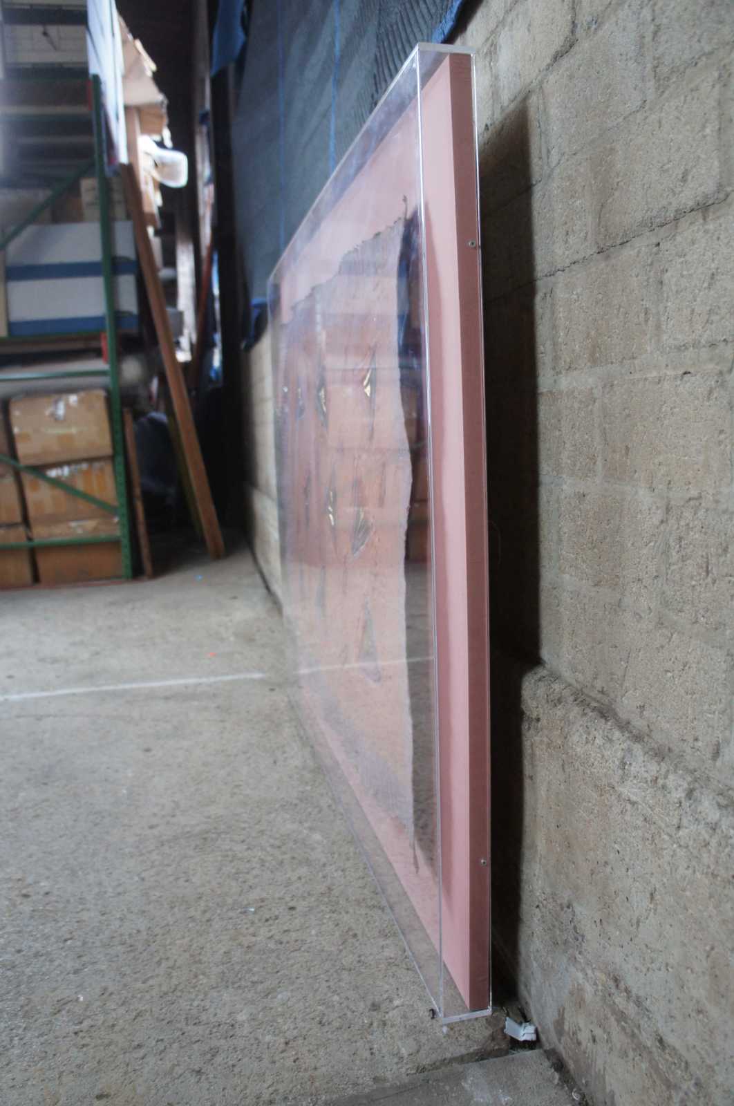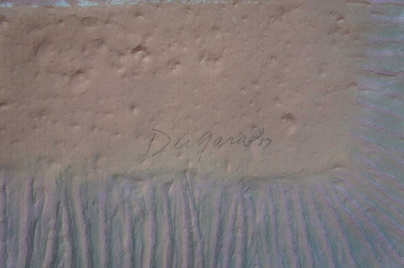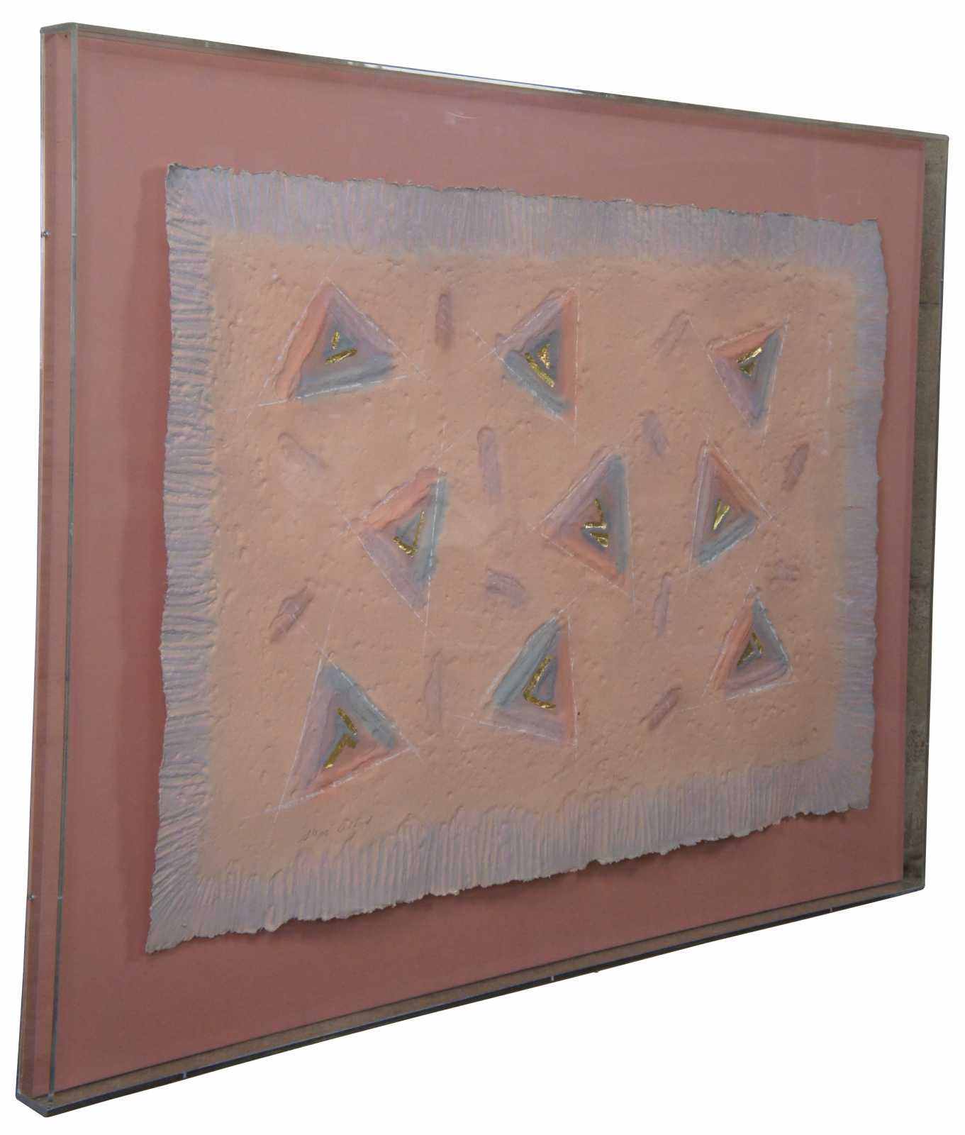 1988 Ann Dergara mixed media painting. Hand carved and colored embossing done from a plate on etching press. The handcrafted "paper" floats over the "silken" backing material. Professionally mounted in a flawless 2-1/2" thick plexiglass shadowbox frame.