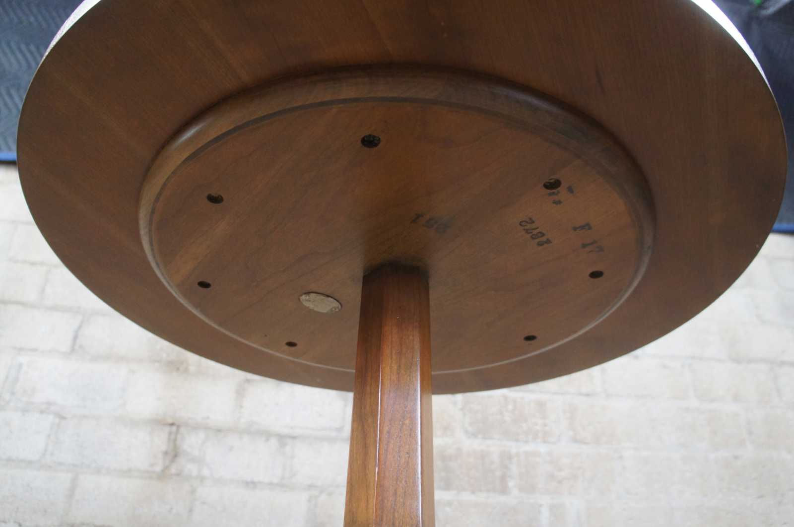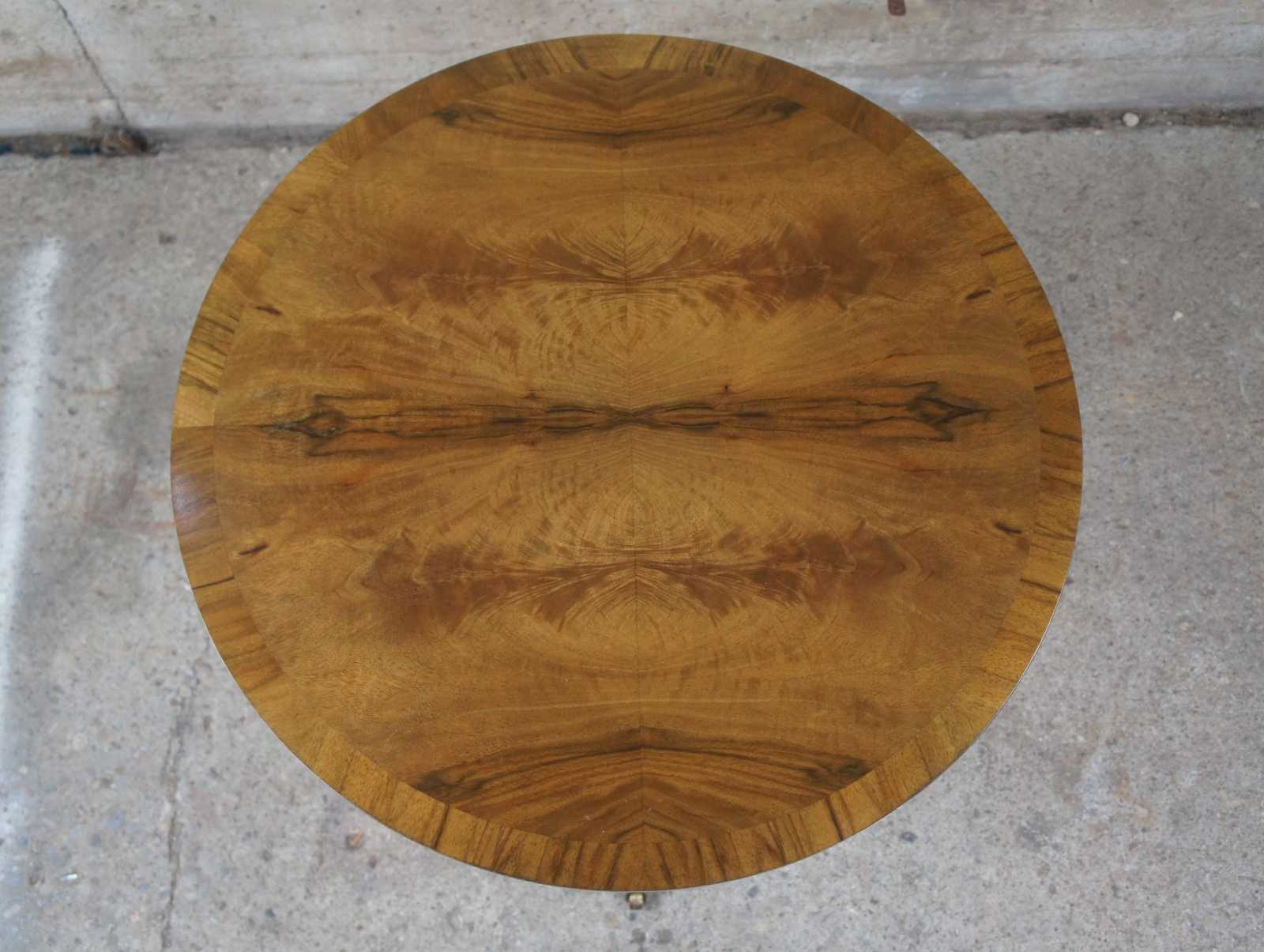 Circa 1970s Baker Furniture Regency style side table. Made from walnut with a banded and bookmatch veneered top, supported by a heagonal turned center support over tripod base with curved legs featuring brass caps and casters. Marked along underside with brass tag, #2872