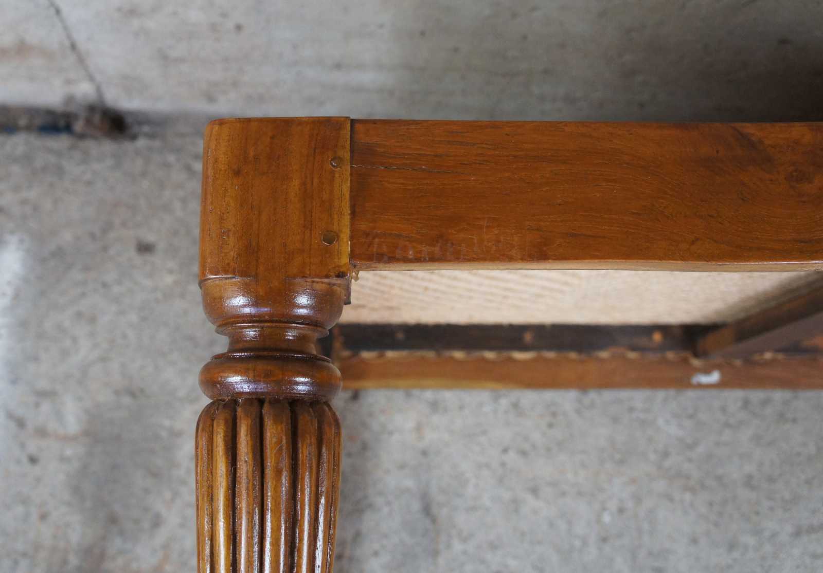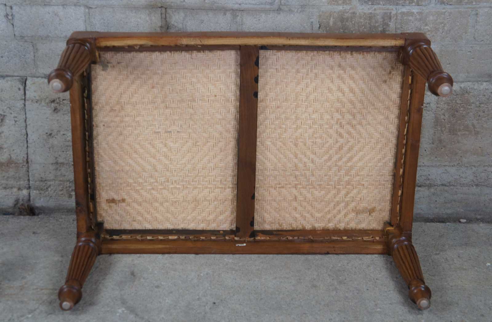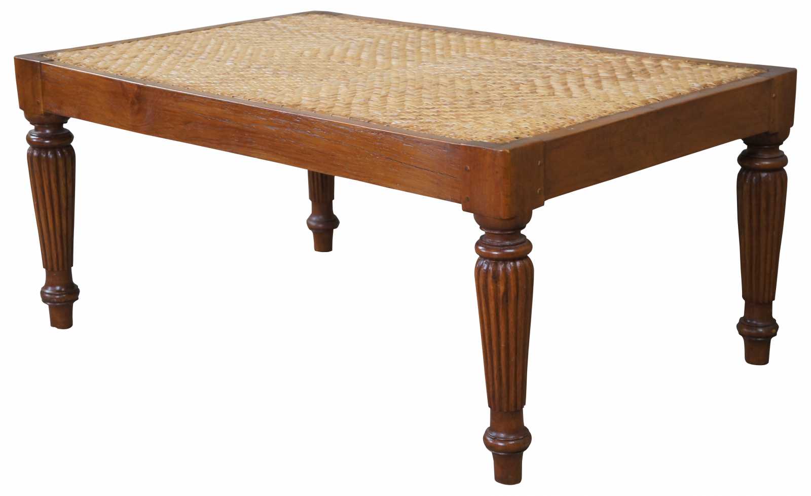 British Colonial style Coffee Table. Made during second half of the 20th century. Features a teak frame with woven rattan top. The table is supported by reeded legs leading to an arrow foot. Can be used as a bench.
