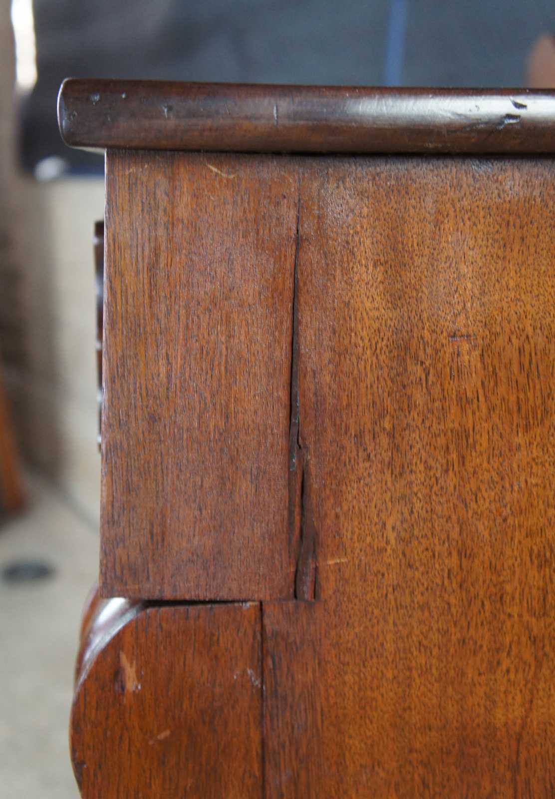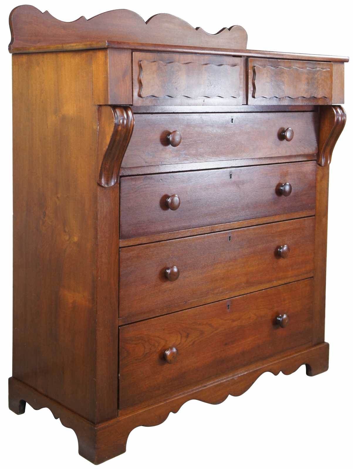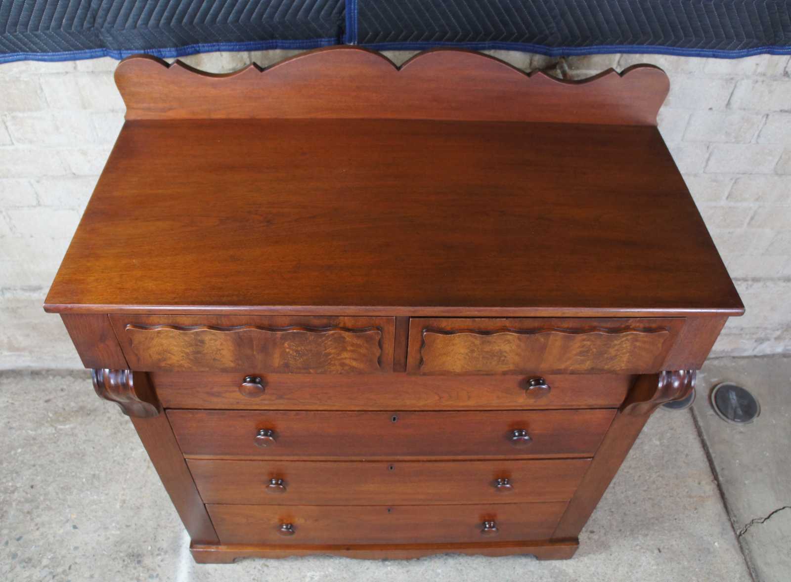 Antique 19th Century American Empire tallboy dresser or gentleman's chest. Made of mahogany with serpentine backsplash, raised flame mahogany upper drawer panels supported by corbel embellishments over four drawers.