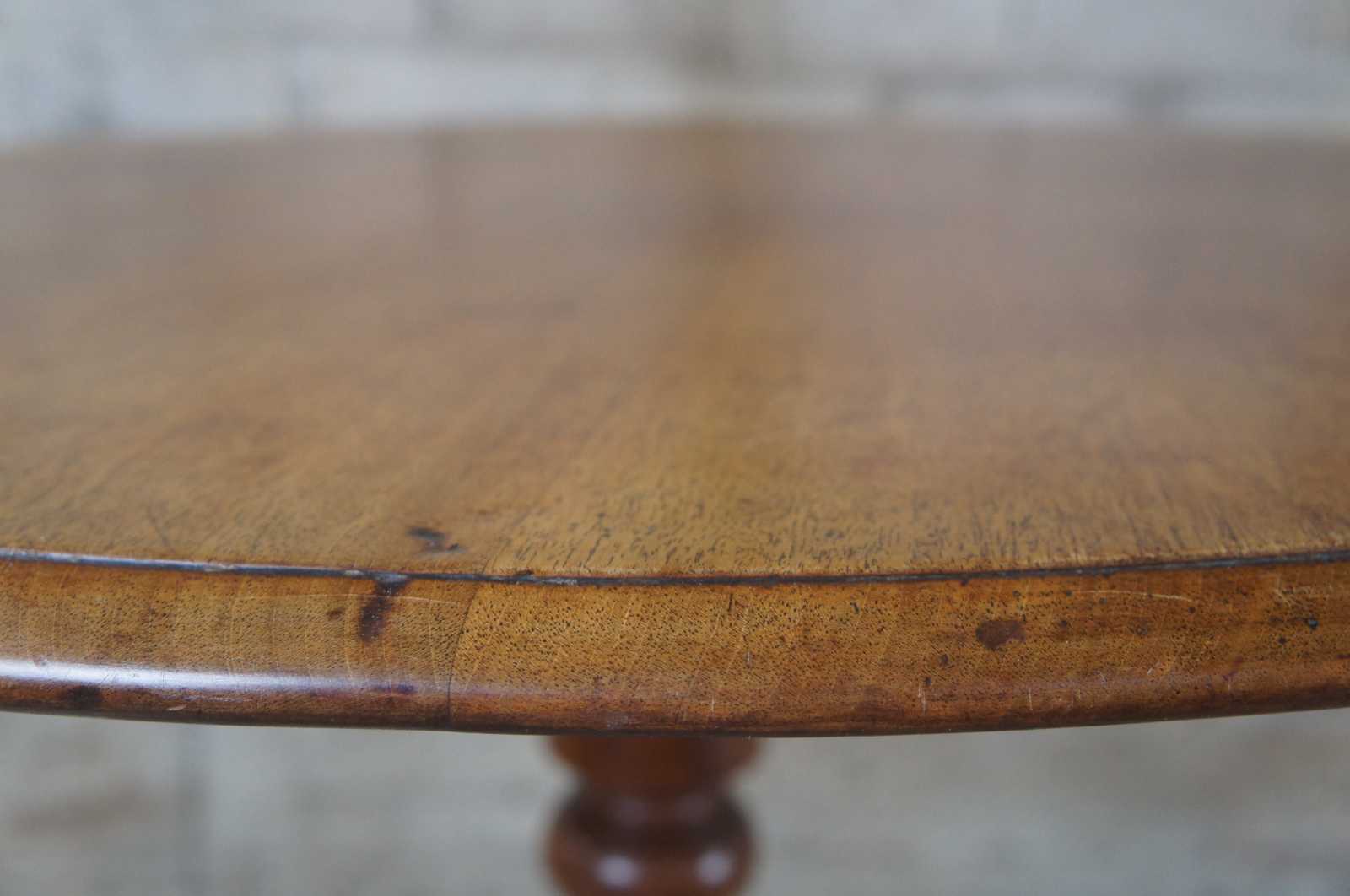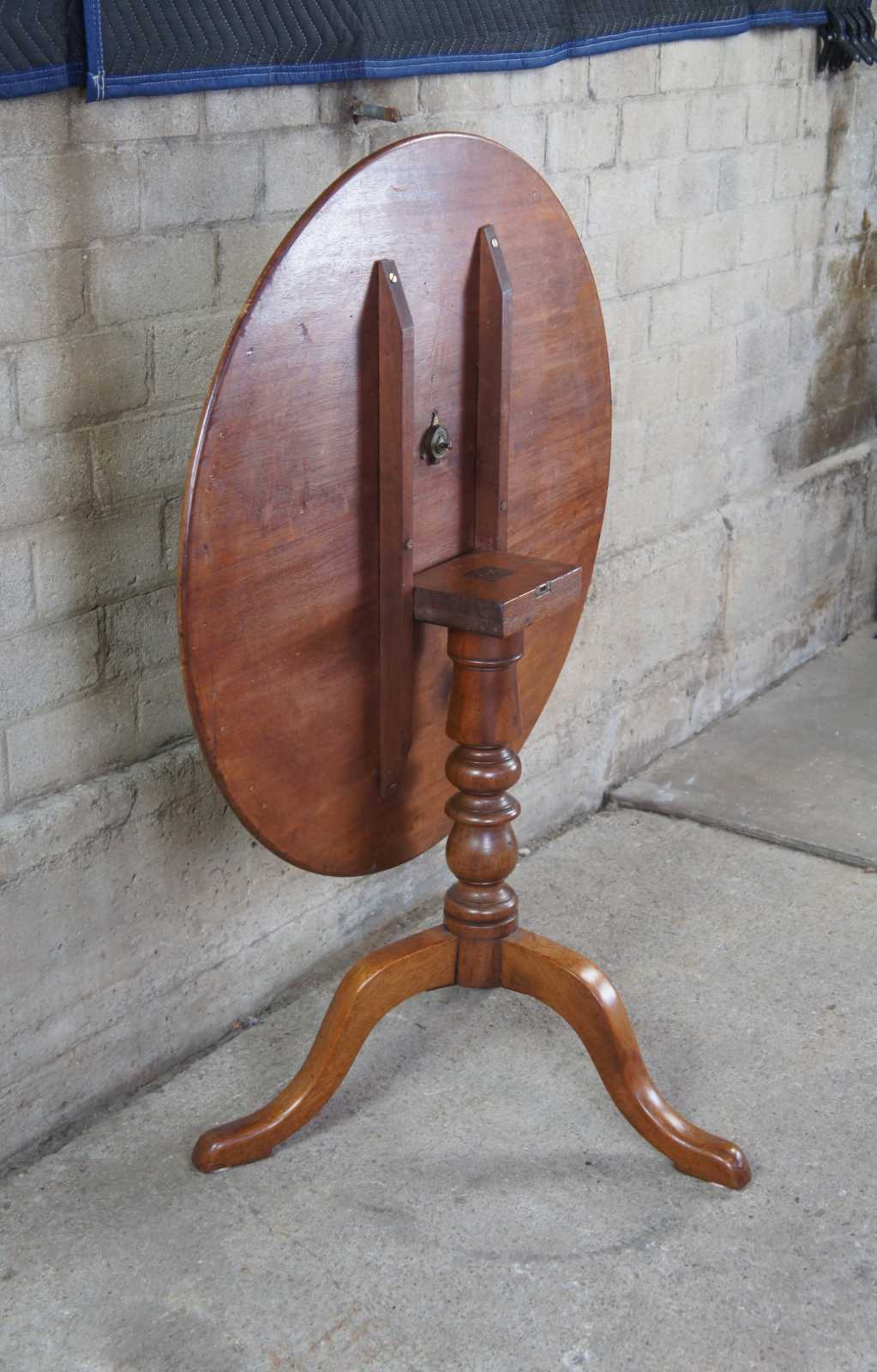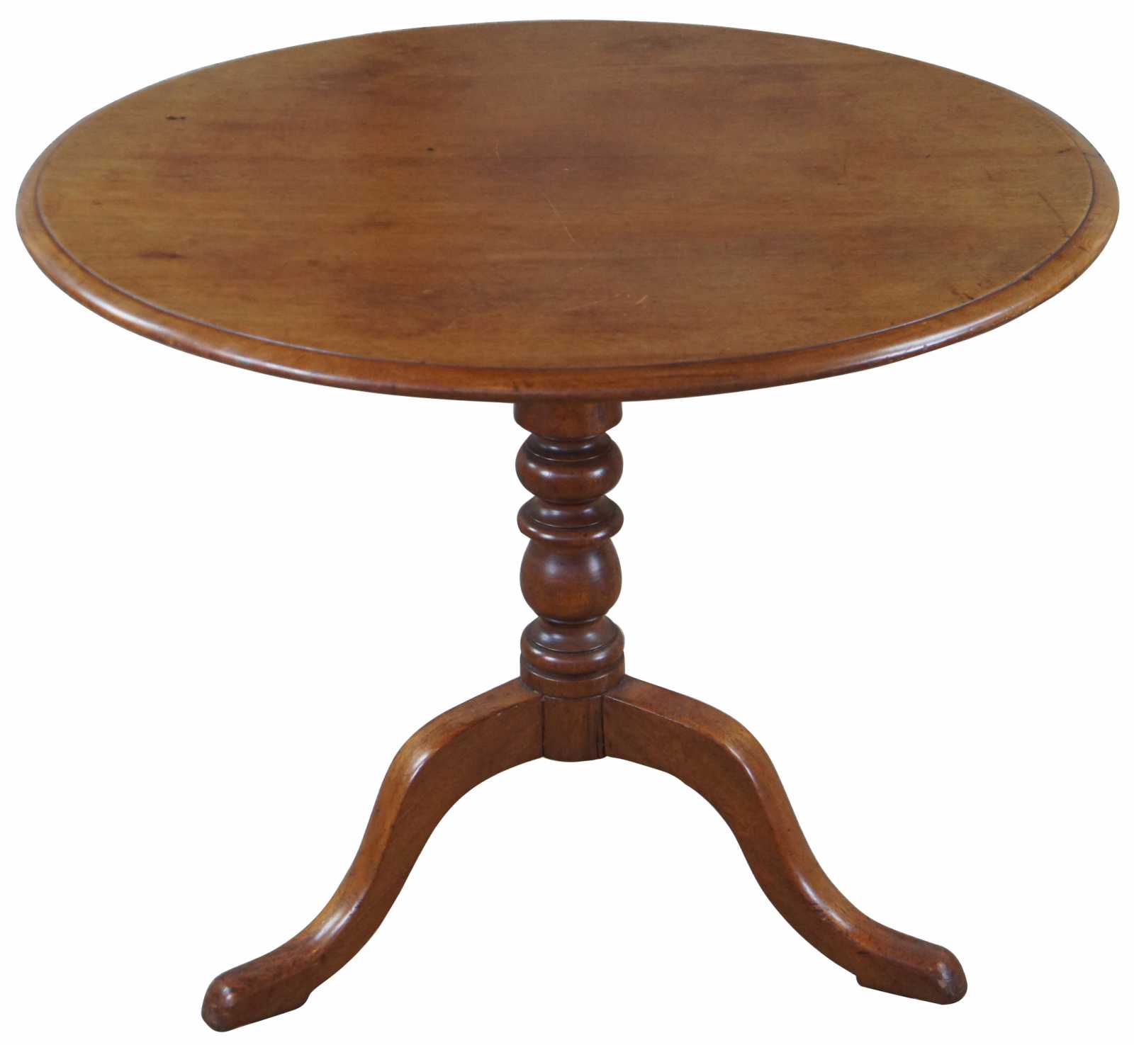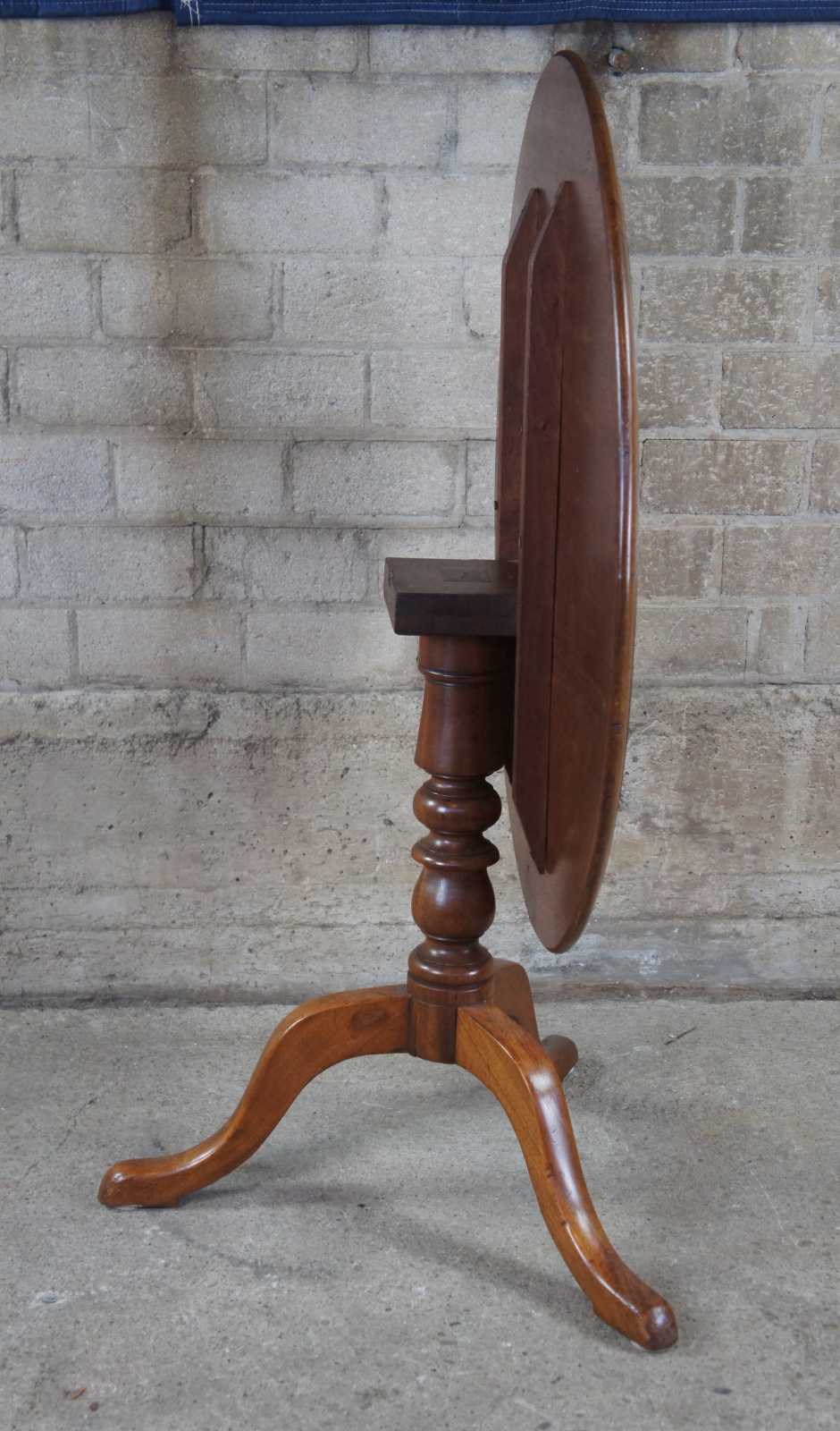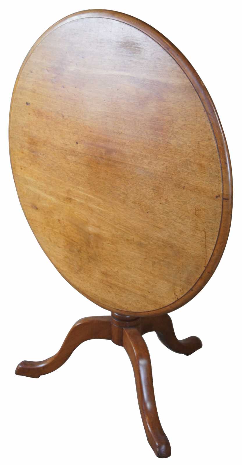 Early 20th century round tilt top table in the manner of Queen Anne or Georgian Styling. Made of mahogany, featuring a tri leg pedestal base and turned baluster support.