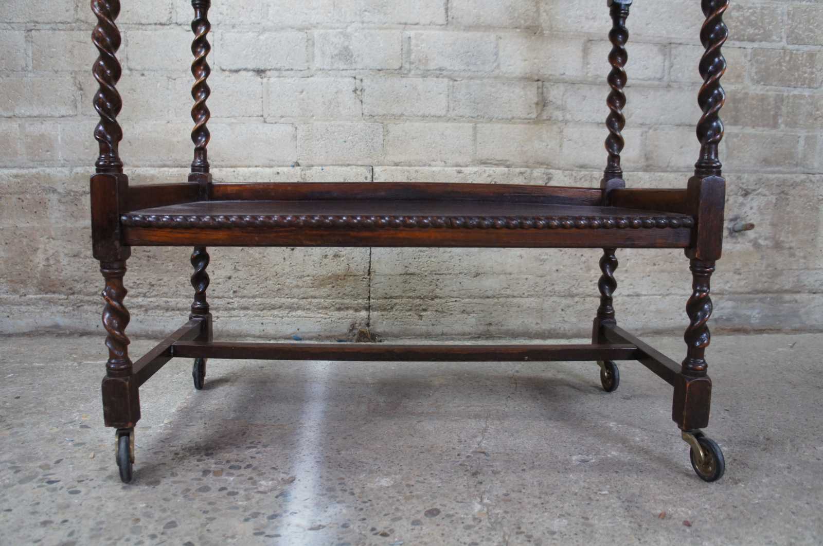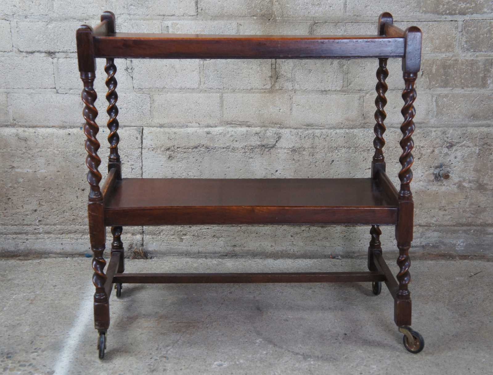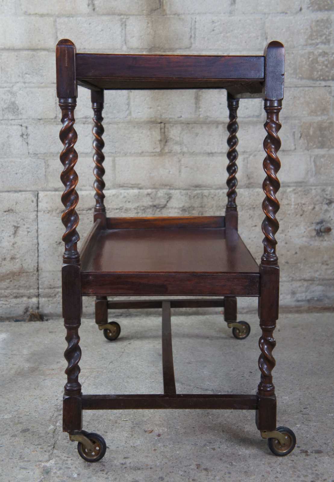 Antique 19th Century English tea / drink / bar cart. Made of quartersawn oak featuring barley twisted supports connecting two tiers with three sided gallery, gadrooning apron, trestle base and large rolling casters / wheels.