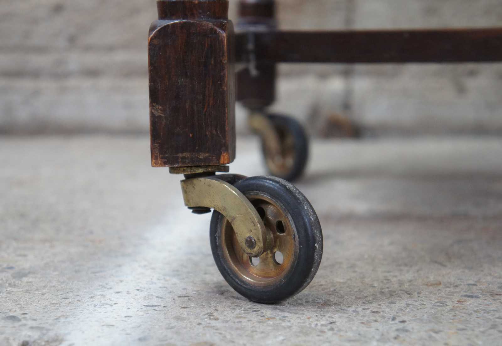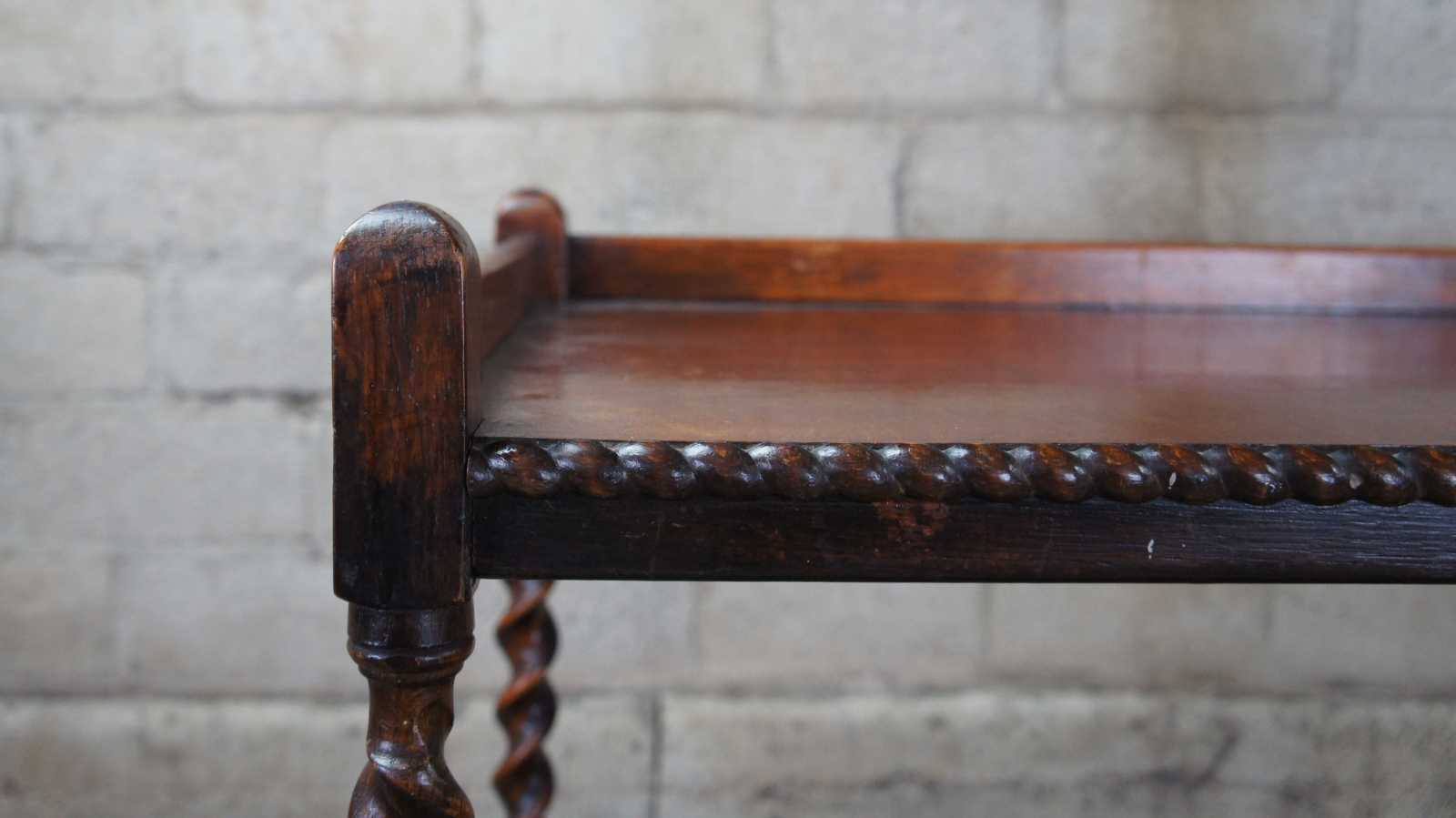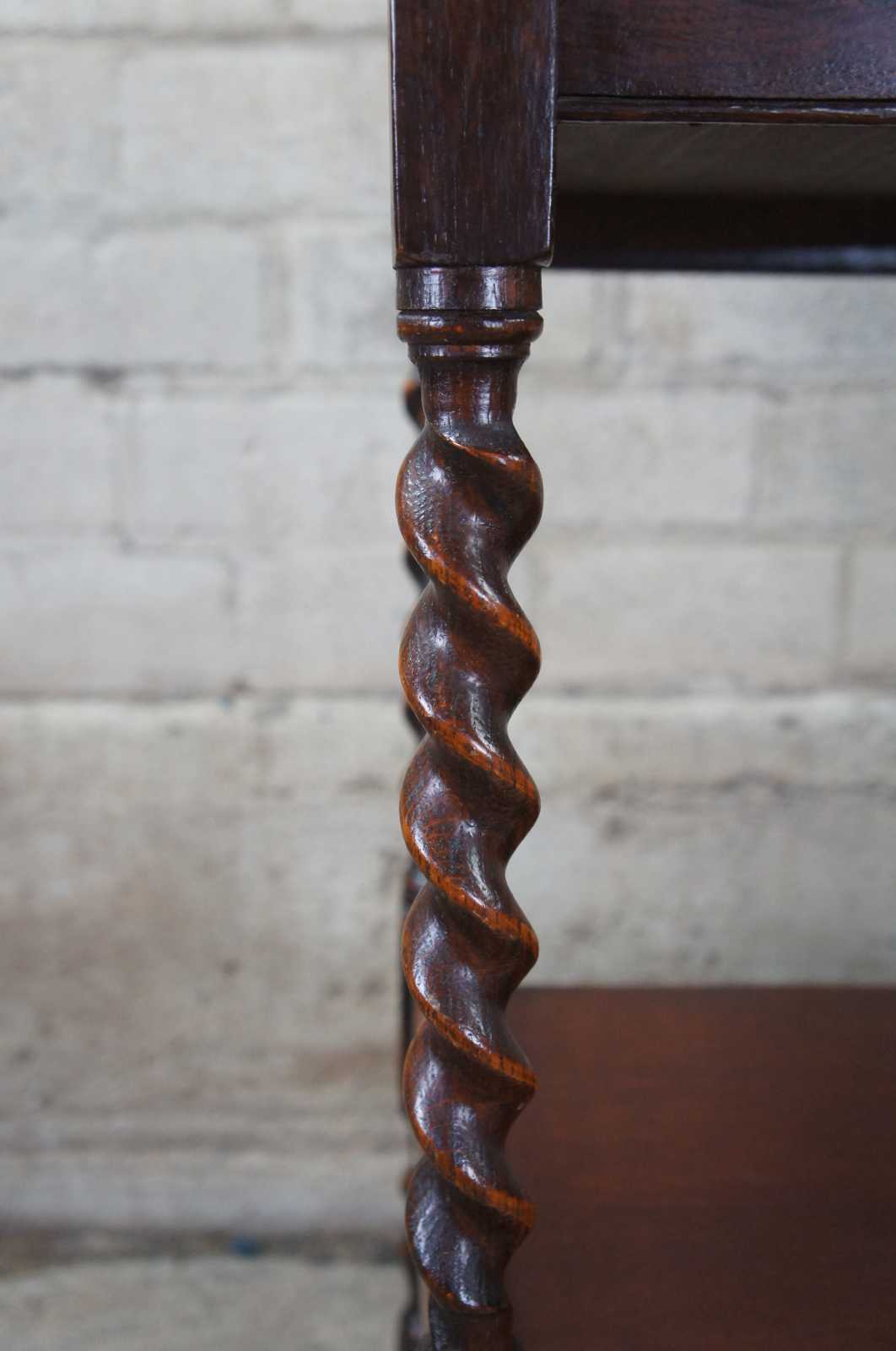 Antique 19th Century English tea / drink / bar cart. Made of quartersawn oak featuring barley twisted supports connecting two tiers with three sided gallery, gadrooning apron, trestle base and large rolling casters / wheels.