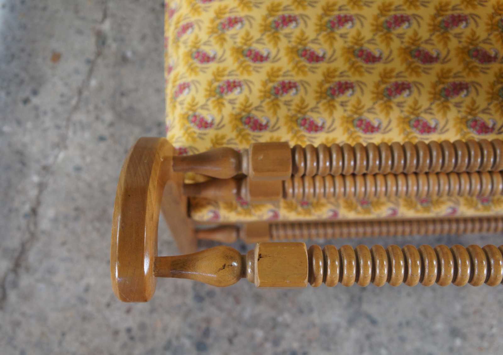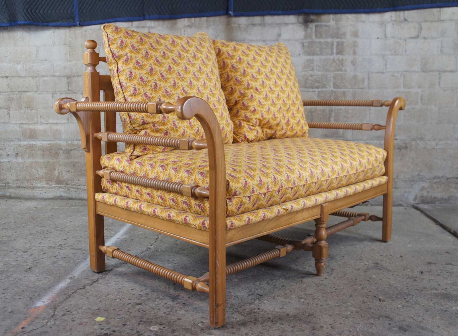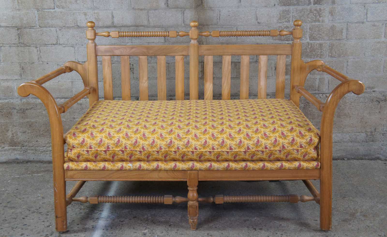 Vintage Flair Furniture Settee or love seat. Made of pine with spool turned / ribbed design. Finished in French Pierre Deux yellow paisley fabric.
