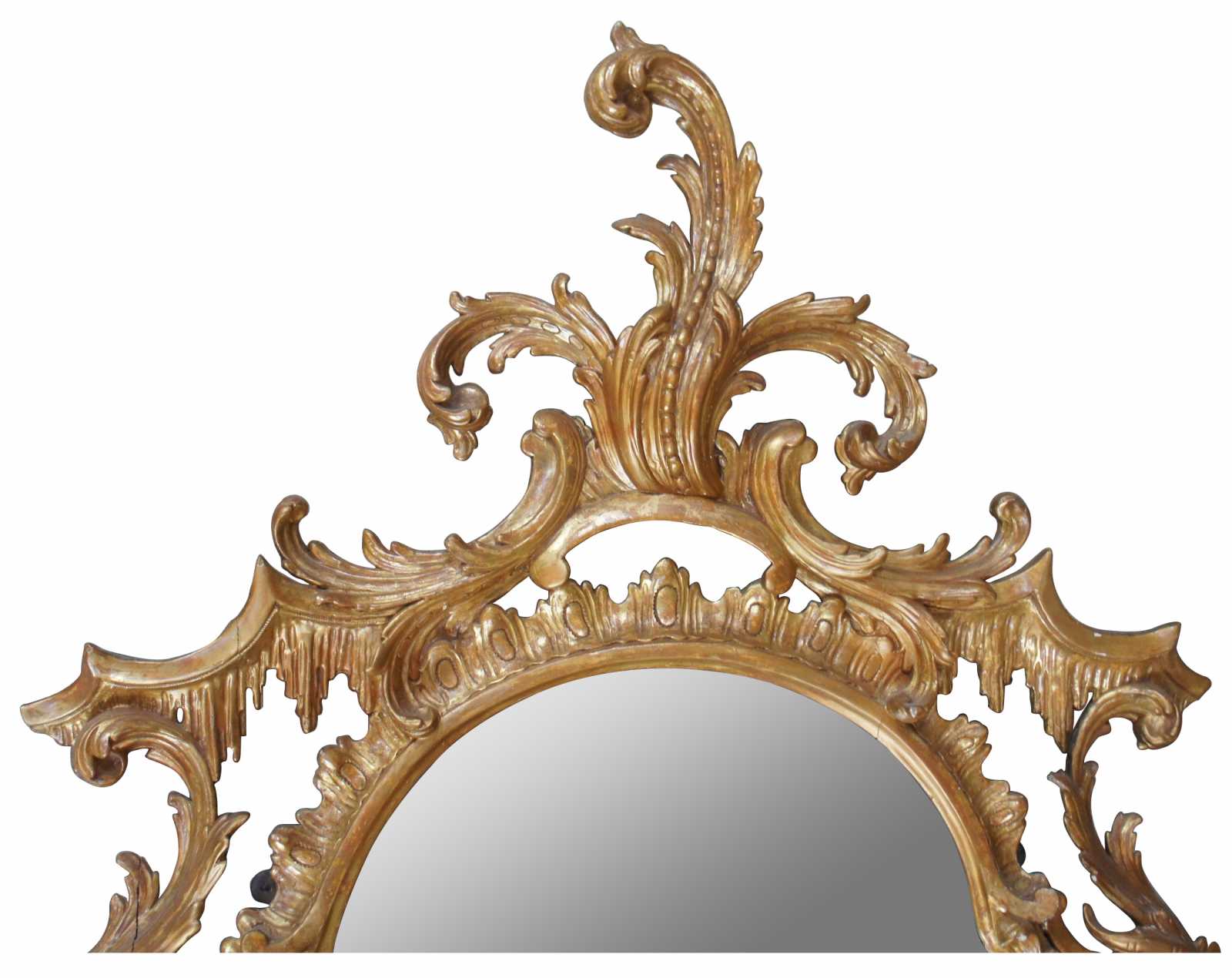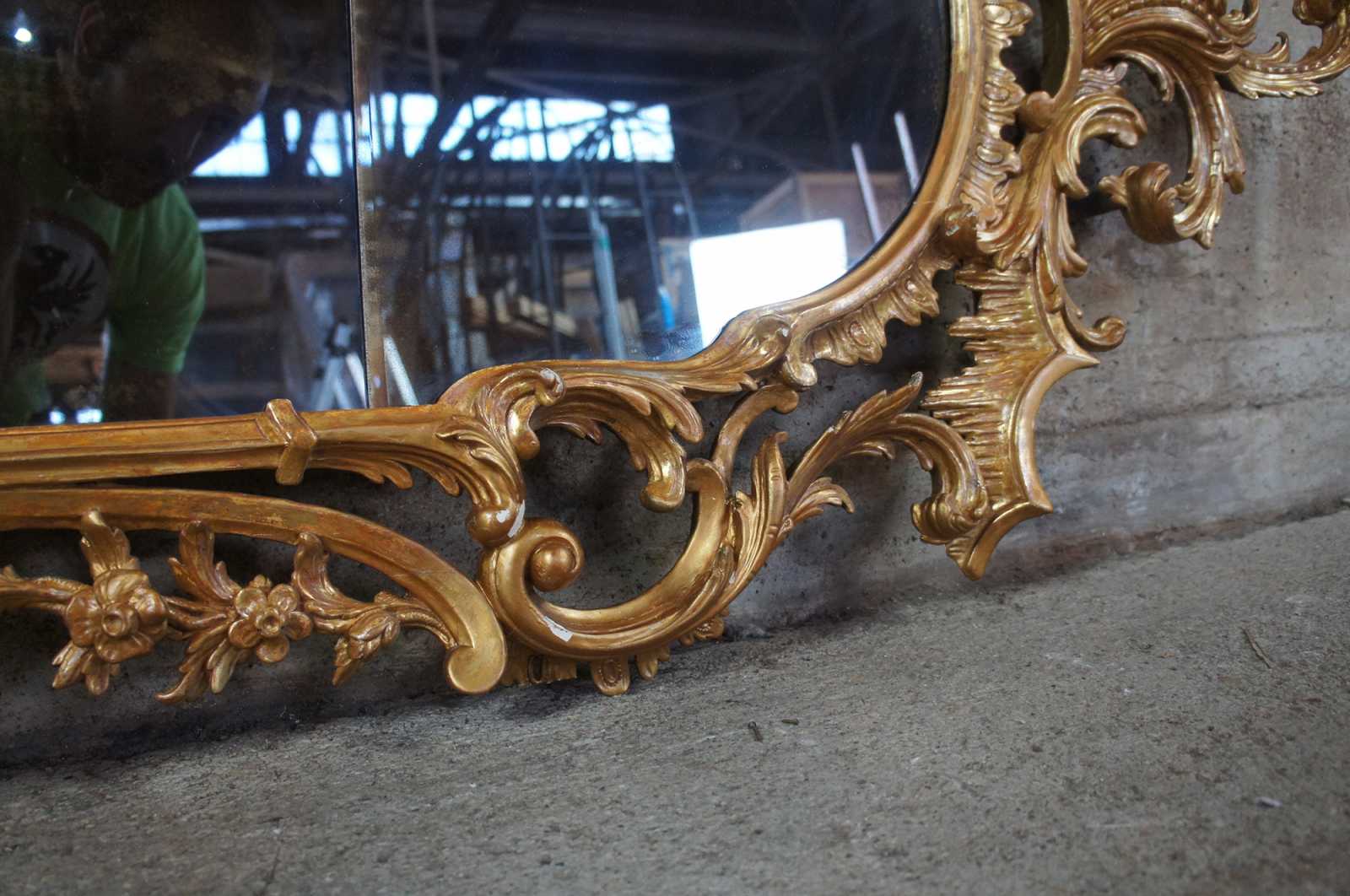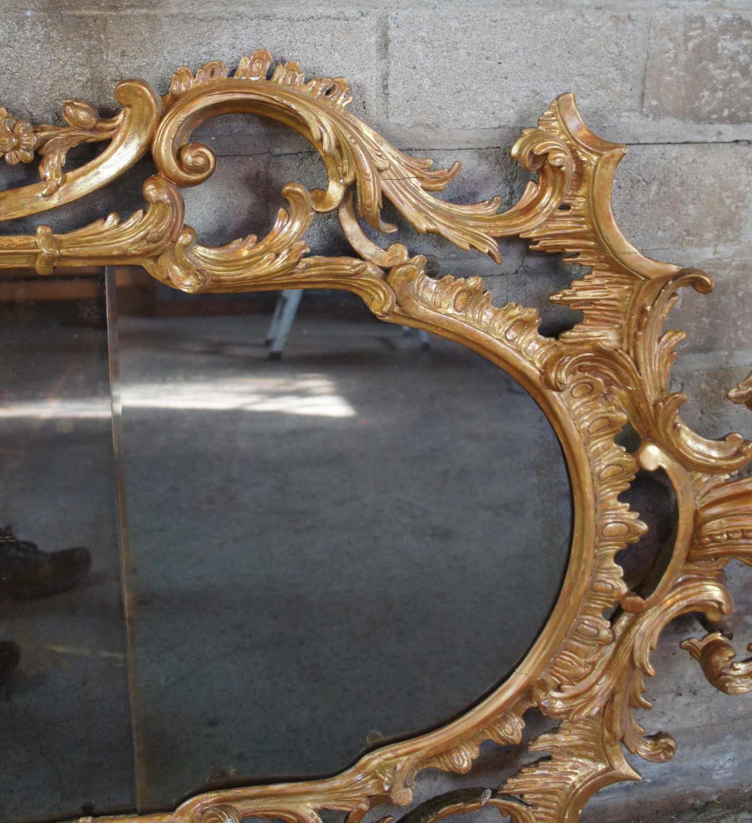 Antique George III giltwood mirror, circa second half of 18th century. Features ornate carvings with scrolling rococo and foliate decoration with segmented plate.