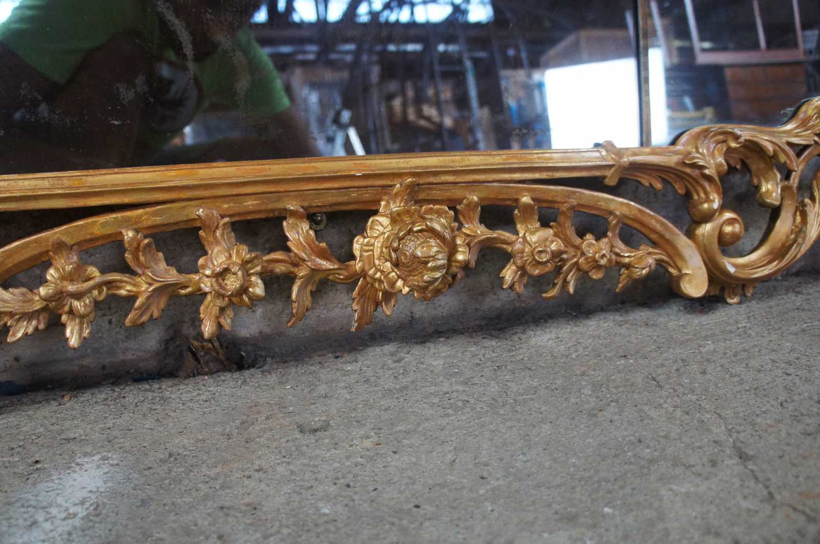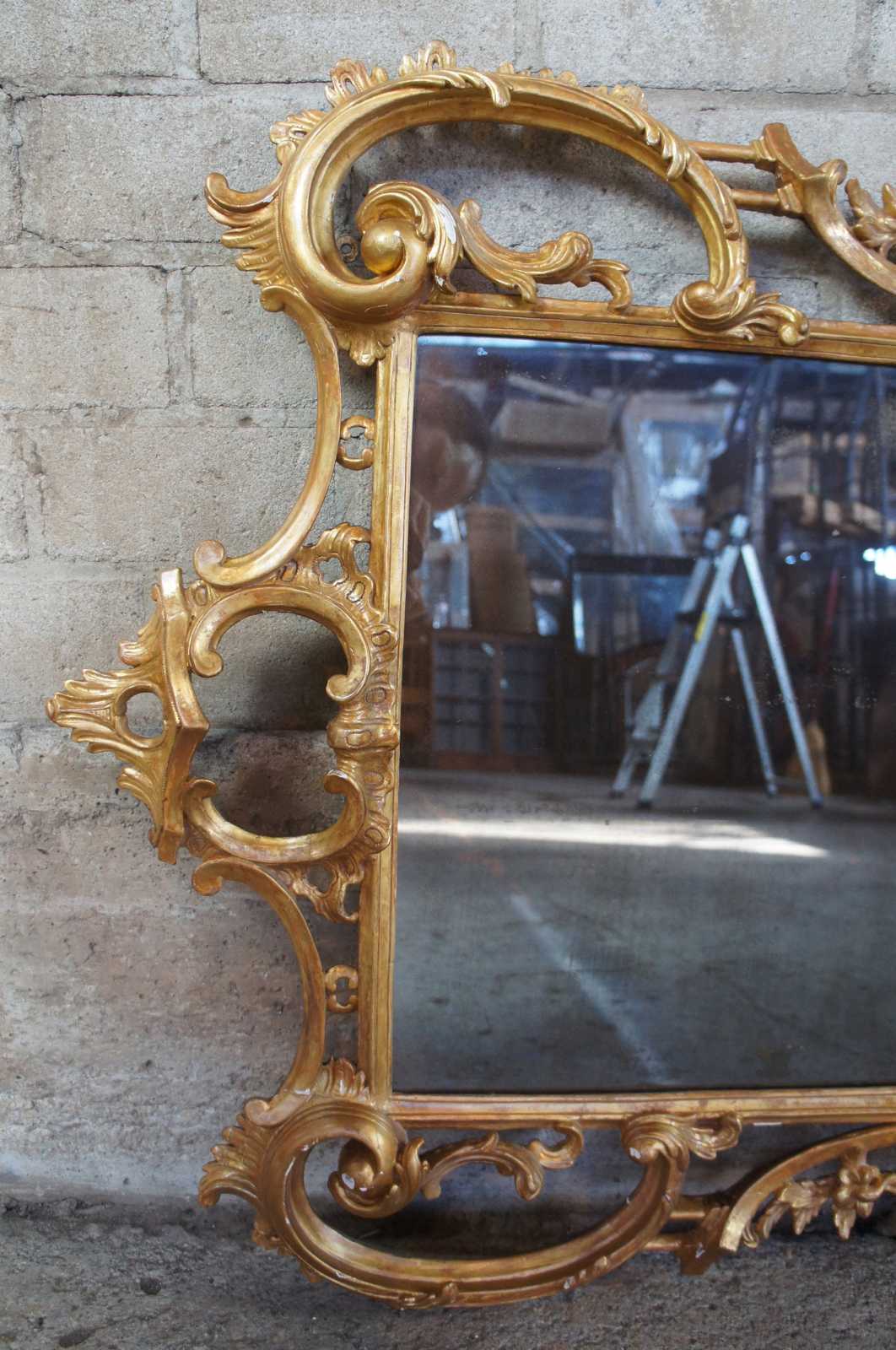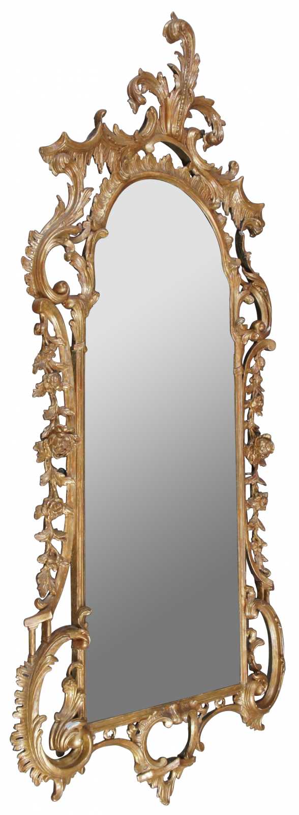 Antique George III giltwood mirror, circa second half of 18th century. Features ornate carvings with scrolling rococo and foliate decoration with segmented plate.