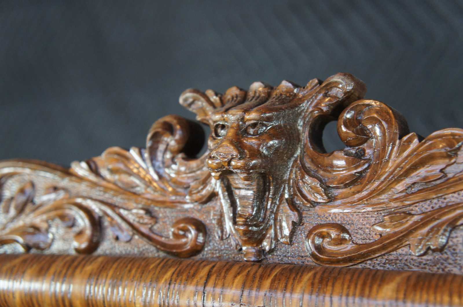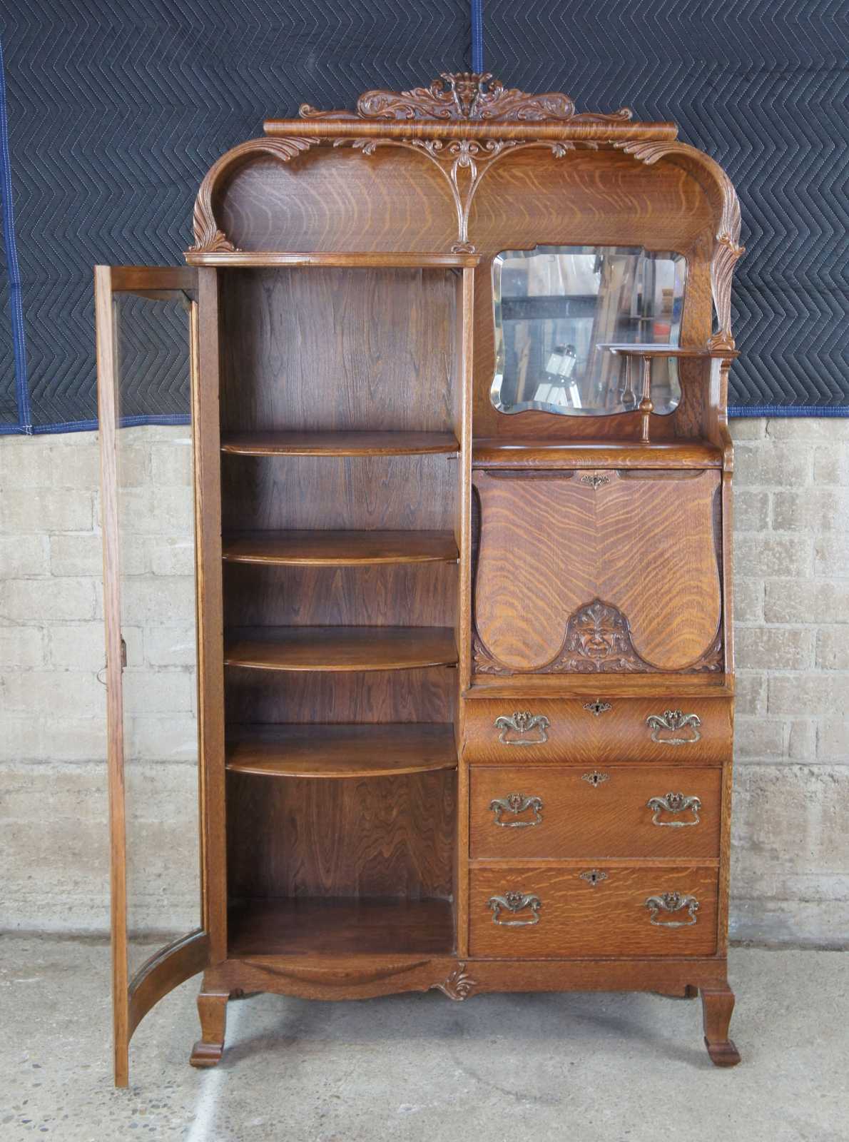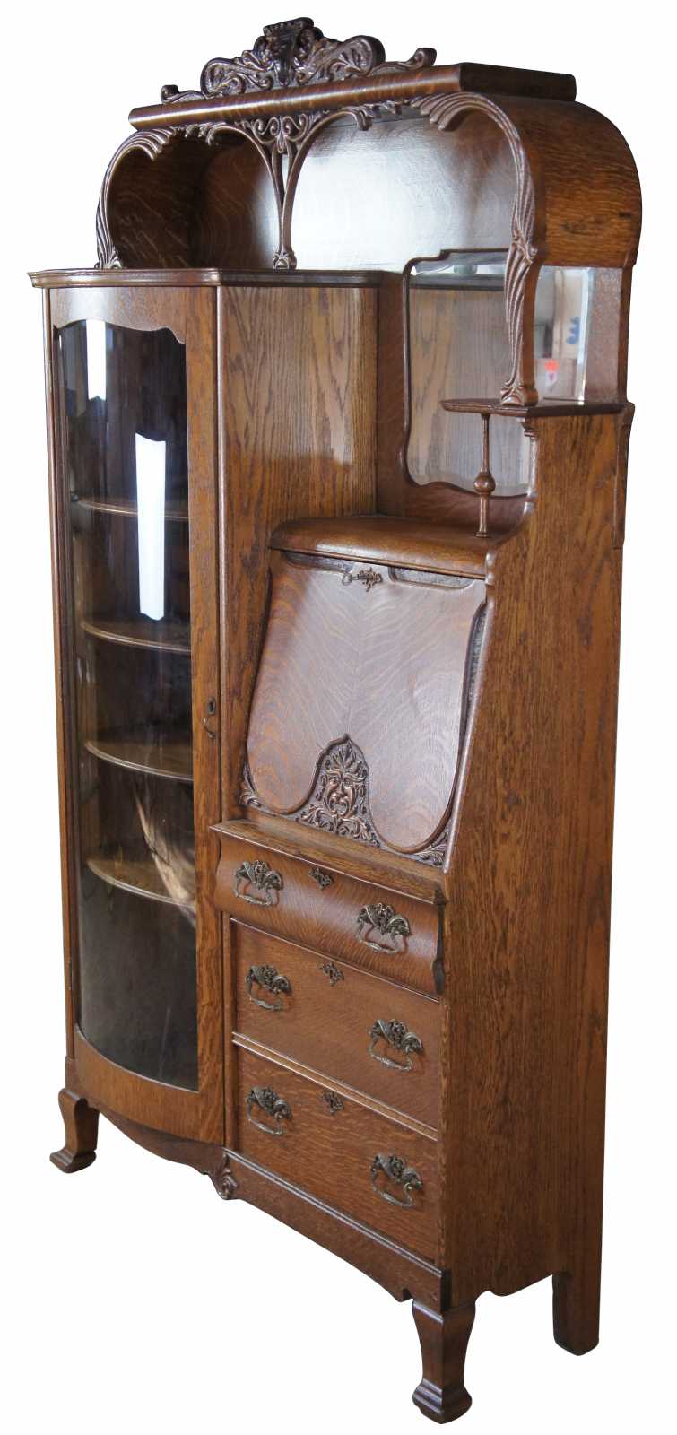 Monumental antique Victorian side by side secretary desk and curio bookcase, circa 1900s. Made of quartersawn or "tiger" oak featuring an arched arcade with intricate carvings and a gargoyles / lions topper. The body of the cabinet includes a curved glass bookcase and drop front secretary with northwind face. Secretary opens to a clean writing surface, drawers and cubbies. Includes three lower drawers for storage with ornate brass hardware. The cabinet is supported by four legs with flared front feet.
