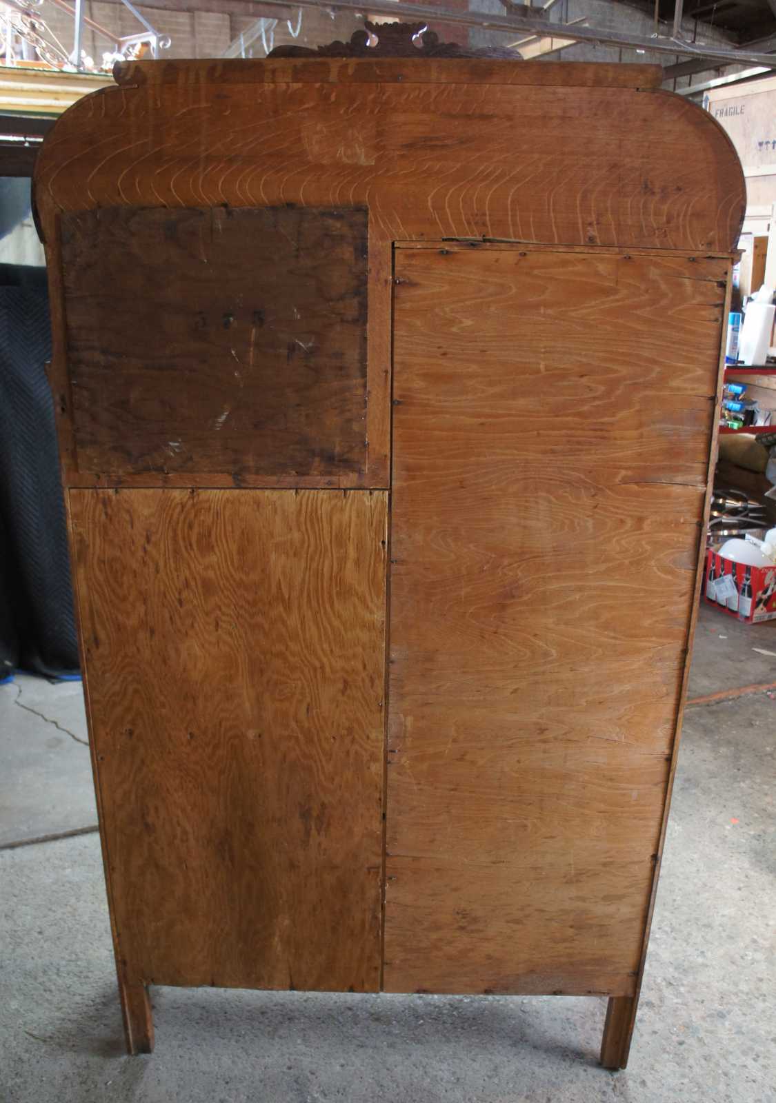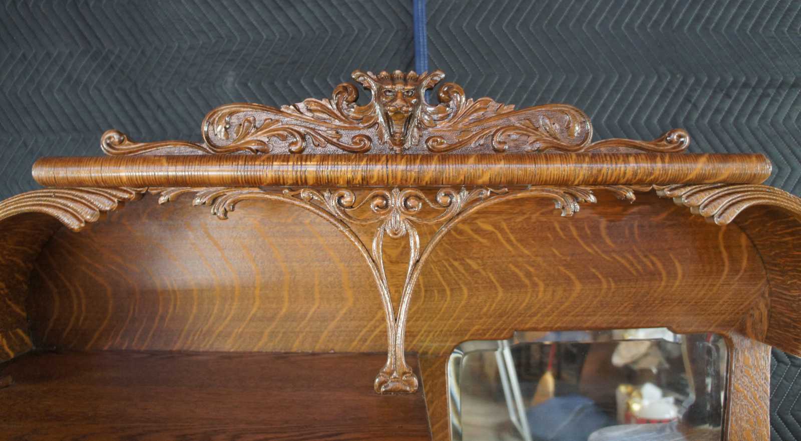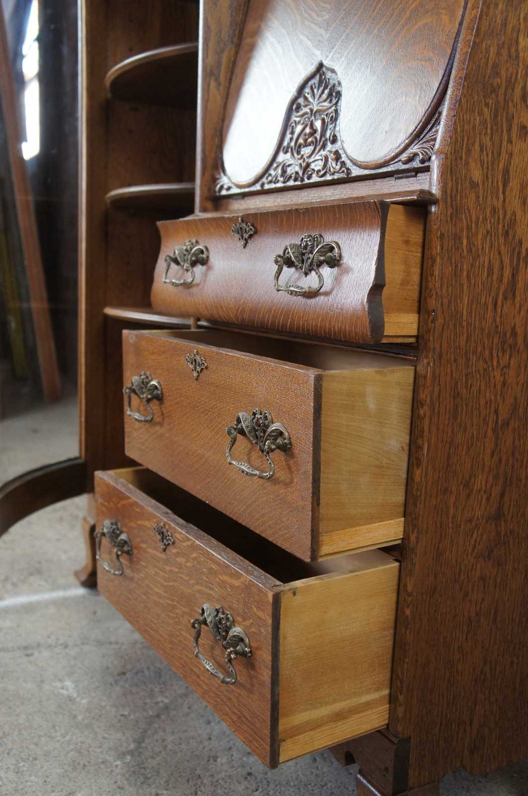 Monumental antique Victorian side by side secretary desk and curio bookcase, circa 1900s. Made of quartersawn or "tiger" oak featuring an arched arcade with intricate carvings and a gargoyles / lions topper. The body of the cabinet includes a curved glass bookcase and drop front secretary with northwind face. Secretary opens to a clean writing surface, drawers and cubbies. Includes three lower drawers for storage with ornate brass hardware. The cabinet is supported by four legs with flared front feet.