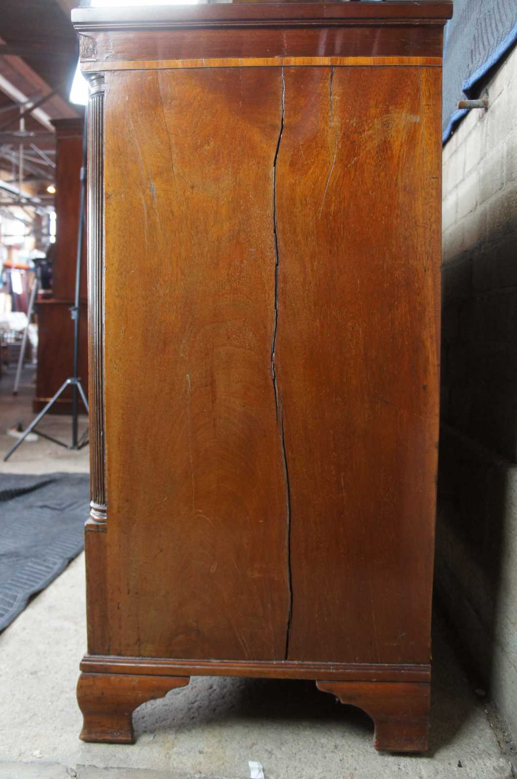 Circa 1850s English mahogany rectangular form "Two over Three" chest of drawers. A remarkable design with banding, quarter cut reeded columns over inlay and brass lion head pulls. the chest is supported by bracket feet.