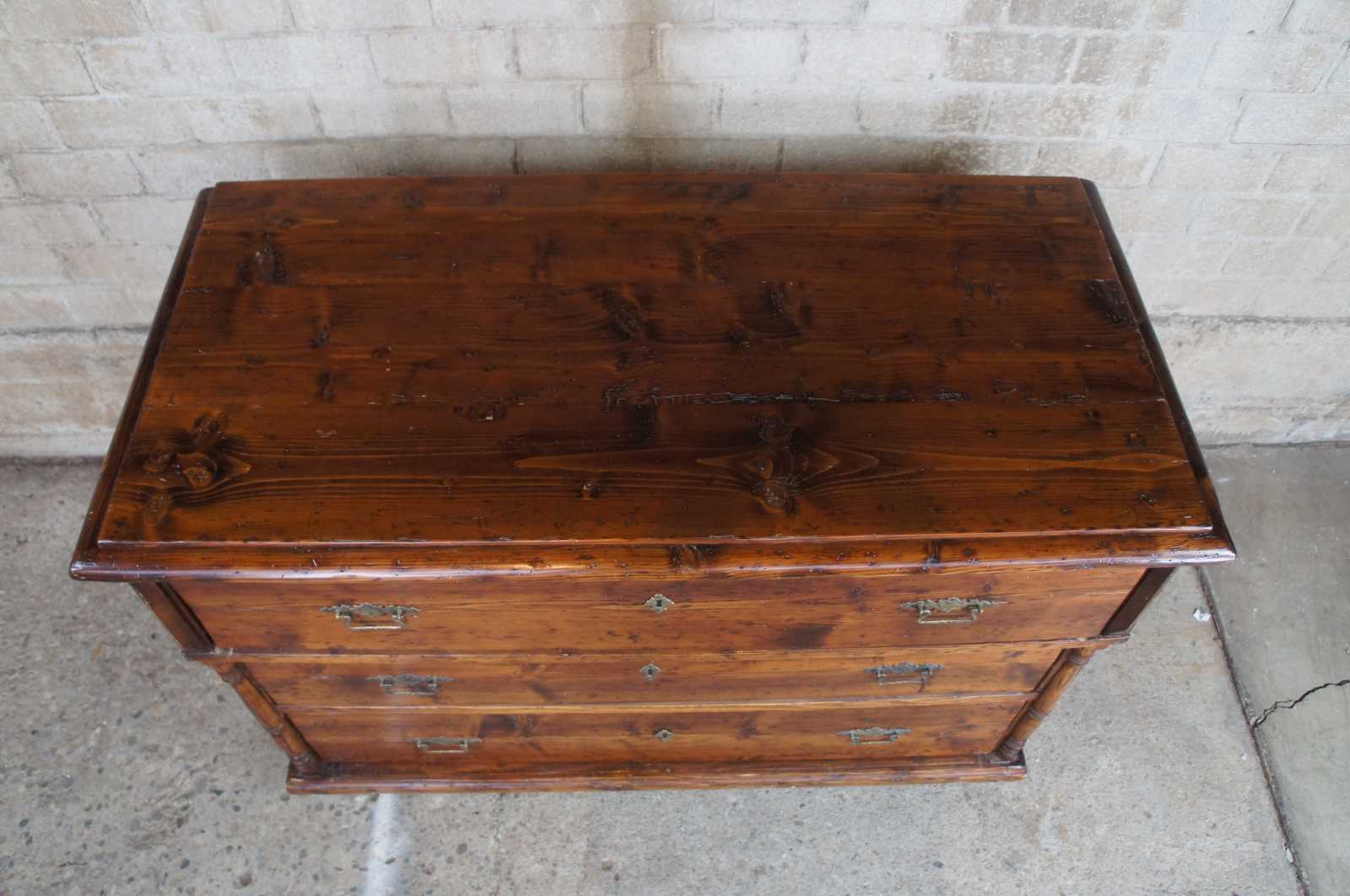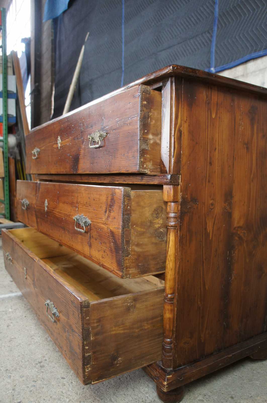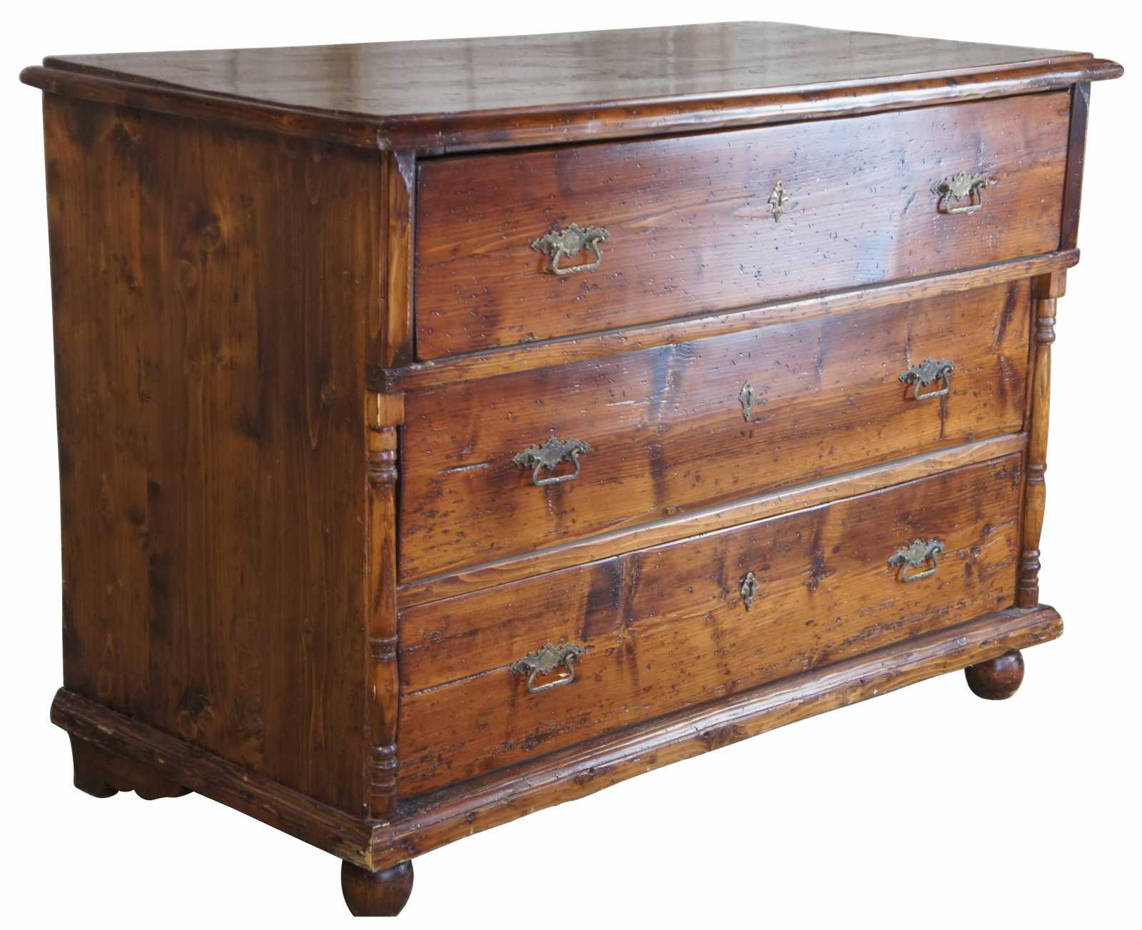 Early 20th century pine chest or dresser. Made of pine, featuring three drawers and half turned baluster mounts over bune feet. Naturally distressed with brass hardware