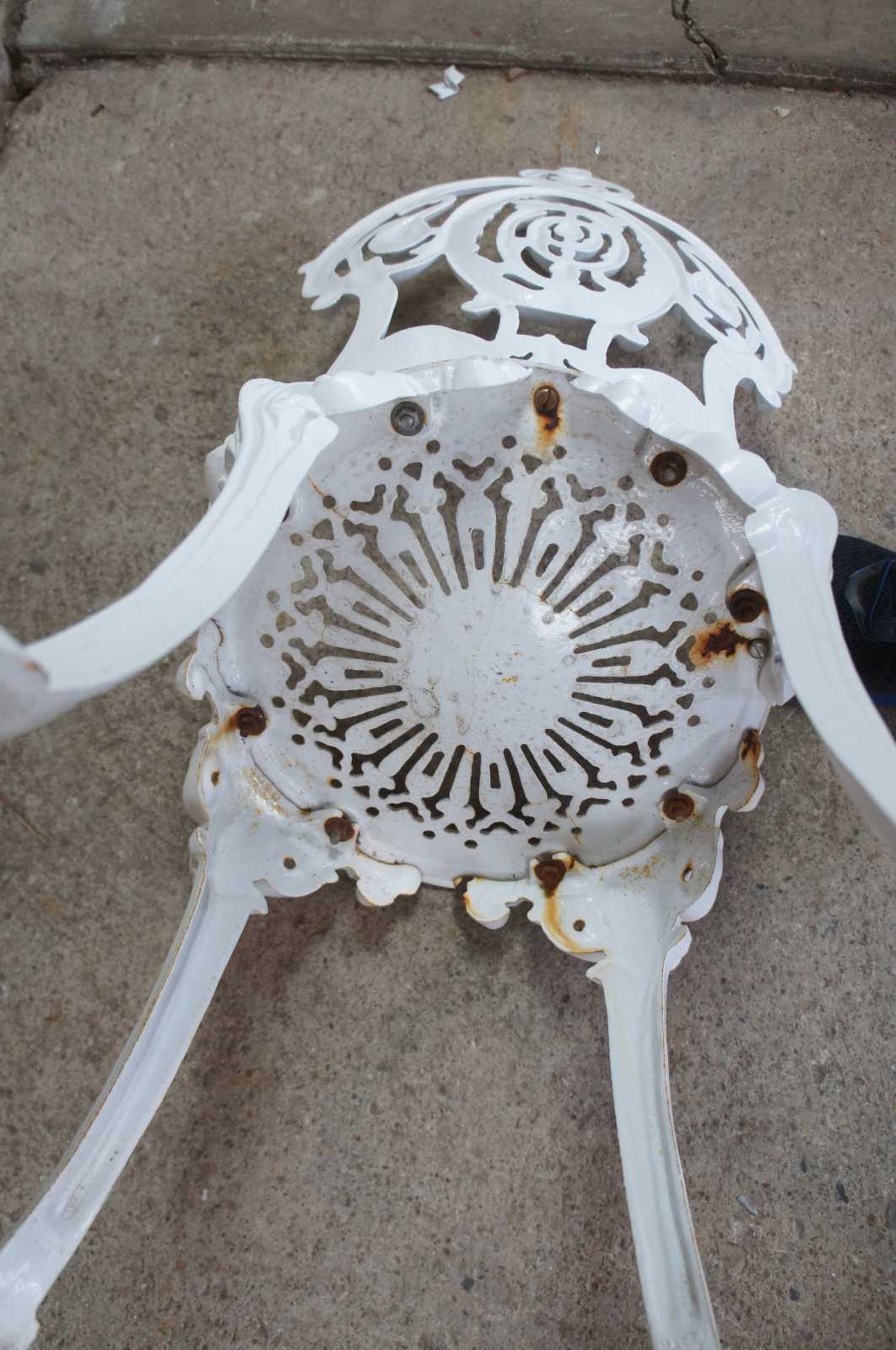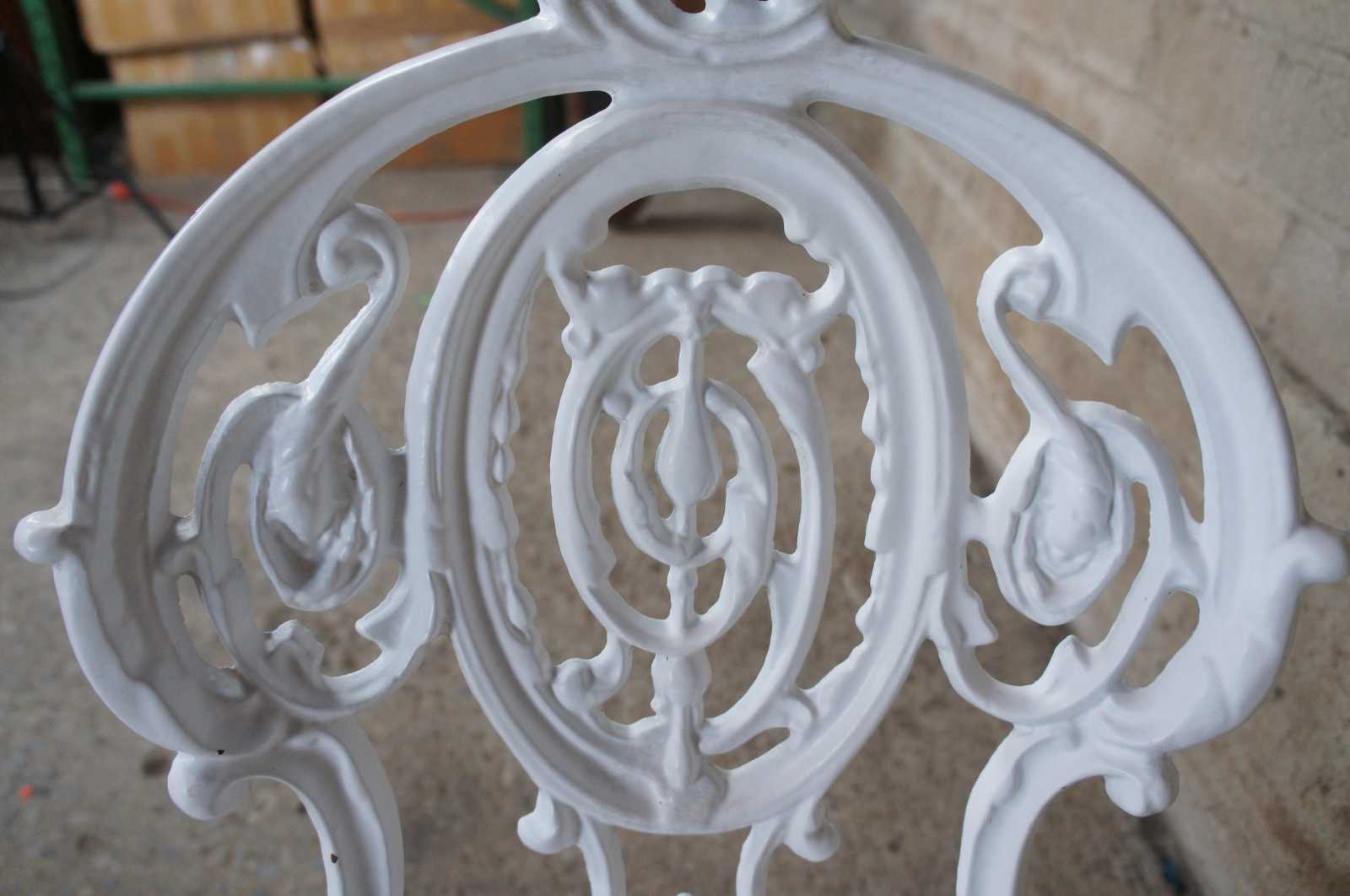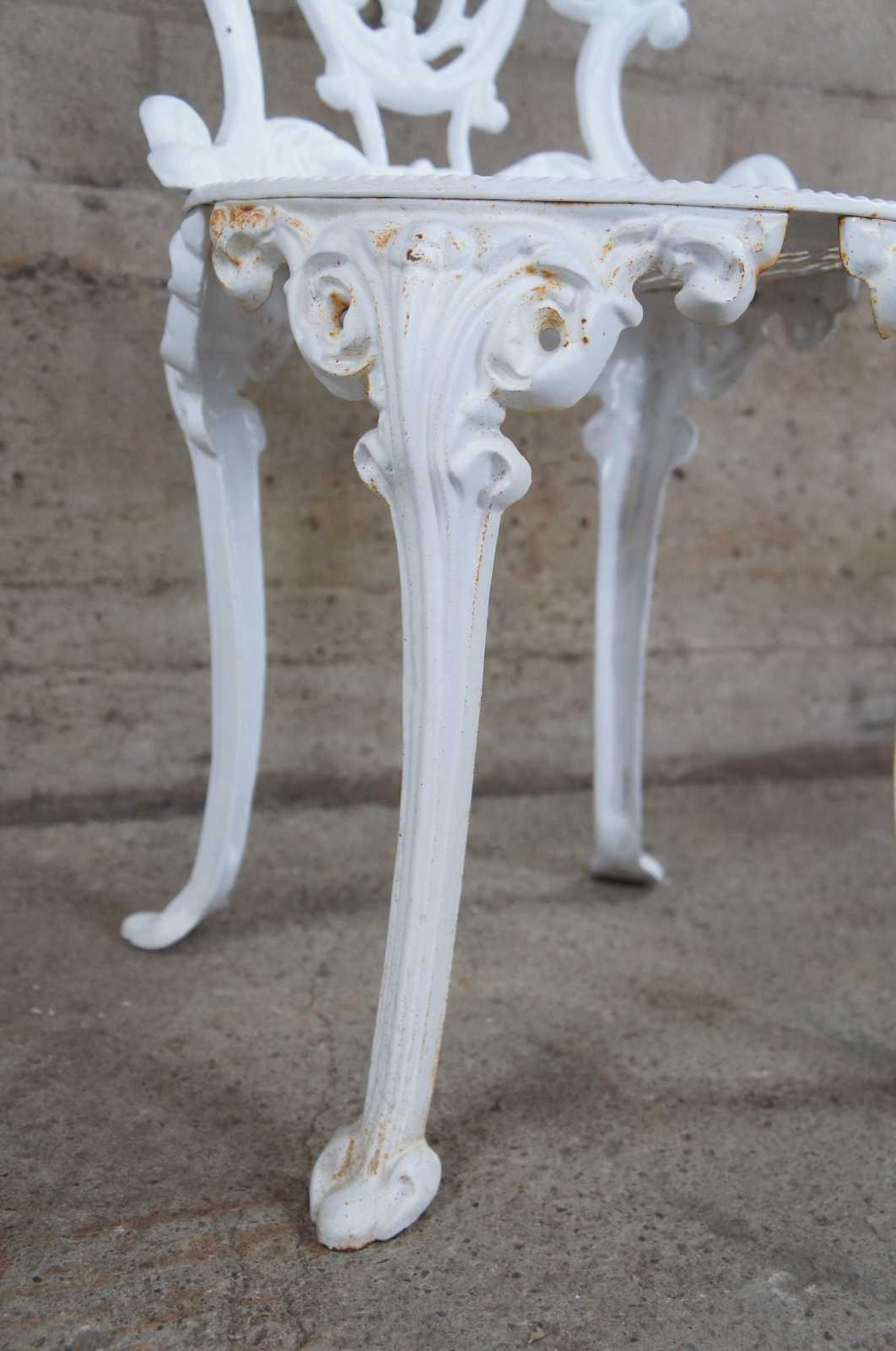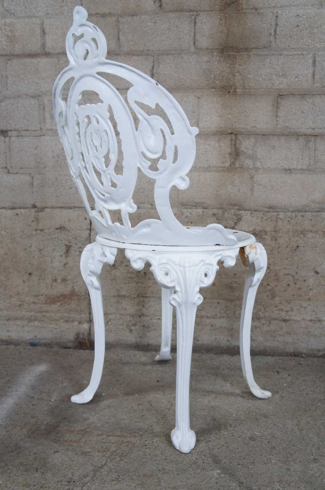 Seven Antique French cast iron patio / garden / bistro chairs. Made of cast iron featuring an ornate design with crest and filigree seat. Very heavy.