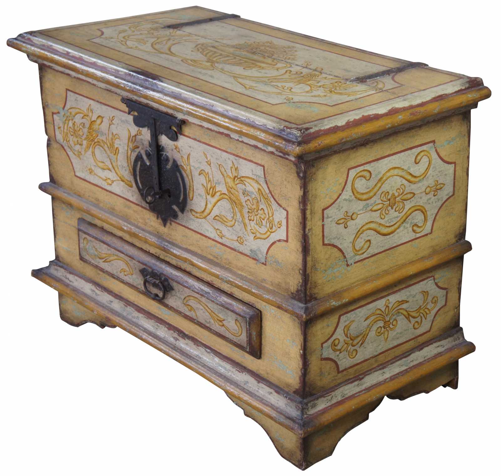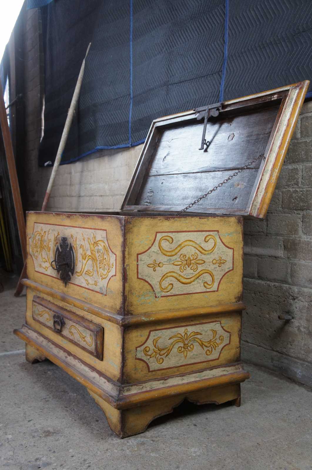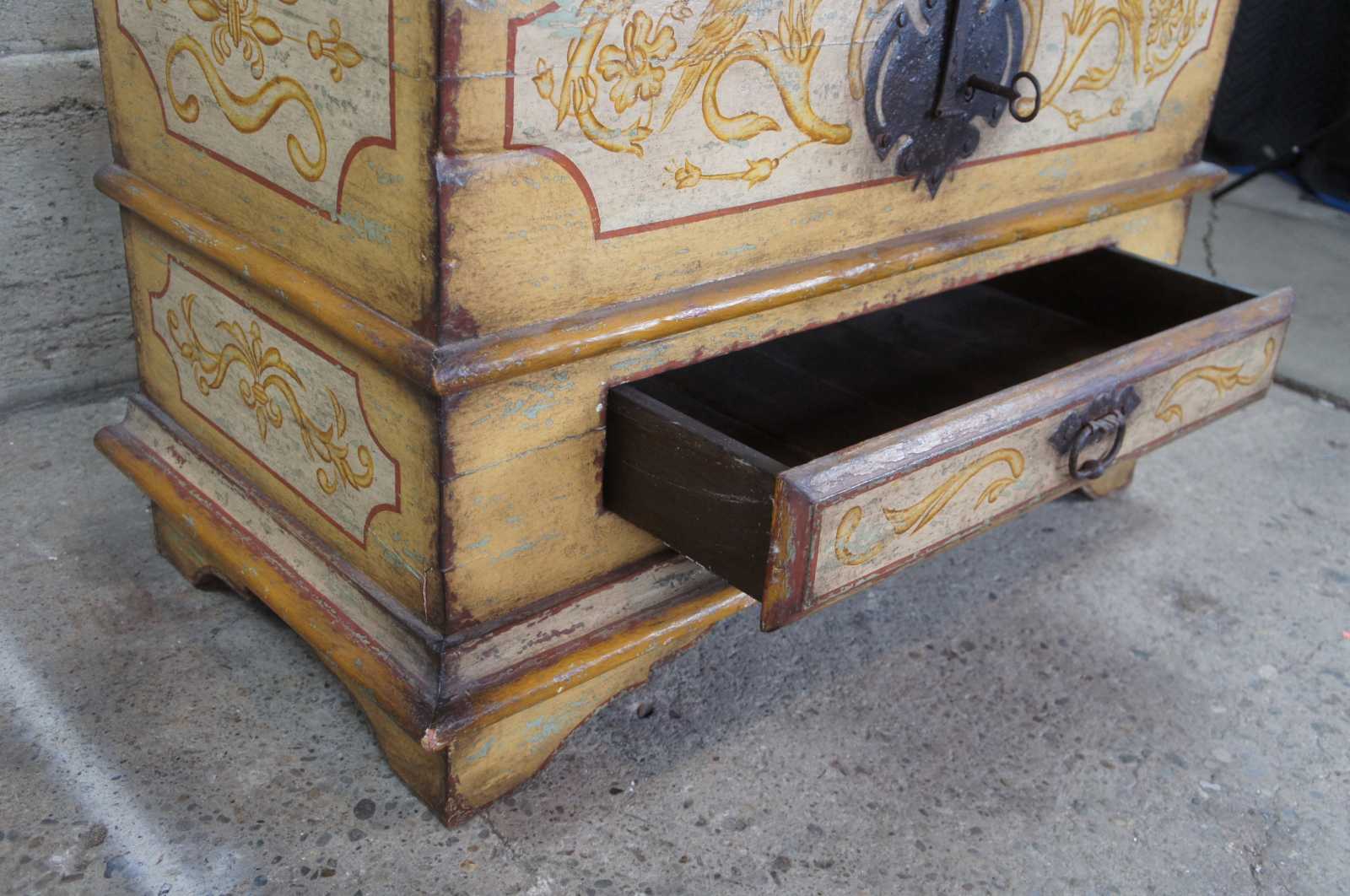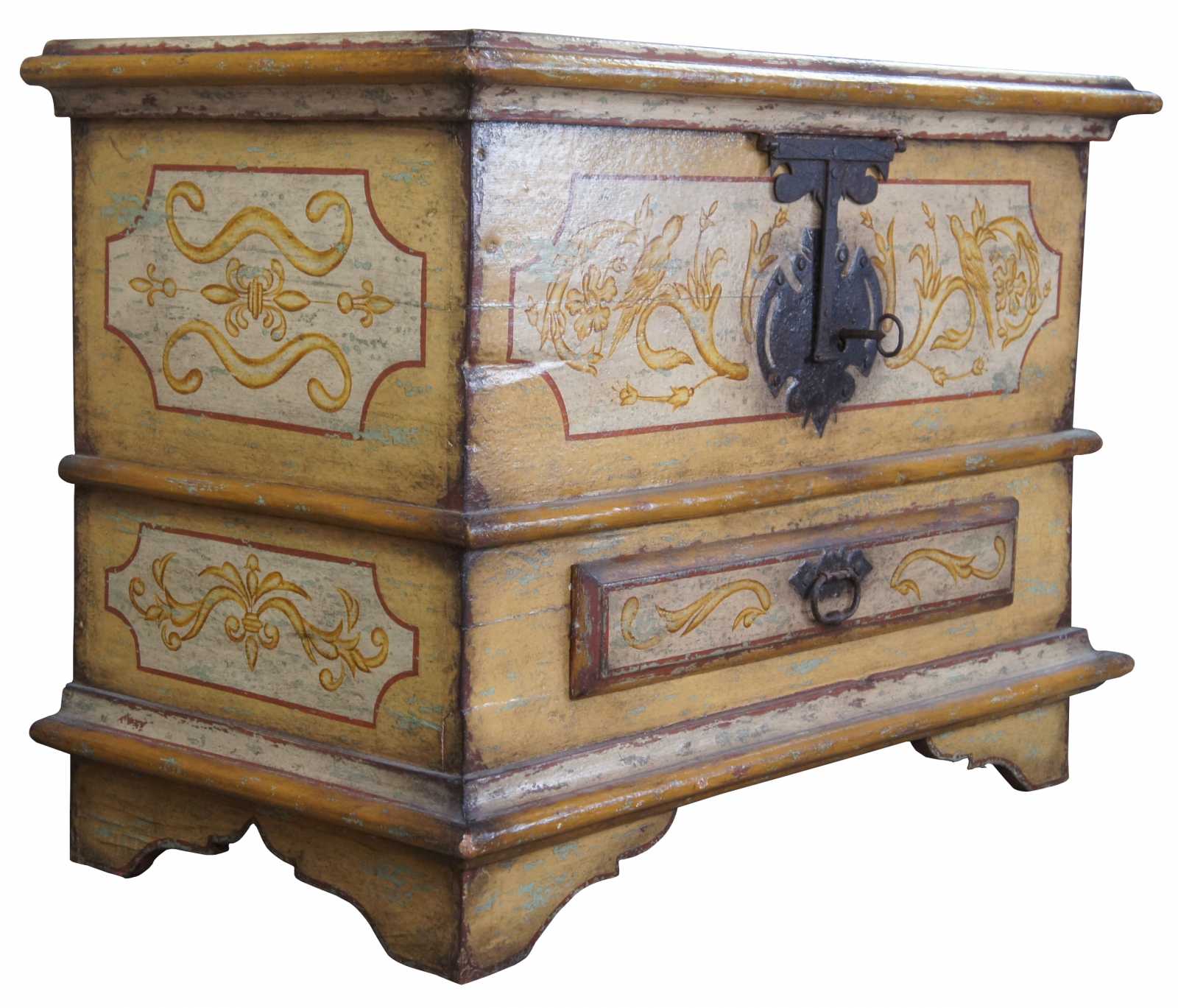 Antique European folk art trunk. Beatufiully painted in yellow with stylized lily or branches and birds. The yellow is over a creme colored back round and framed with a red boarder. Features forged iron hardware, lock and lower drawer for storage.