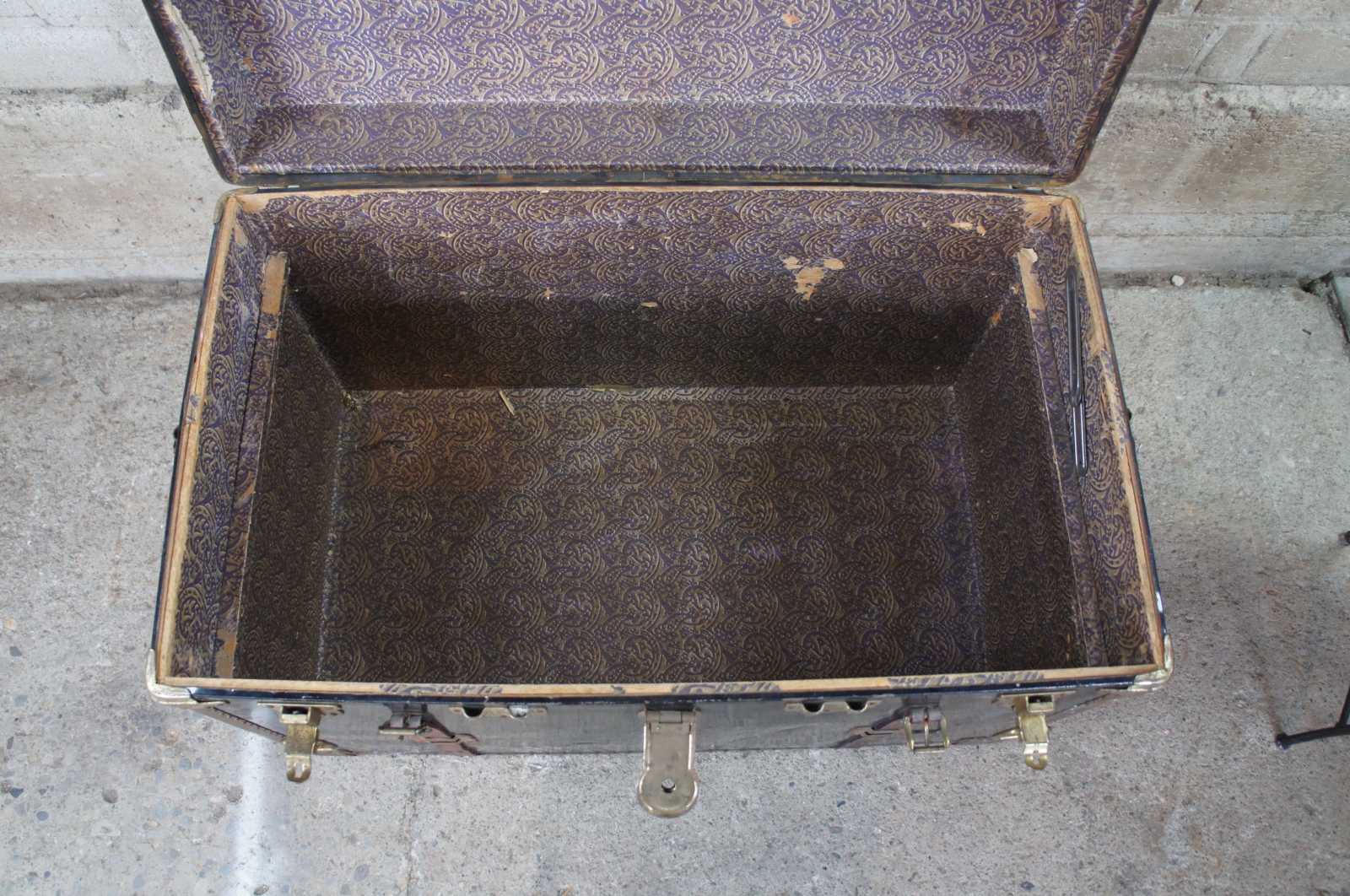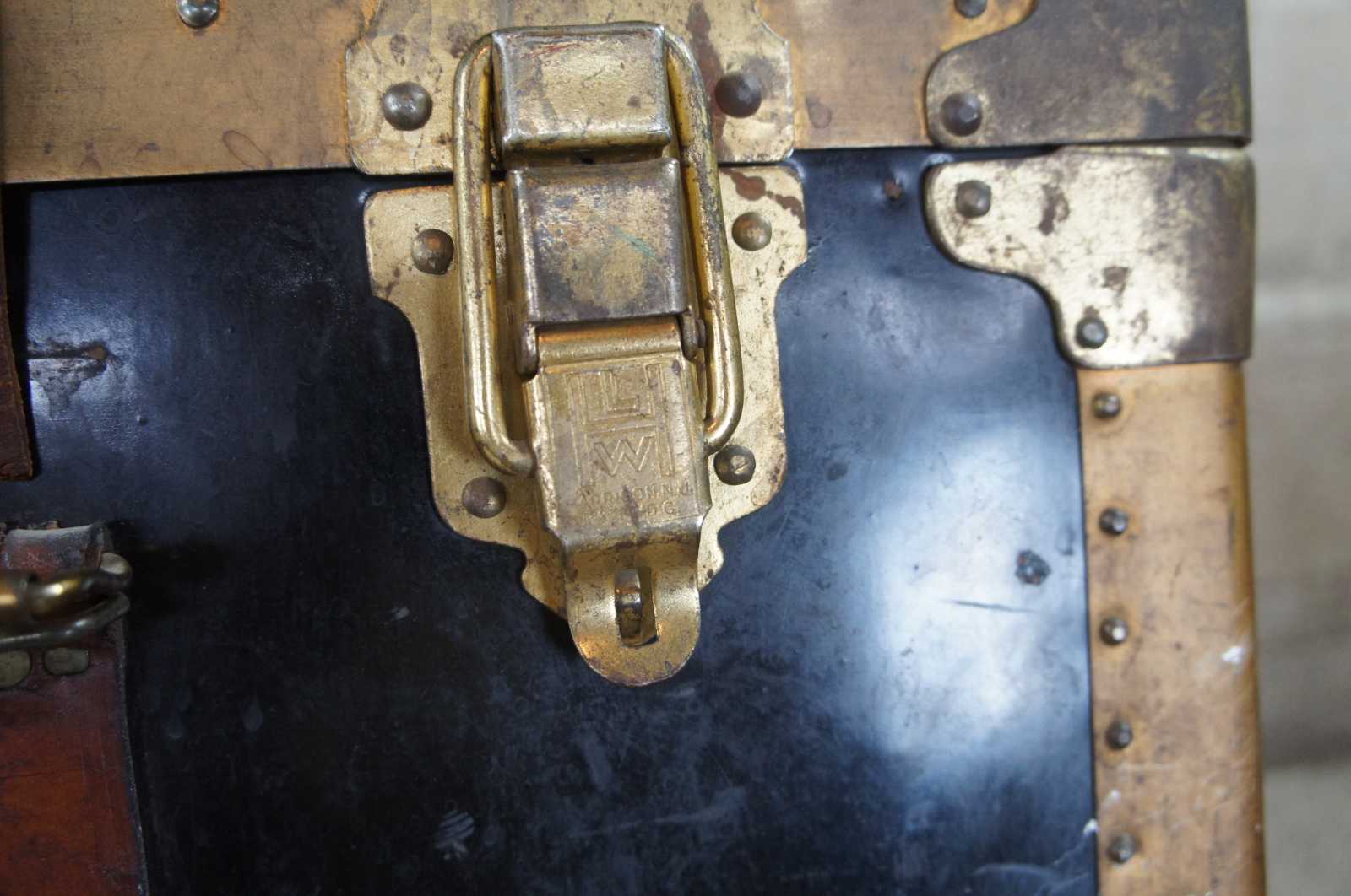 Antique Victorian steamer trunk or chest. Made of metal and brass with nailhead trim and leather straps and handles. Features interior compartment for organizing clothing / accessories.