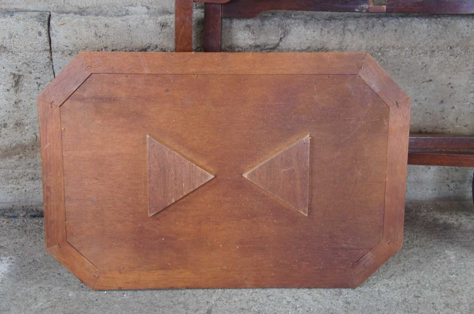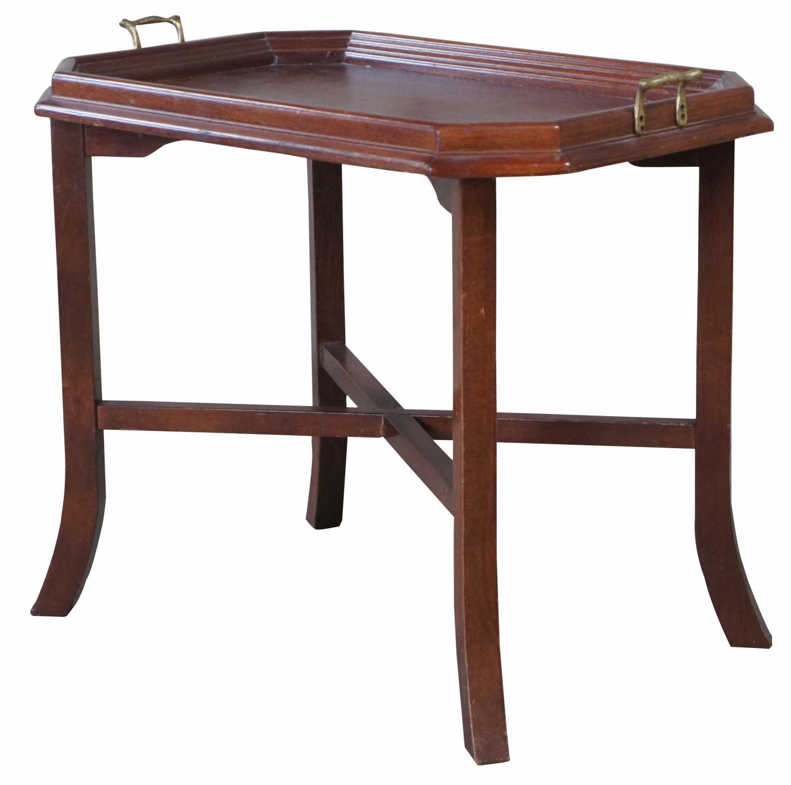 Vintage pine tray table. Features a folding base connected by X stretcher and rectangular octogon shaped top with brass handles.
