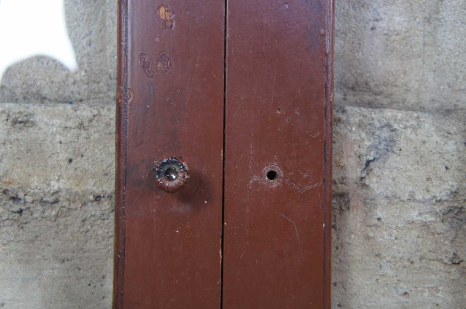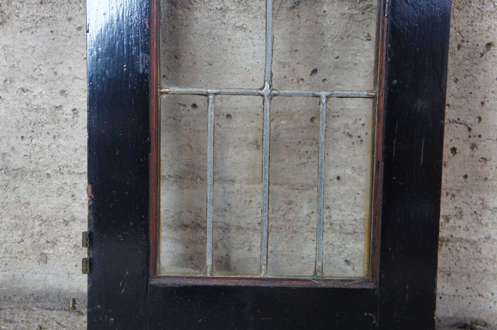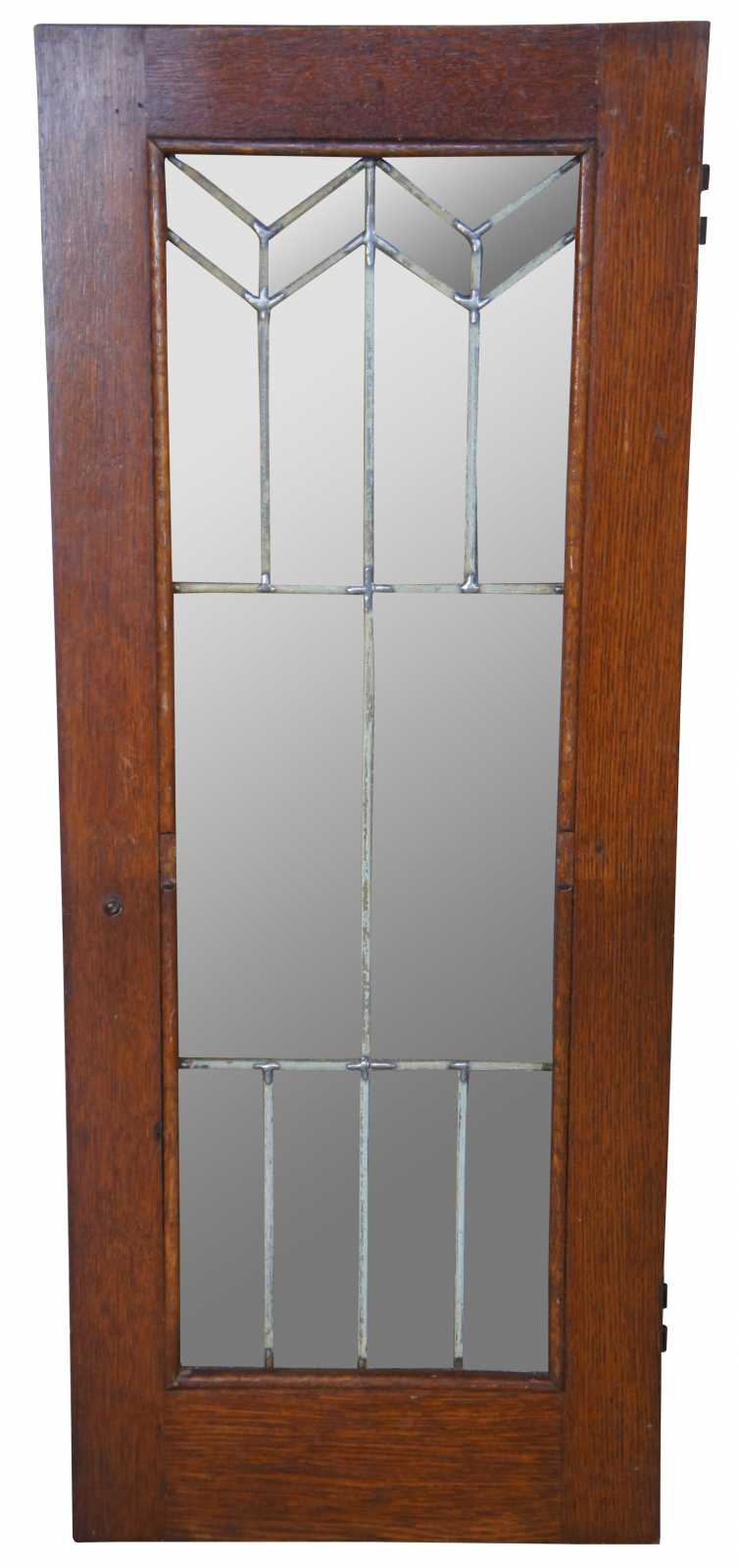 Reclaimed antique oak cabinet doors. Each features a unique leaded glass pattern in chevron design. Three available; sold separately. 2 lefts & a right.