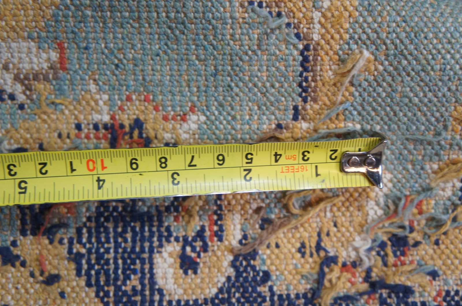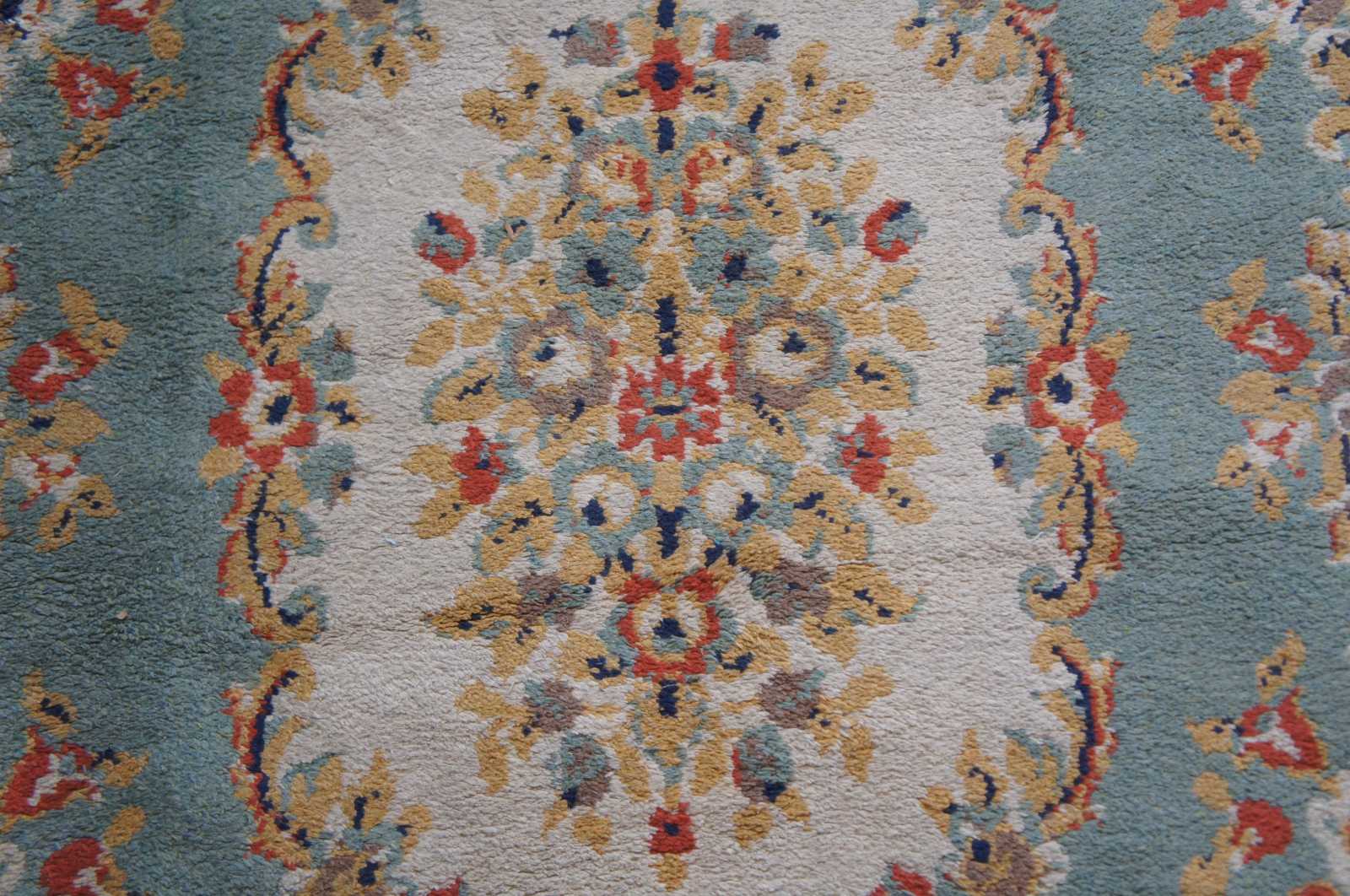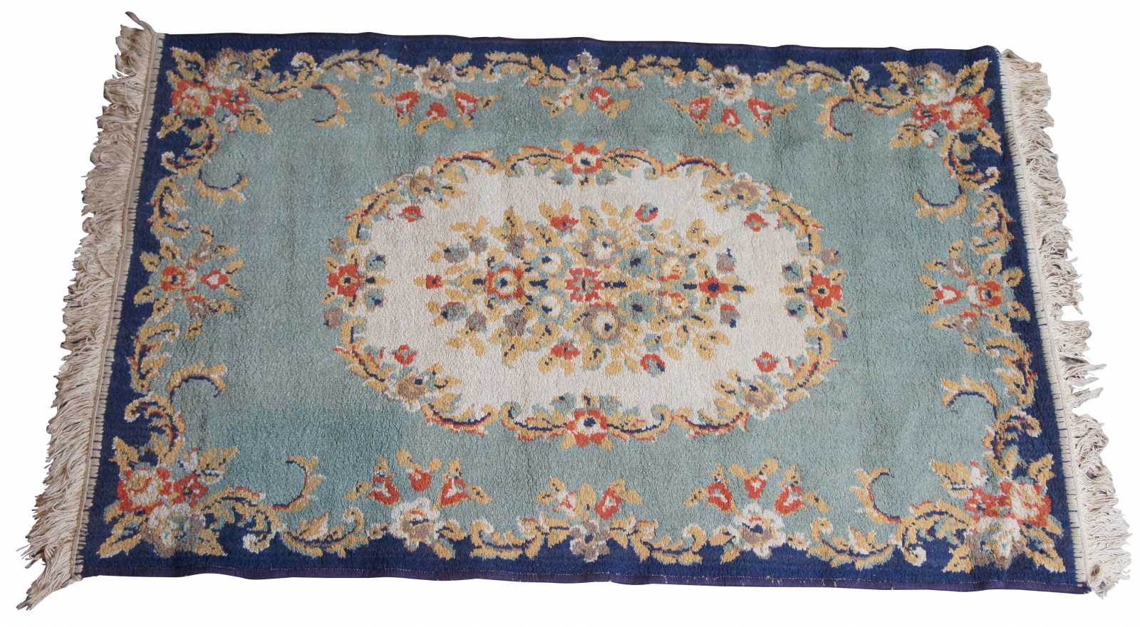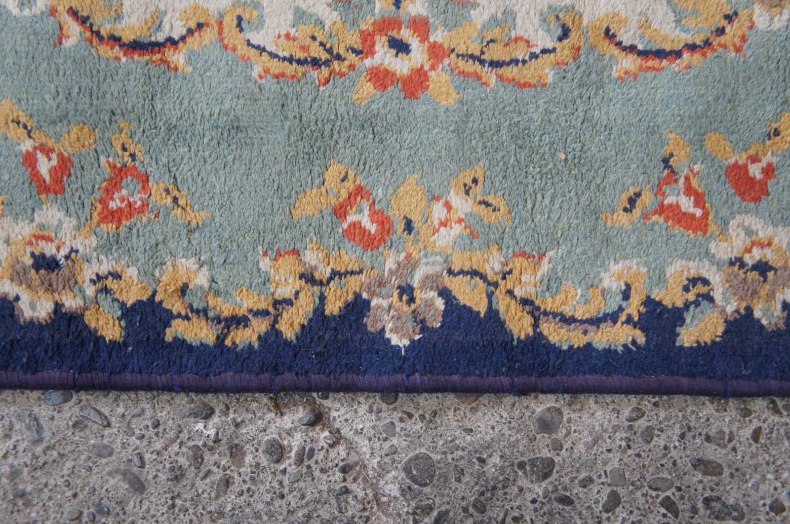 Aubusson area rug with a field of blues accented by gold, creme and red flowers