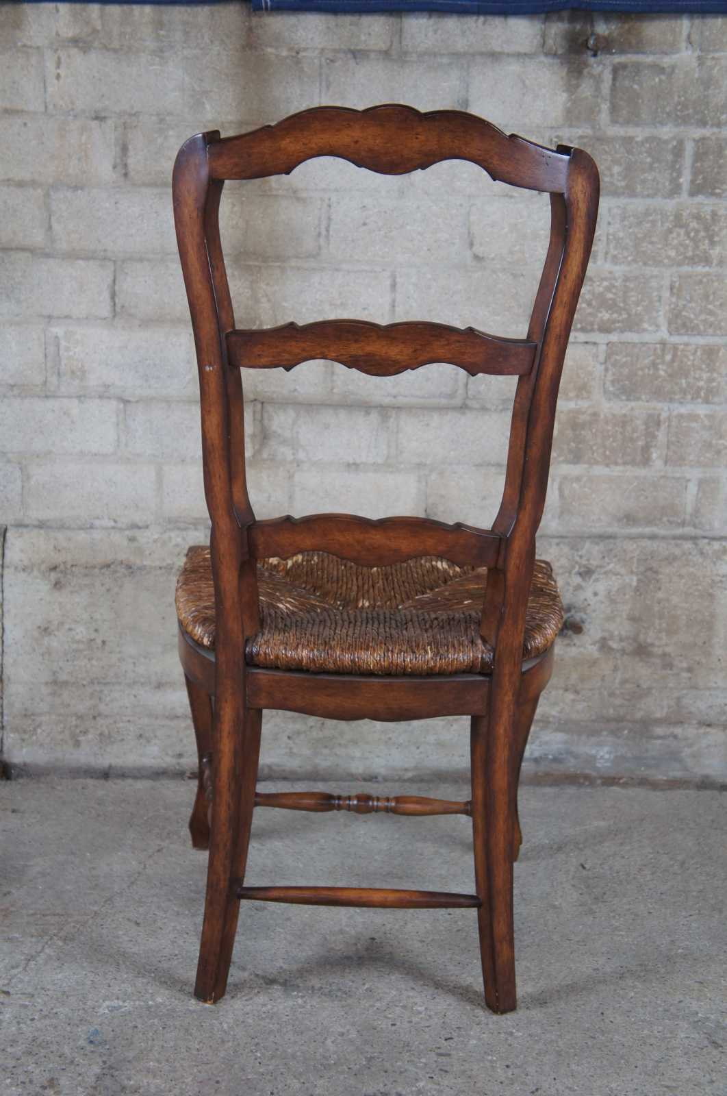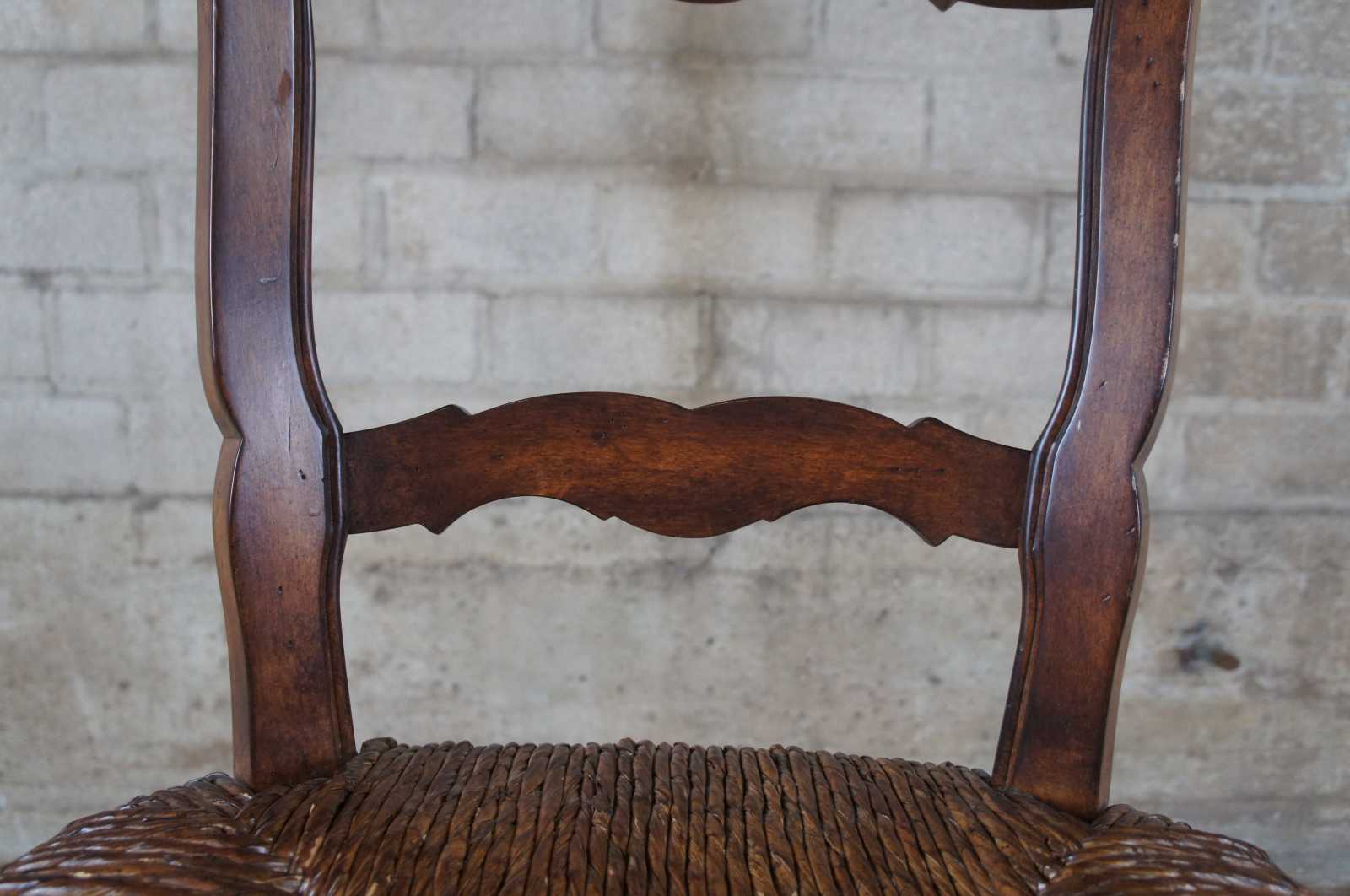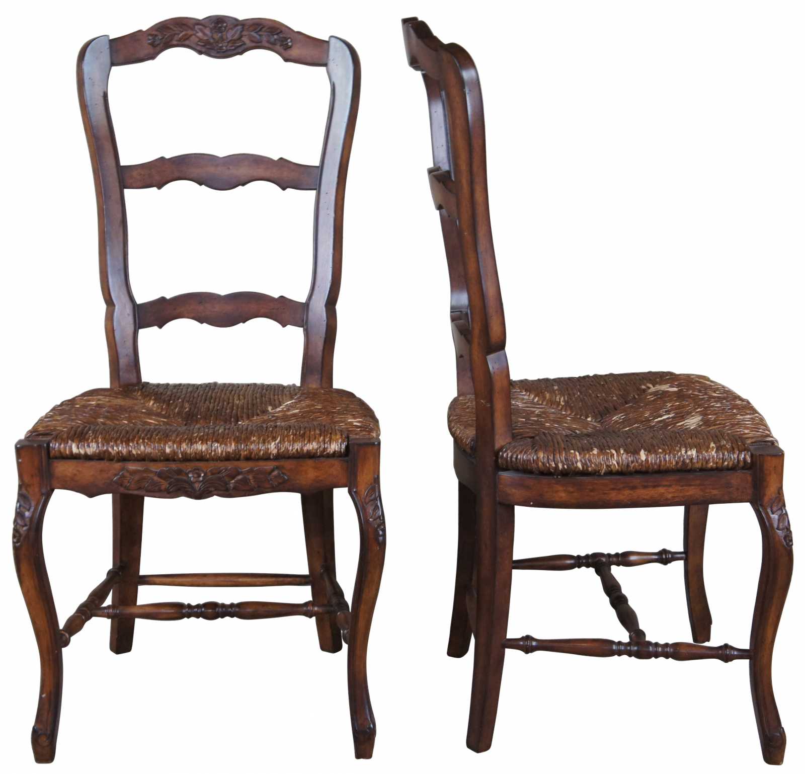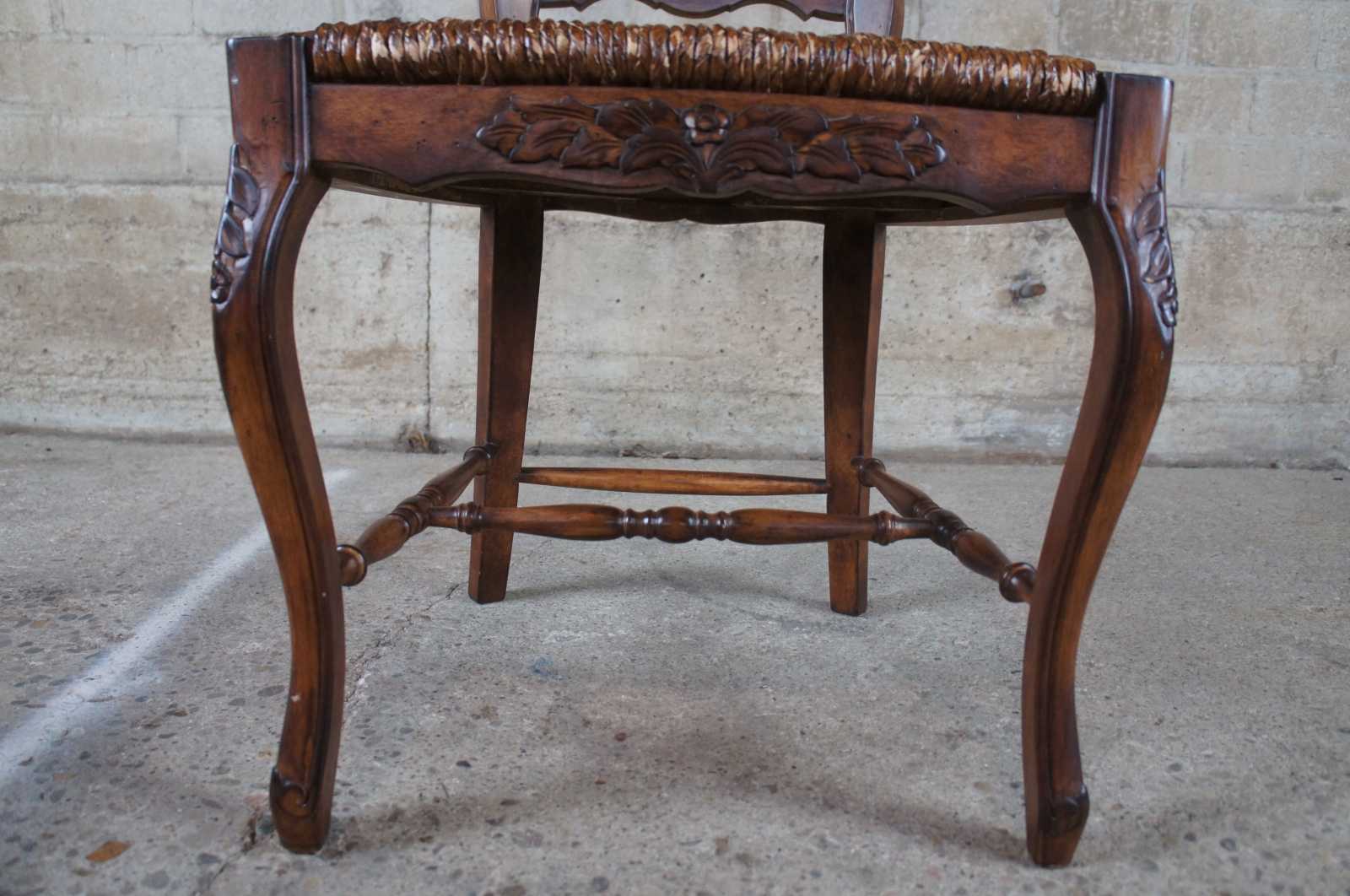 Four late 20th century Lewis Mittman dining chairs featuring a foliate carved rail over ladderback leading to rush seats and floral carved base. Chair is supported by cabriole legs connexted by an H stretcher. Drawing inspiration from French Country & Provincial styling.