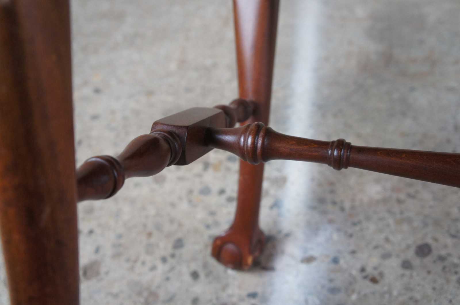 Vintage damask upholstered mahogany stool or bench. Features Chippendale styling with four legs connected by an H stretcher and ball and claw feet.