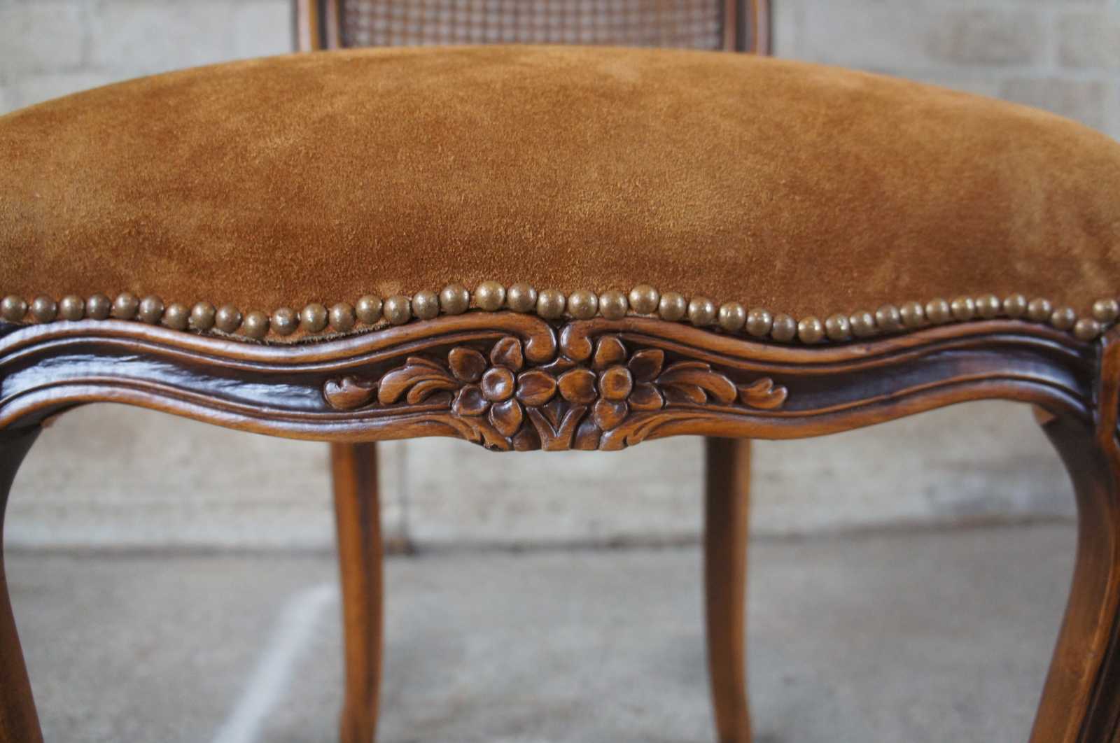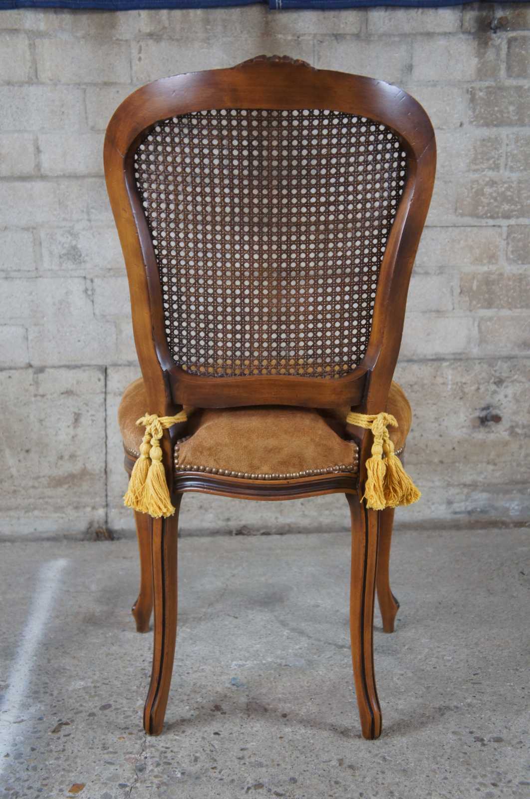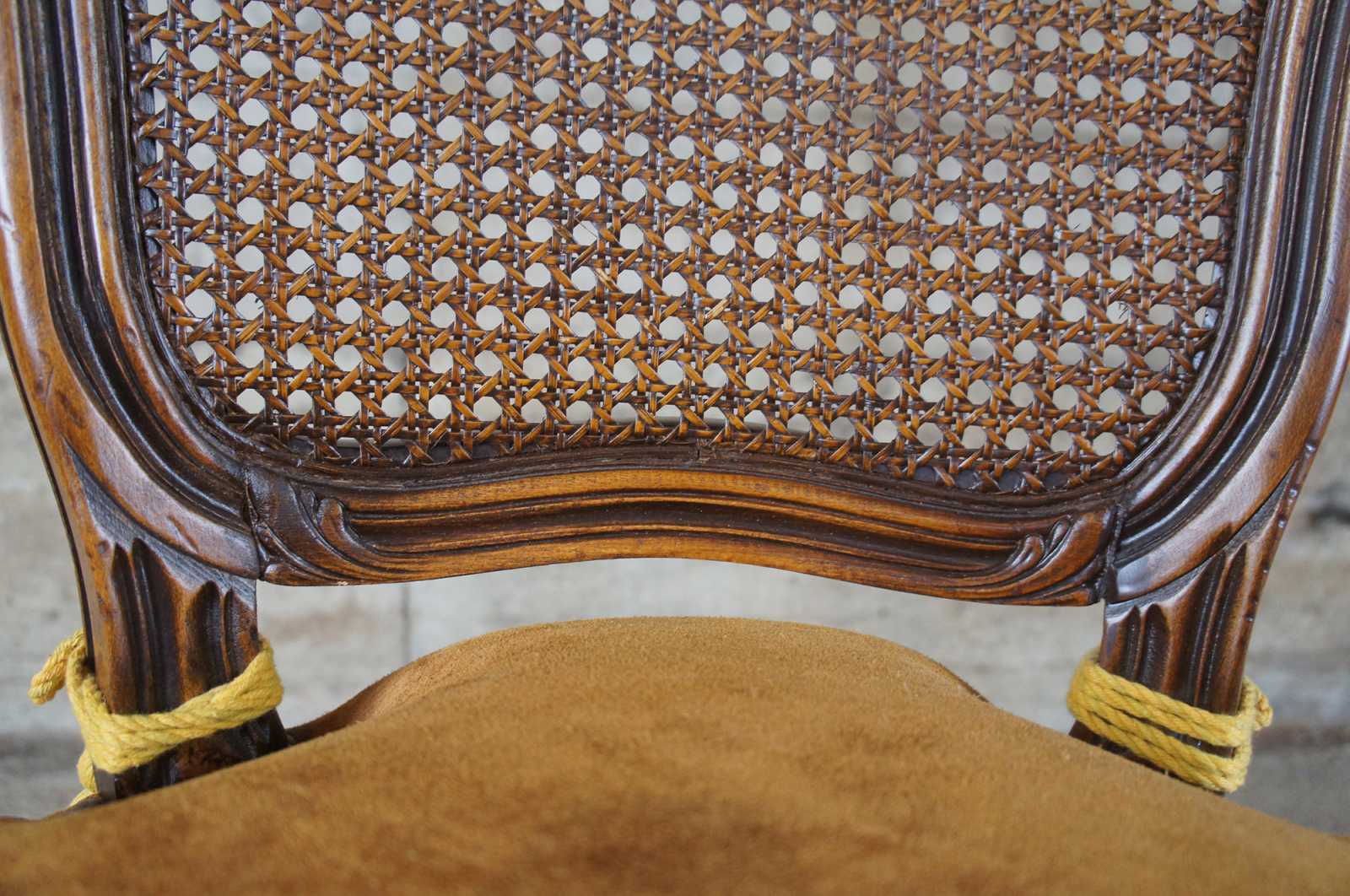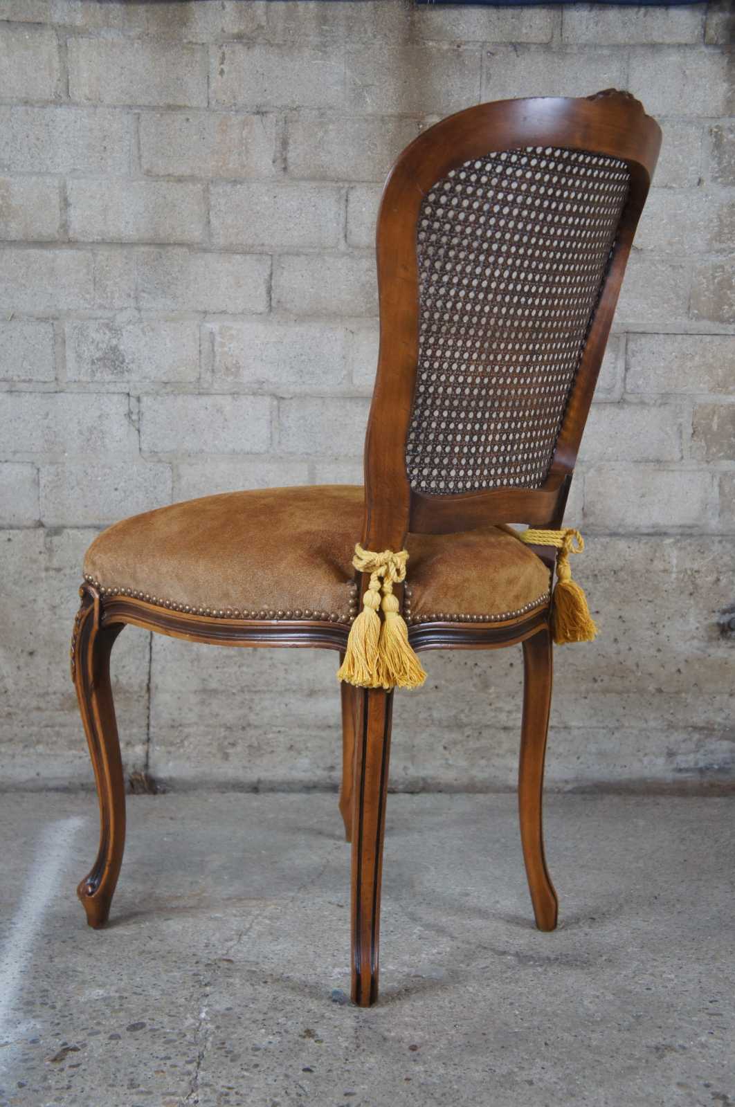 An exquiste set of Italian made dining chairs by Chateau D'AX. Walnut with carved foliate, cane back, suede seats, nailhead trim and cabriole legs leading to peg feet. Includes tied tassels along backside. Marked with label along underside.