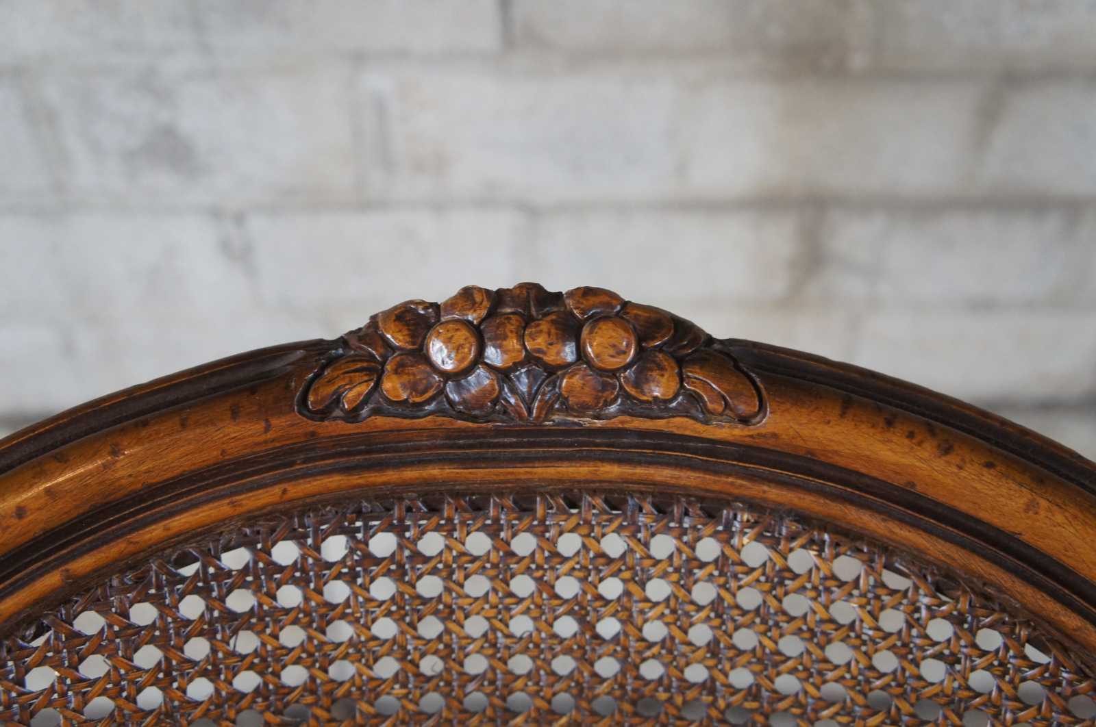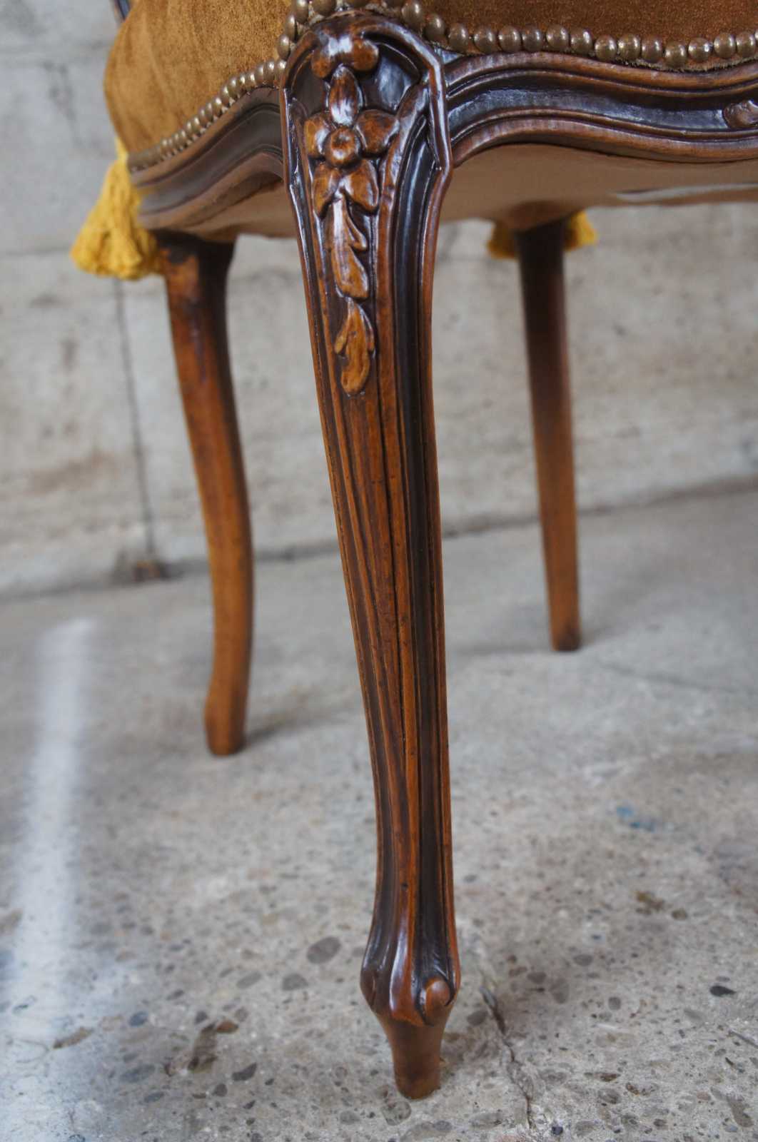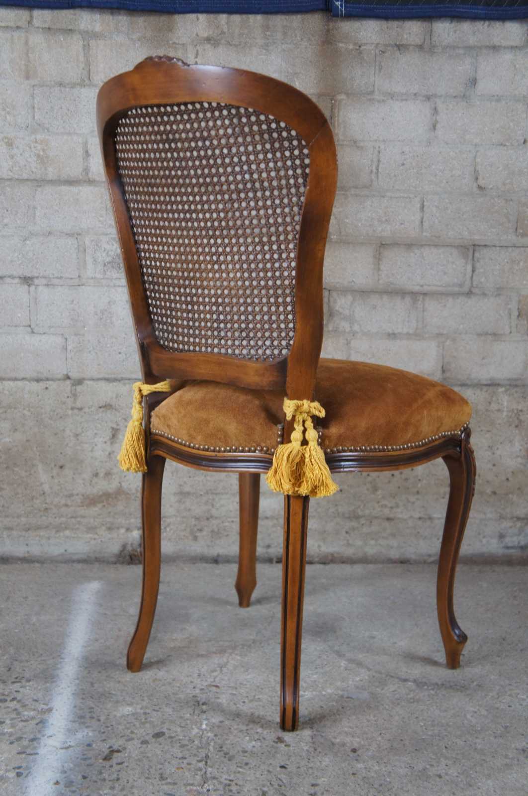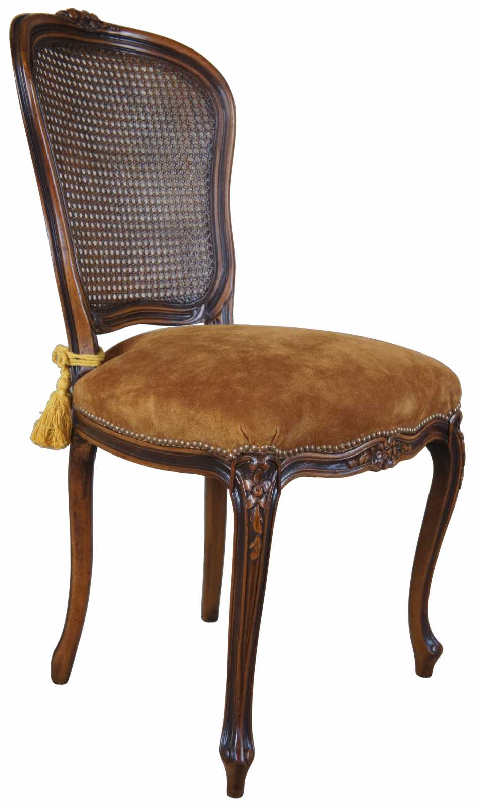 An exquiste set of Italian made dining chairs by Chateau D'AX. Walnut with carved foliate, cane back, suede seats, nailhead trim and cabriole legs leading to peg feet. Includes tied tassels along backside. Marked with label along underside.