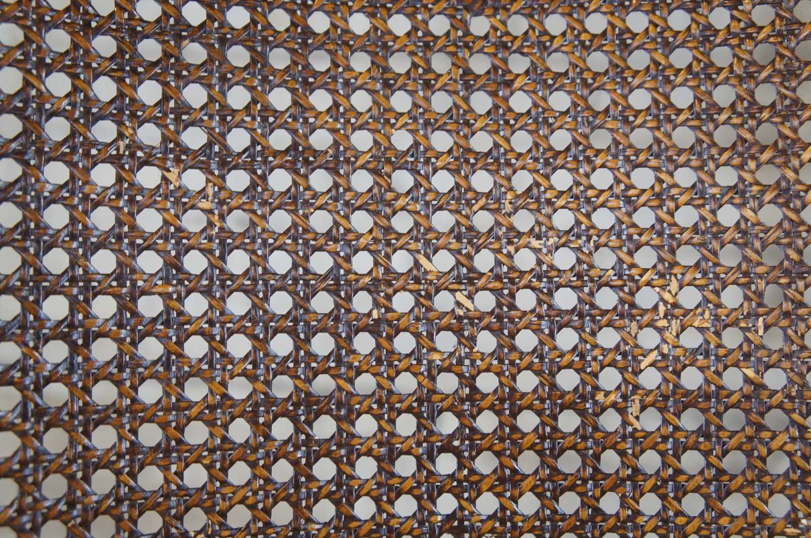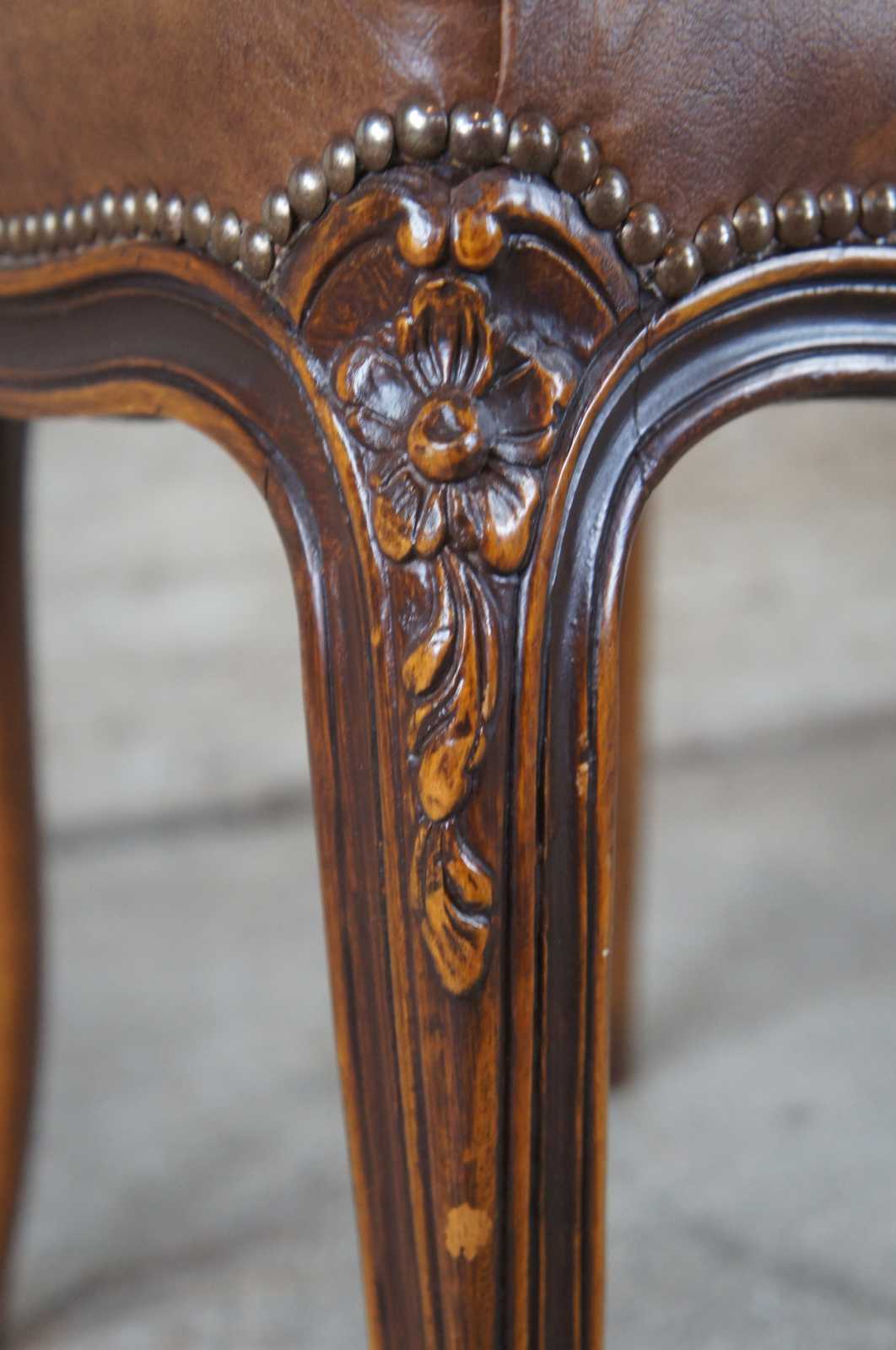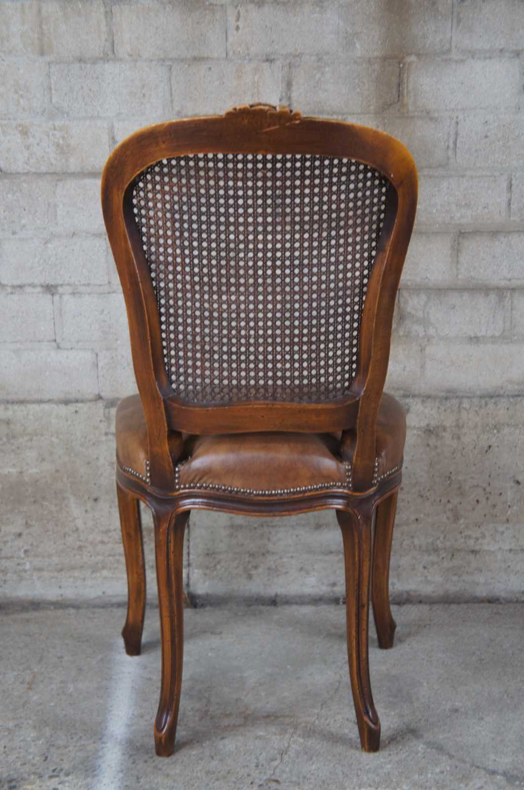 Italian made dining side chair by Chateau D'AX. Walnut with carved foliate, cane back, leather seats, nailhead trim and cabriole legs. Marked along along underside.