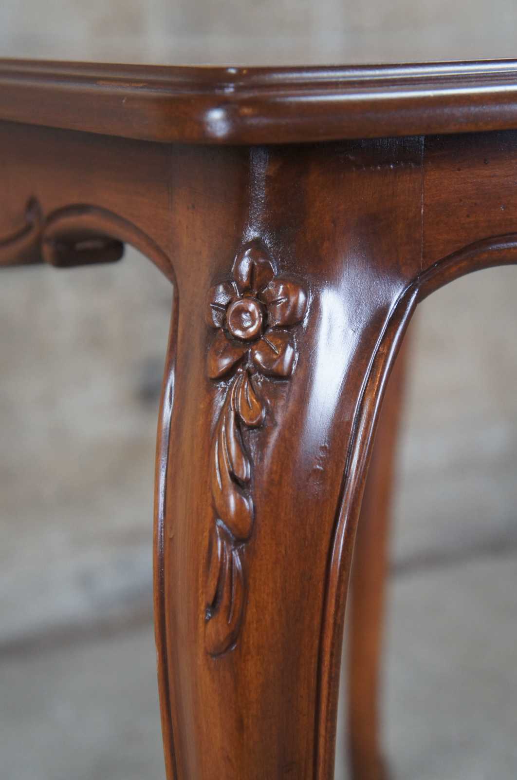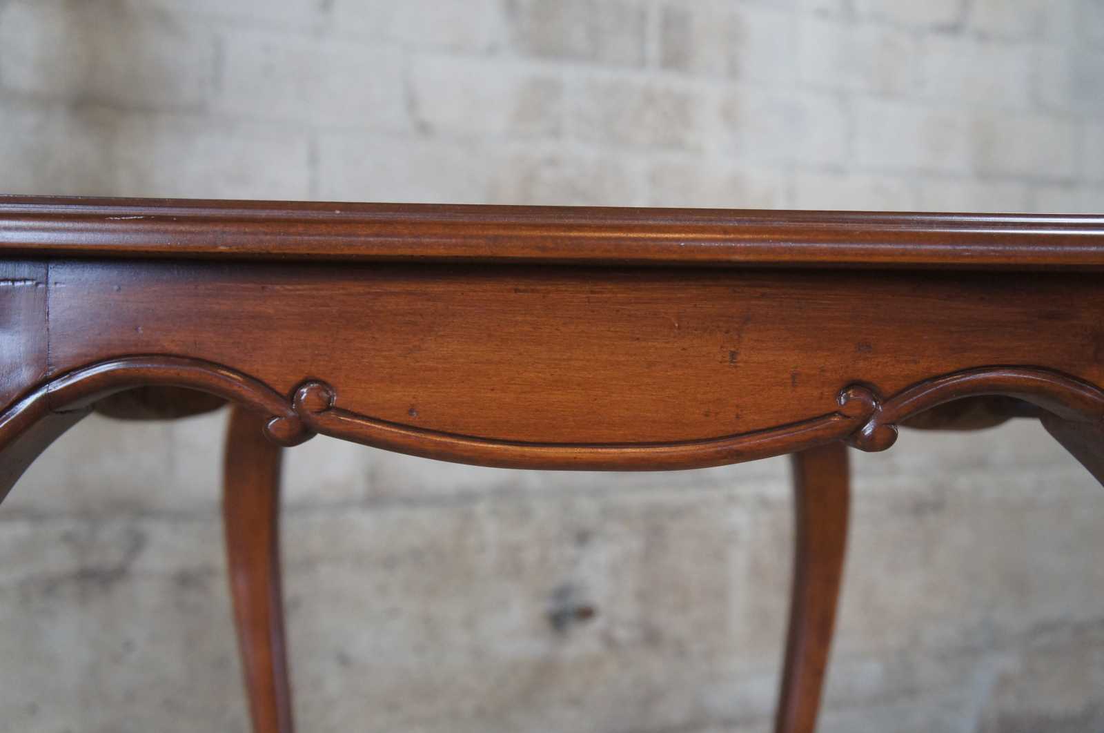Pair of 20th Century French Provincial side tables. Made from walnut with a rectangular form top, serpentine apron and carved floral accents over cabriole legs with scrolled feet.