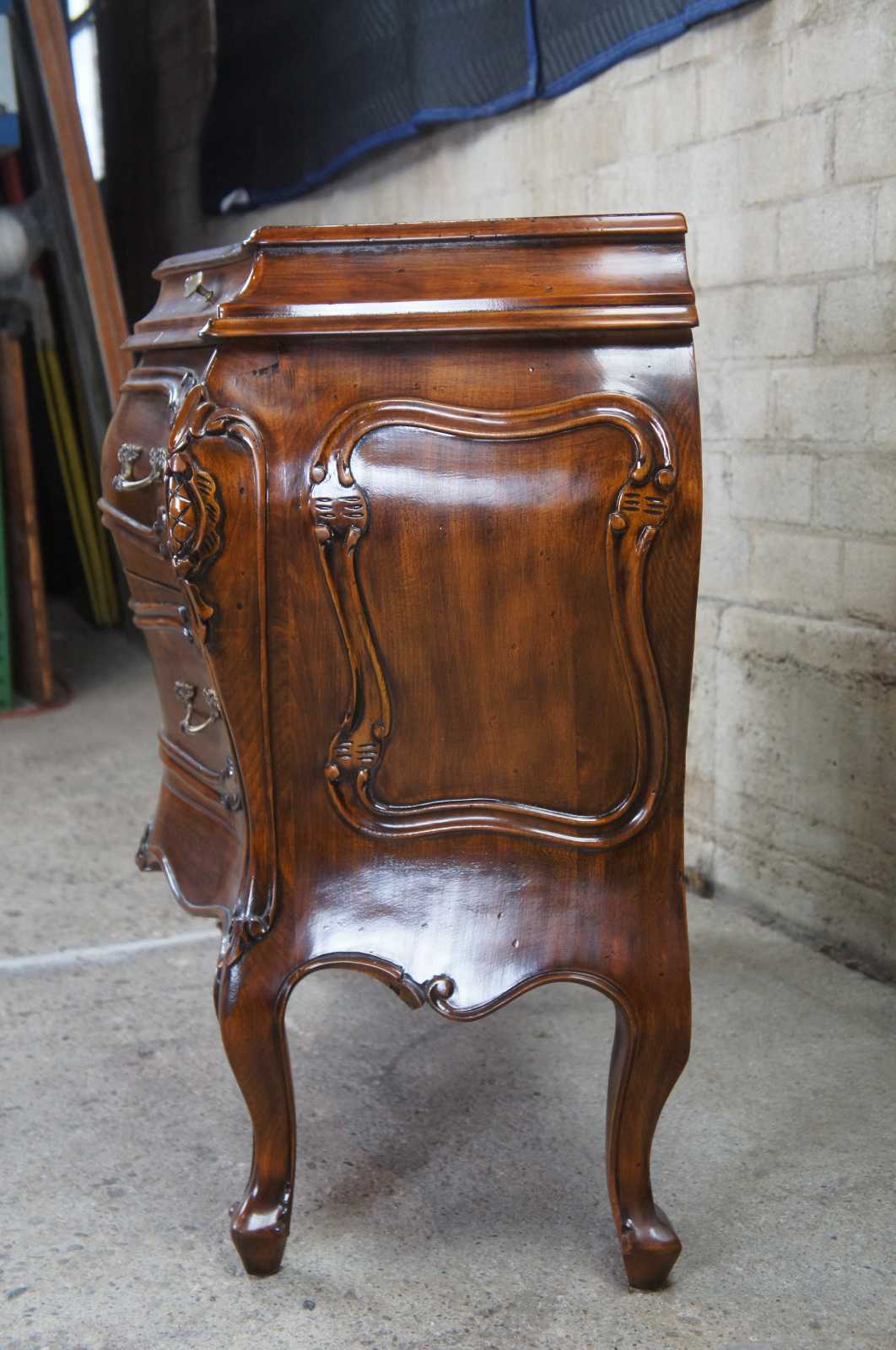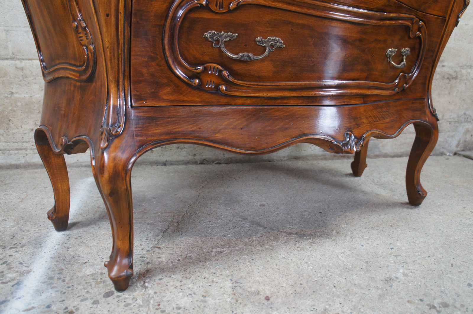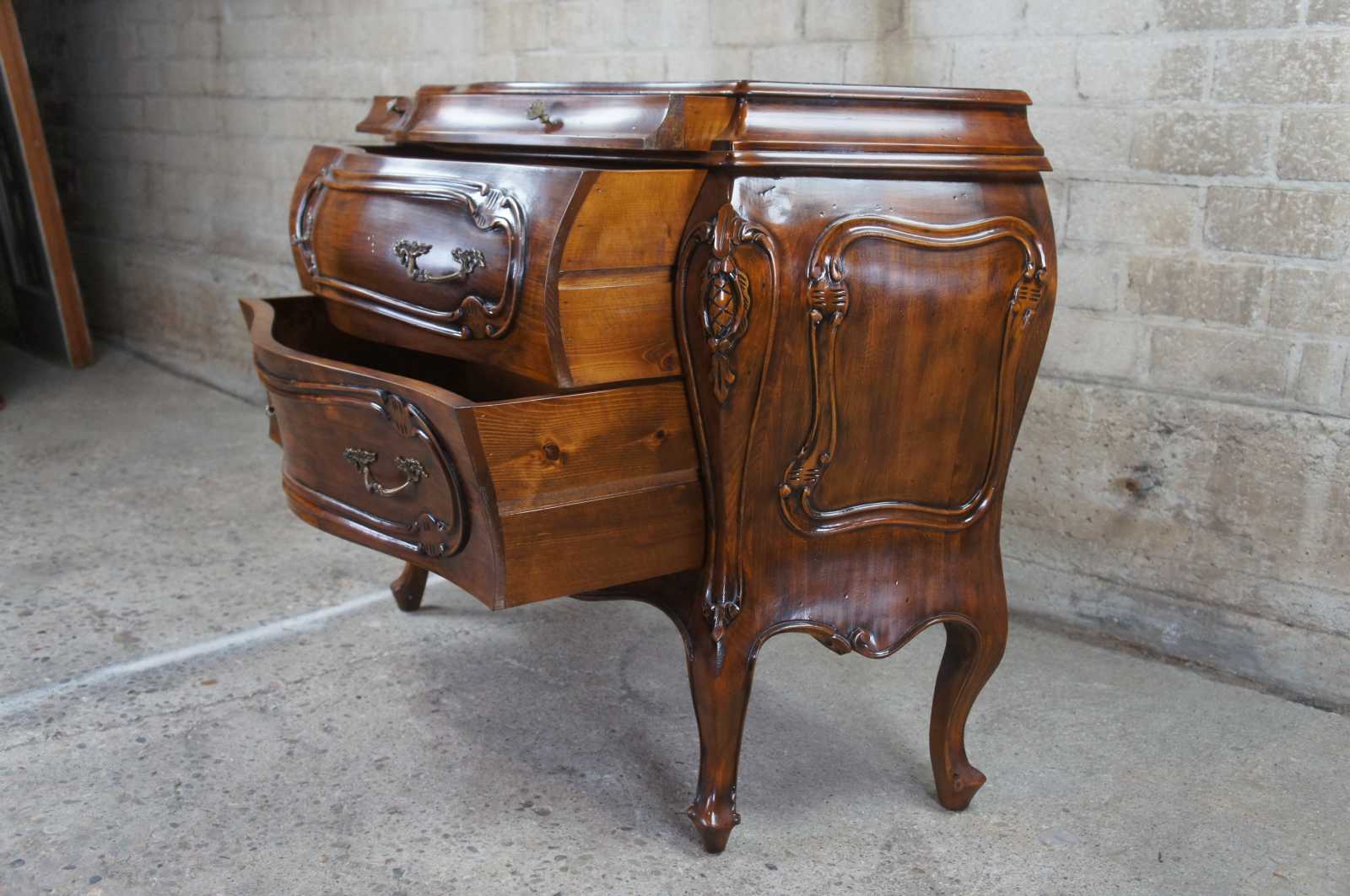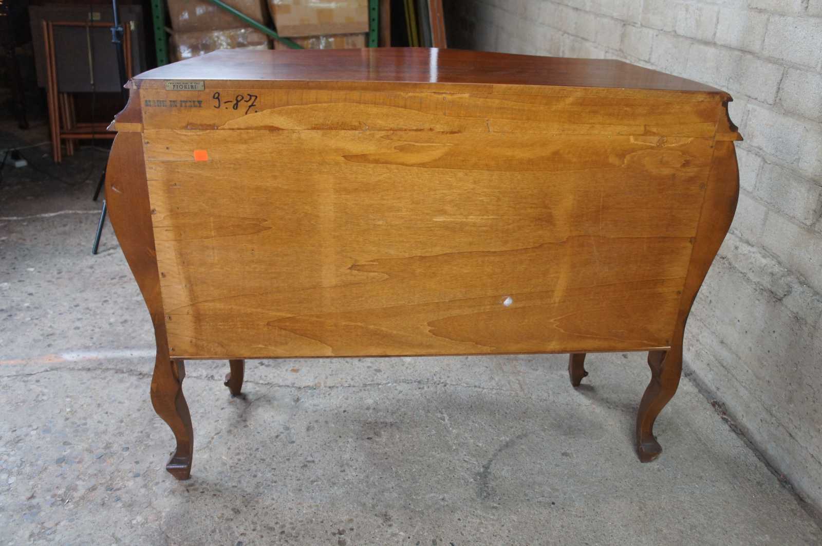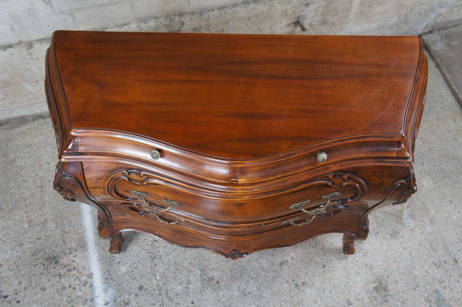 Vintage 1987 Fiorini Furniture bombe chest or commode. Made of walnut featuring ornate French and Italian styling with two petite glove drawres over two drawers supported by cabriole legs.