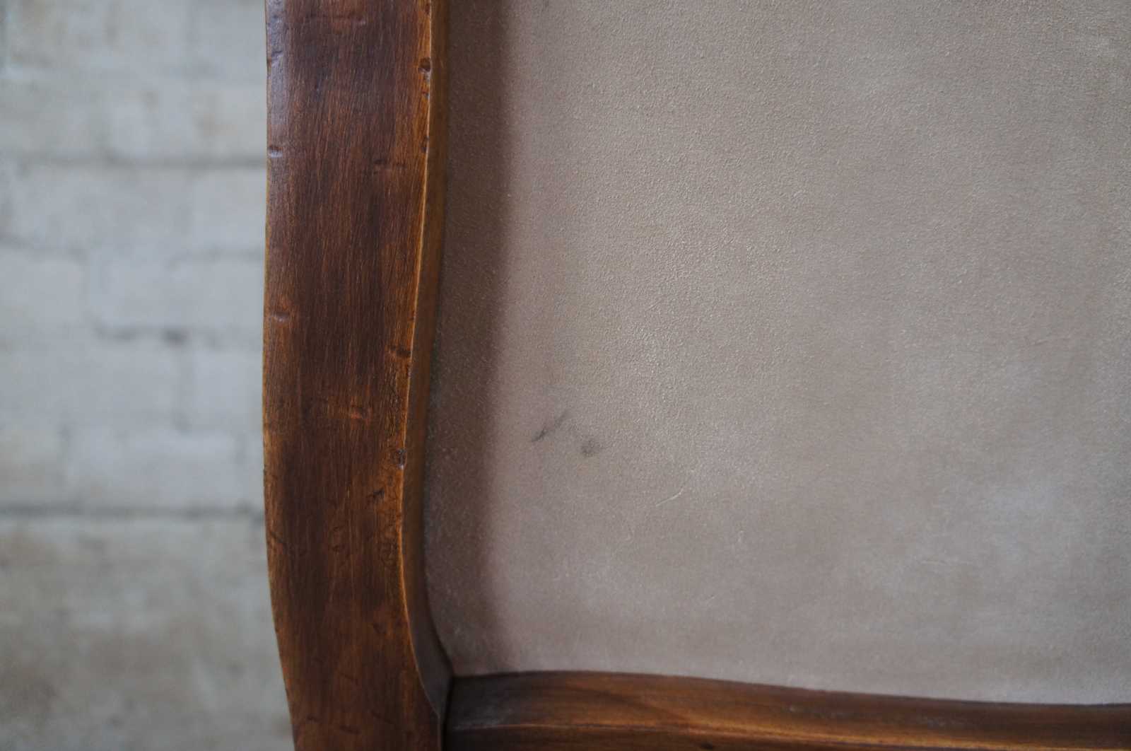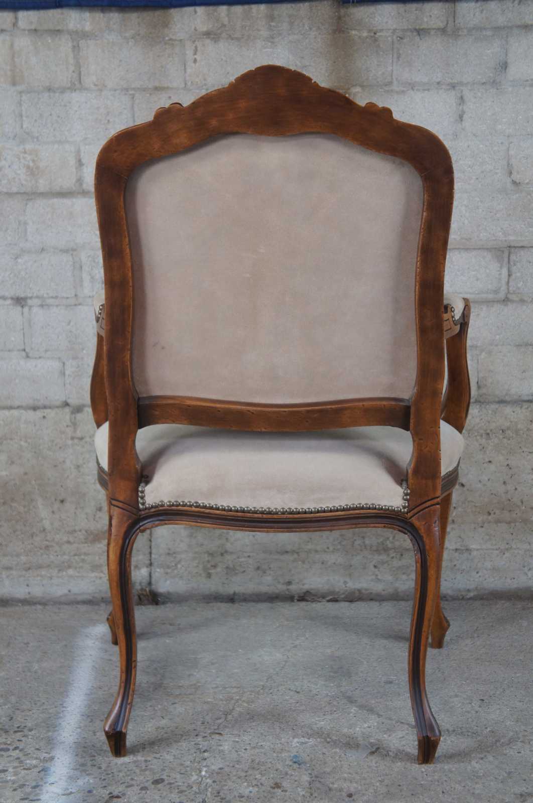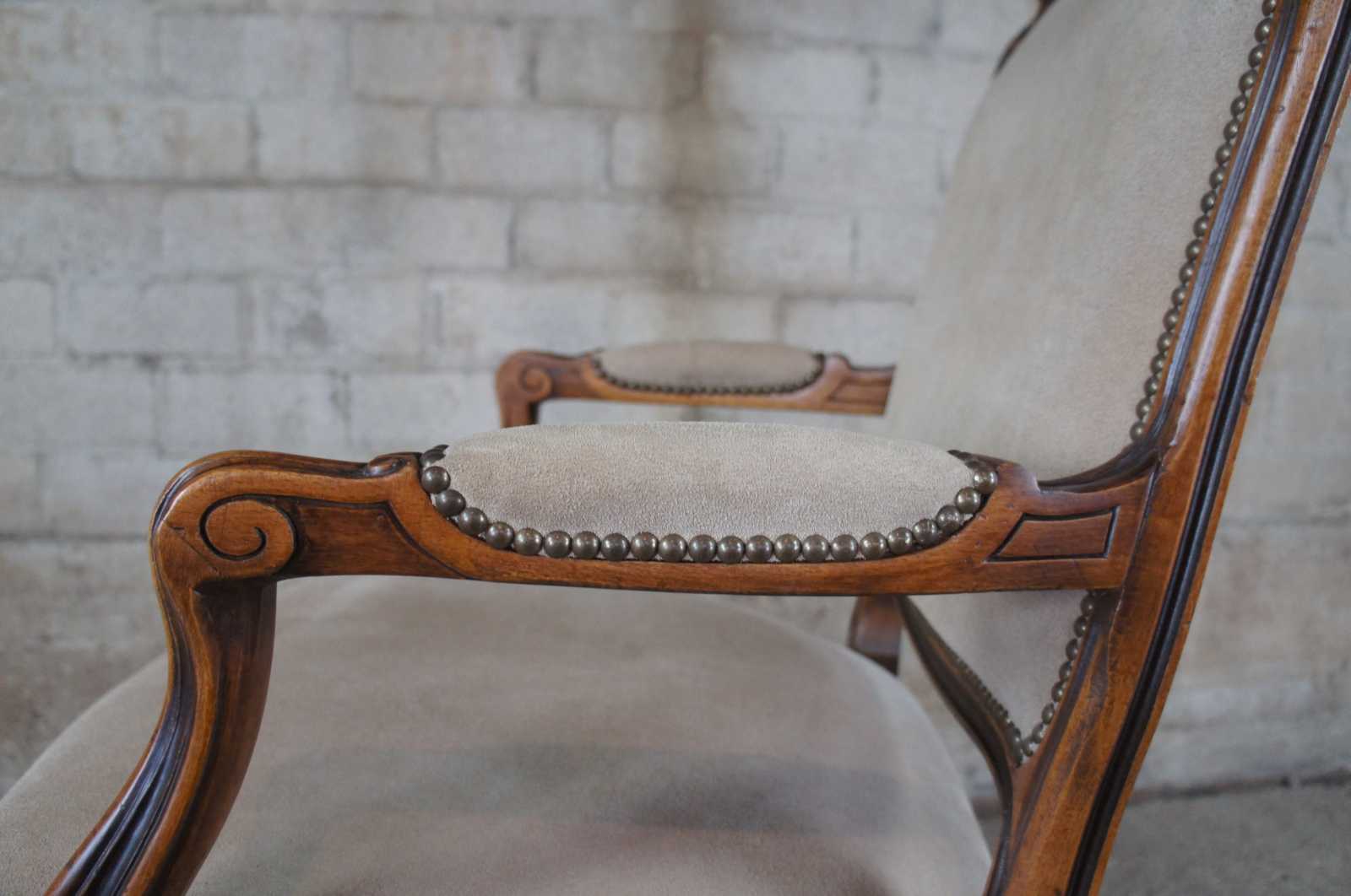 Italian made fauteuil chair in the manner of Louis XV by Chateau D'AX. Walnut with carved foliate, suede upholstered back and seat, nailhead trim and cabriole legs over peg feet. Marked along along underside.