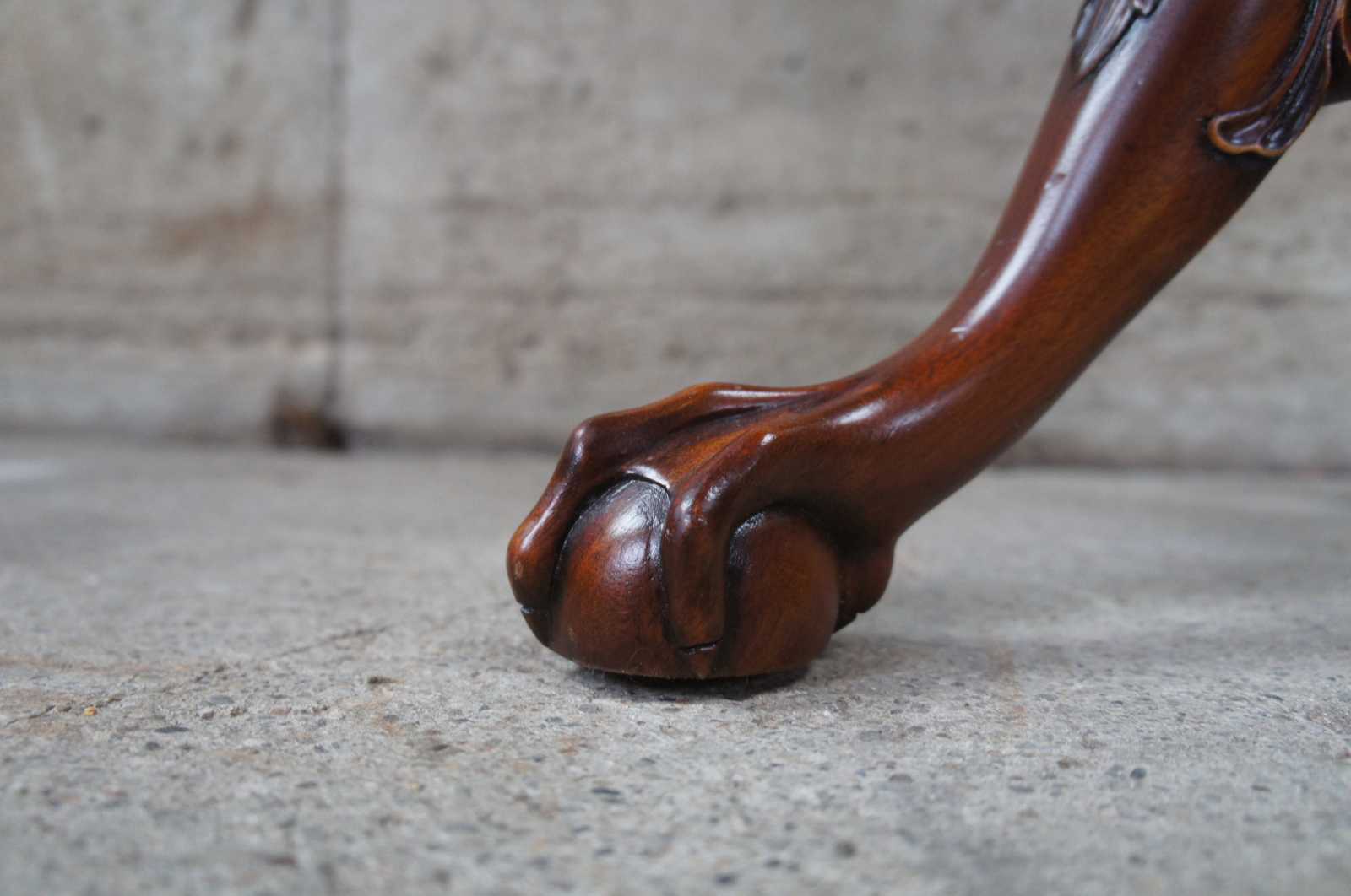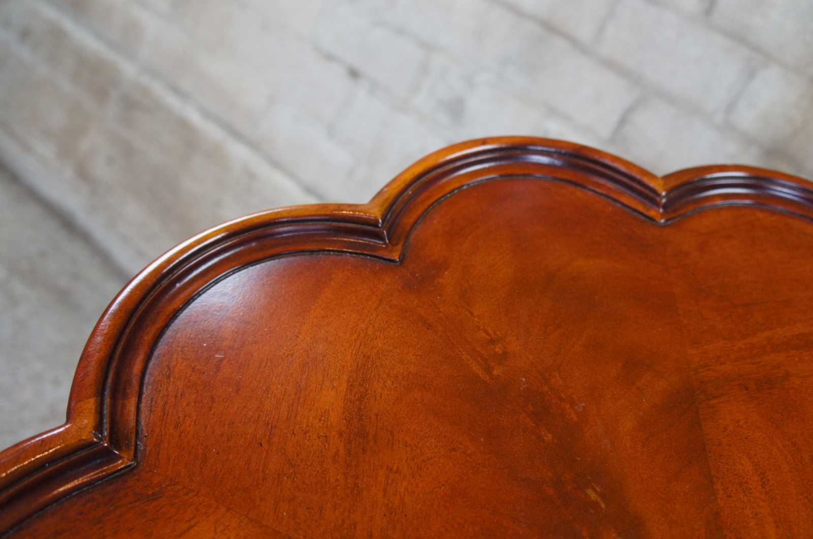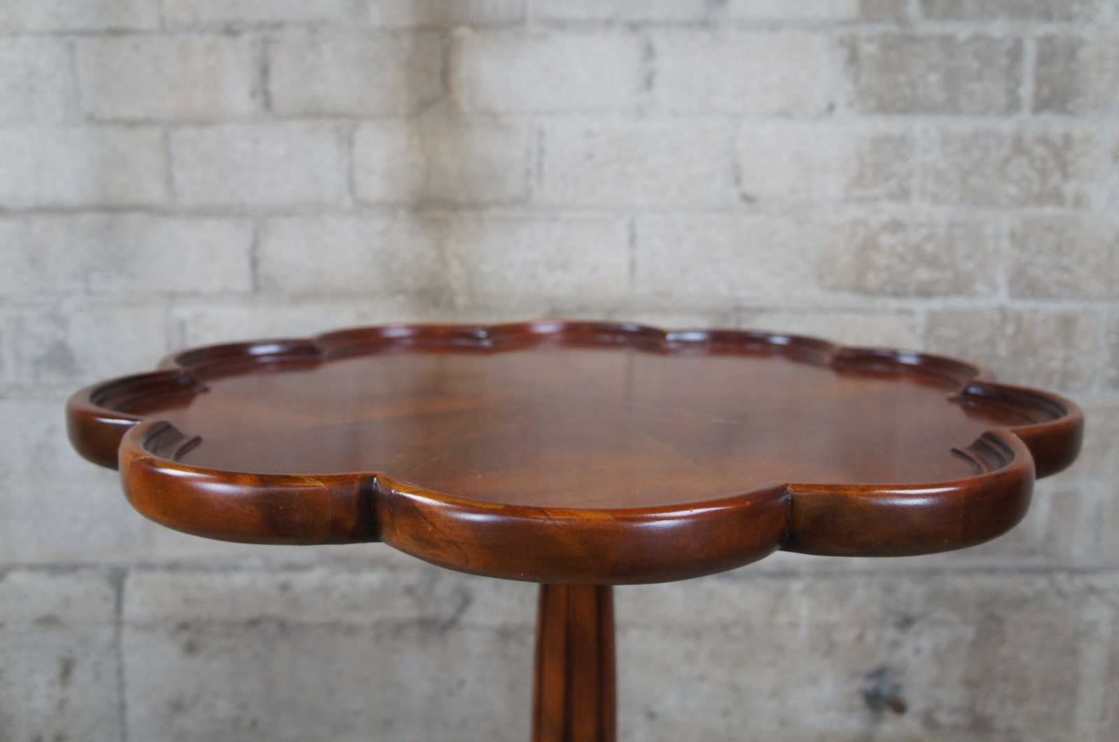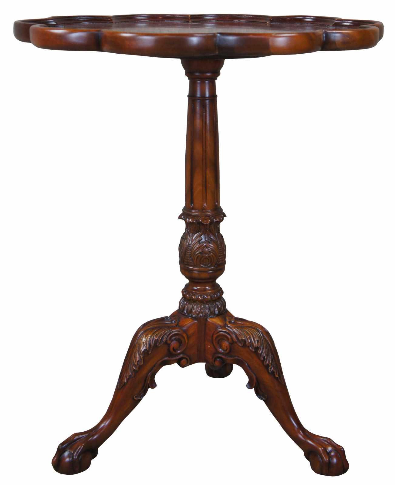 Vintage mahogany pie crust pedestal table featuring a round scalloped top over an ornate fluted and carved support with three ball and claw feet. Drawing inspiration from 18th century styling (George III/ Chippendale)