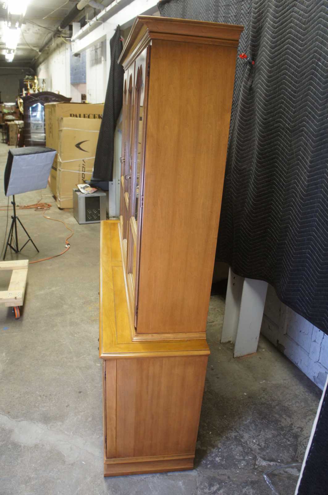 Circa 1970s Century Furniture Italian Provincial China Cabinet. Made from walnut with a stepback hutch featuring 3 shelves for display of china and collectibles. Buffet portion opens to 4 drawers and accessory storage.