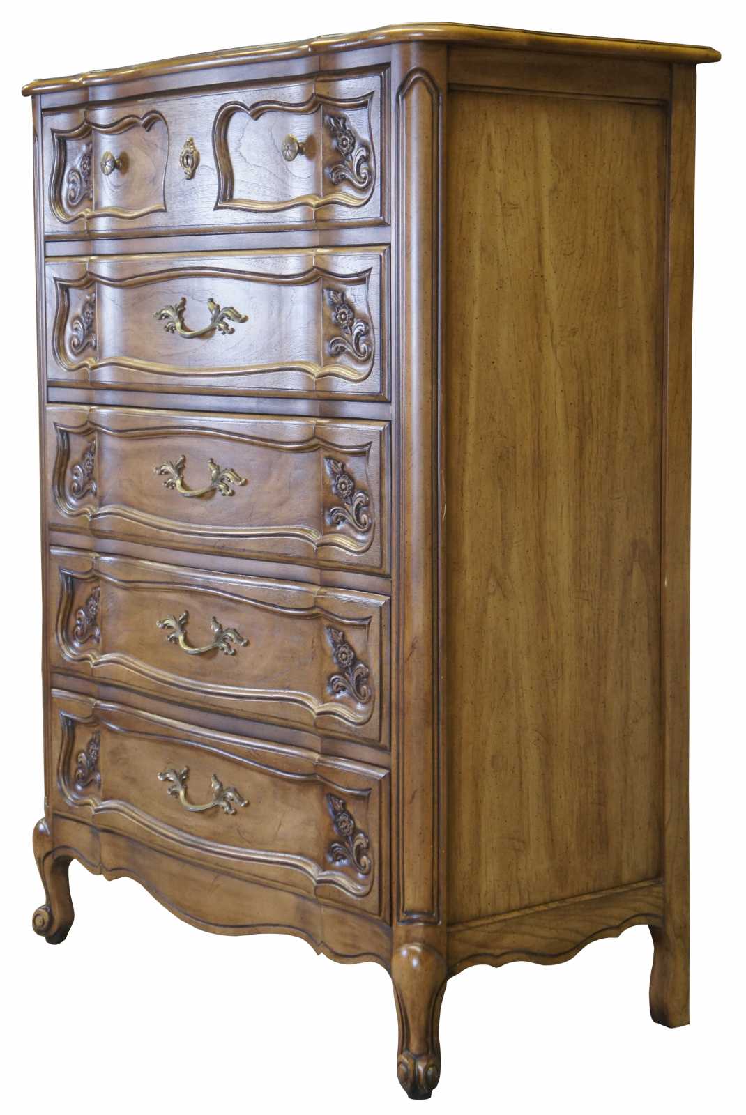 Circa 1960s French Provincial Chest of Drawers by Basic Witz. Made from fruitwood with a serpentine form and carved accents.