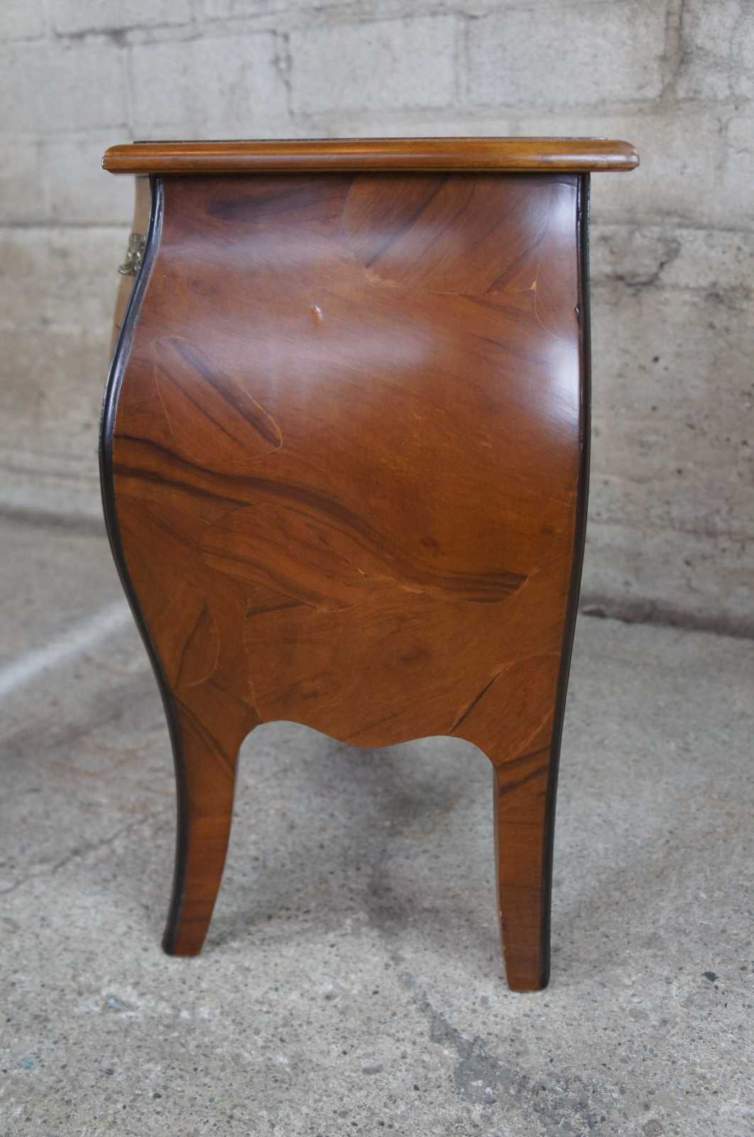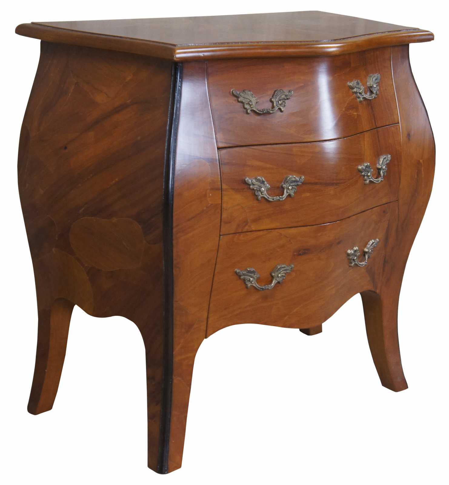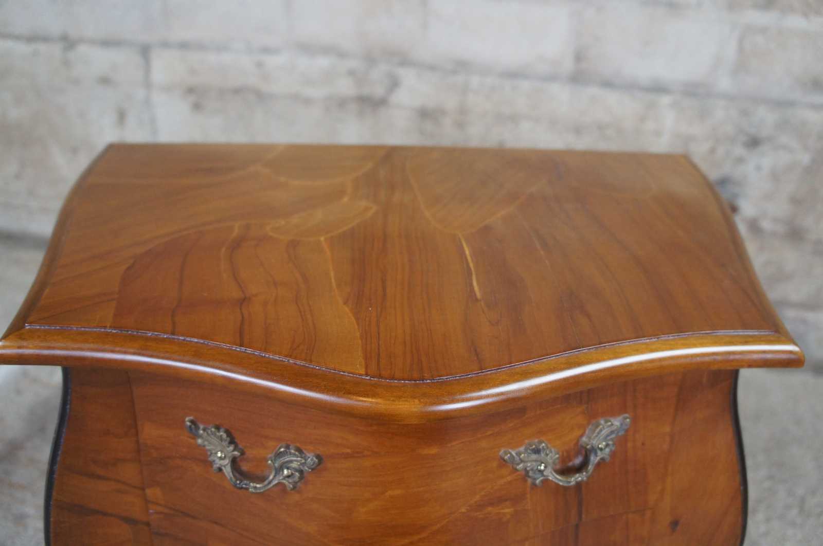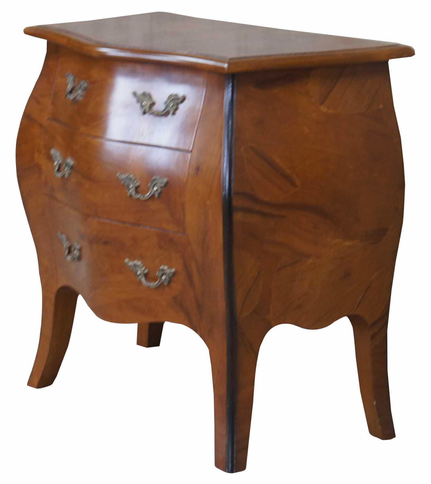 Italian Child-sized/ Miniature petite commode or jewelry chest, circa 1980s. Made from olive wood with a shaped top, on conforming case of three stacked walpaper lined drawers, raised on splayed feet.