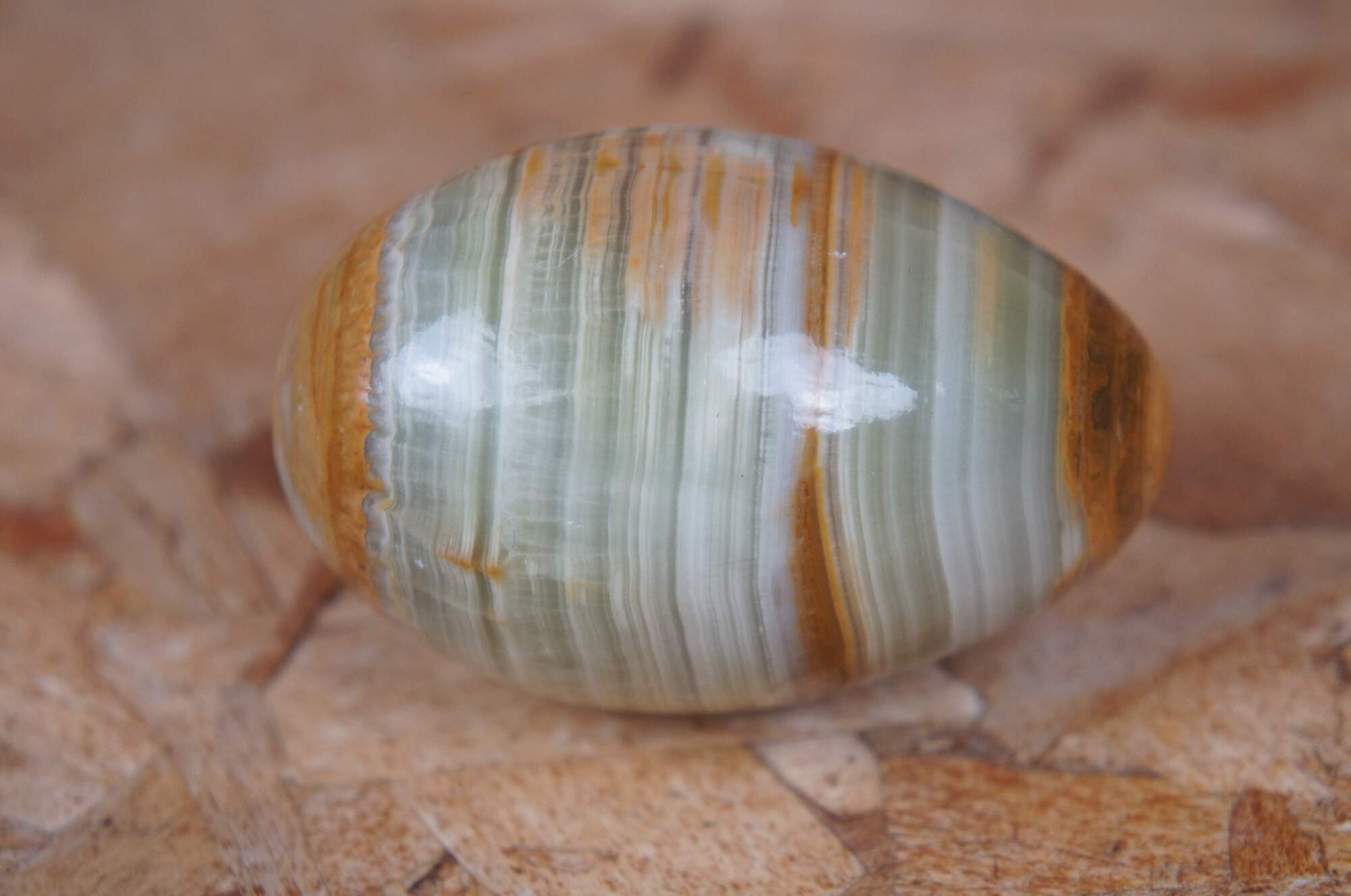 29 decorative polished stone eggs of differing materials in a rainbow of colors.
