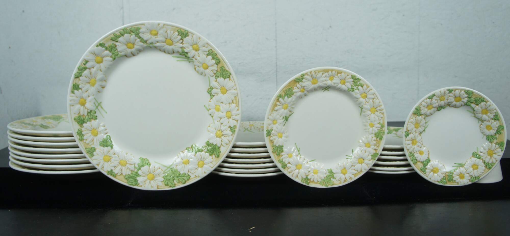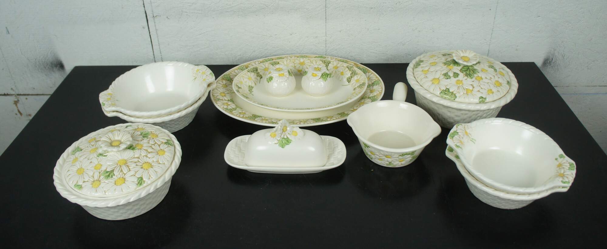 91 piece set of retro mid century china by Metlox of California. Featuring the Poppy Trail floral pattern with raised daisy. Set includes platters, plates, bowls, cups, tea / coffee set and many serving pieces.