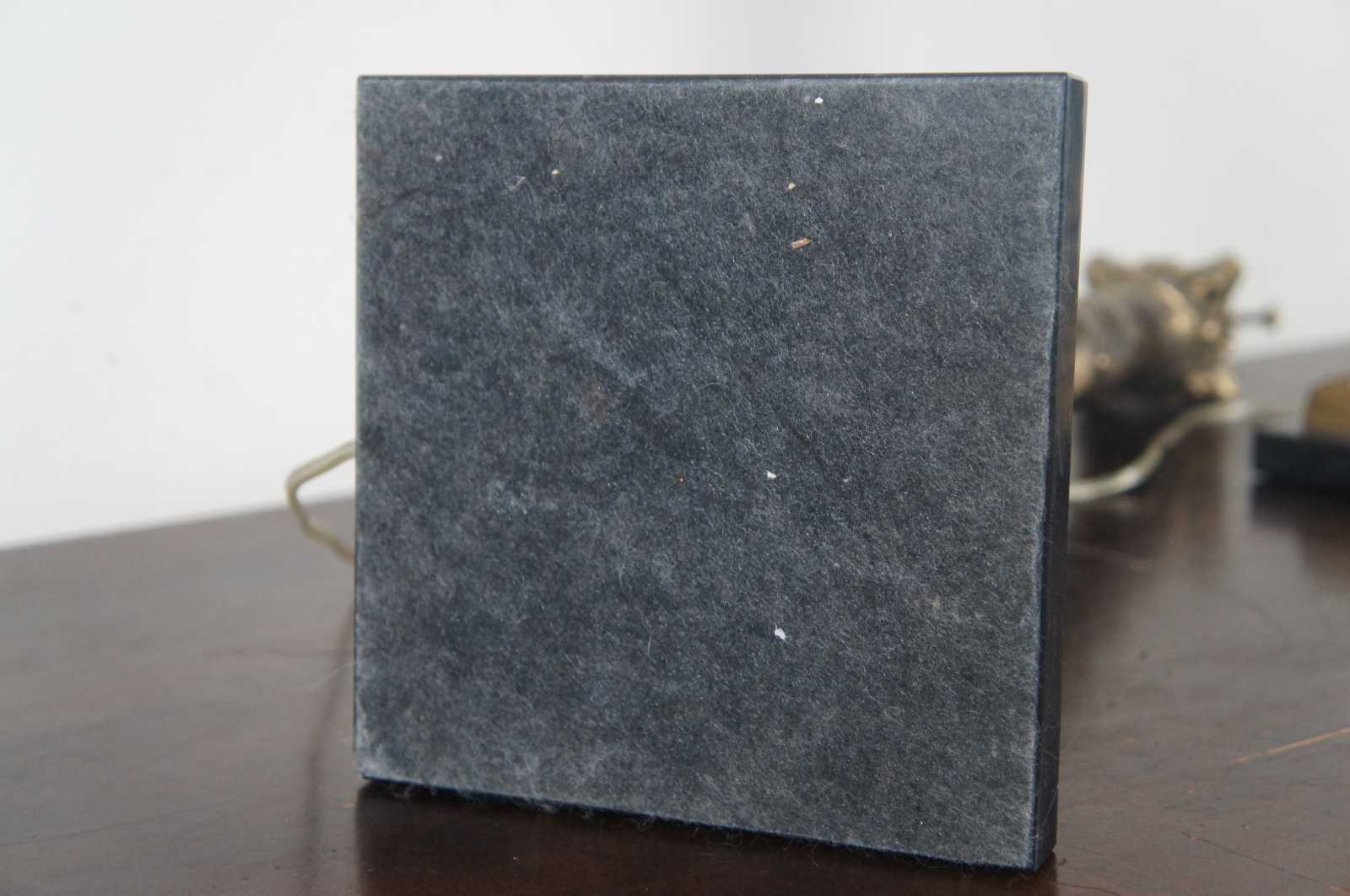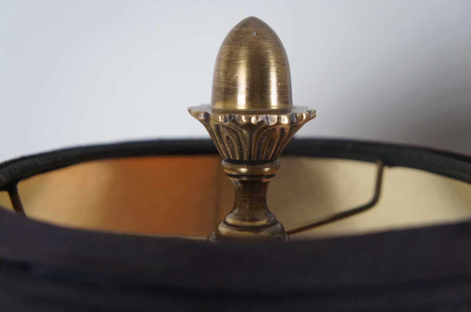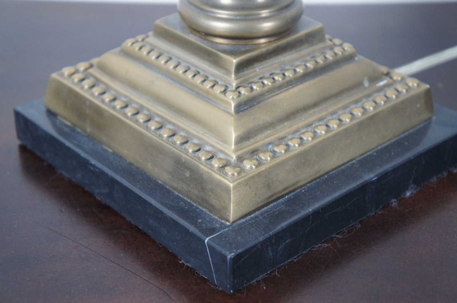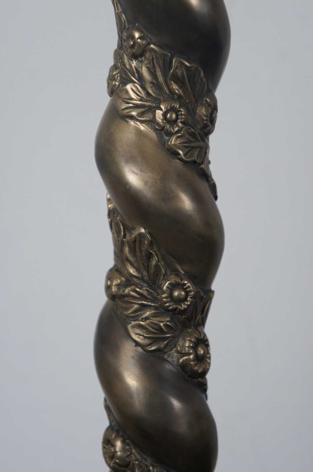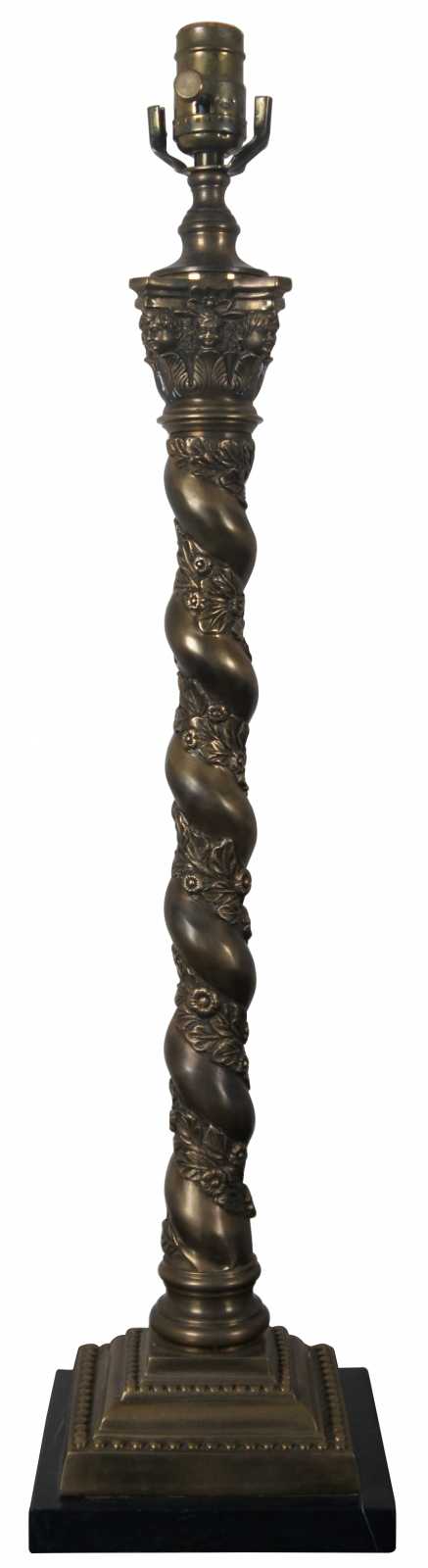 Vintage bronze barley twist lamp pair attributed to Theodore Alexander. Features corinthian columns with cherubs or pooties on marble base with acorn finials and floral motif. Very heavy.