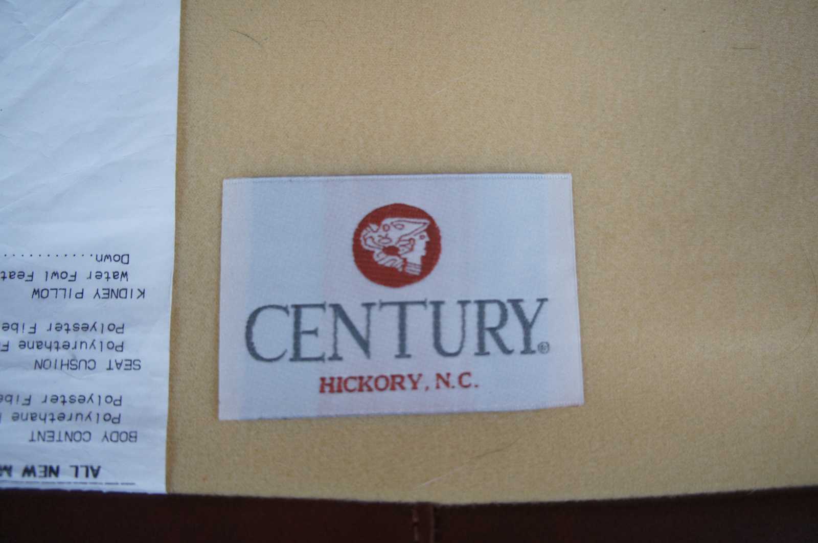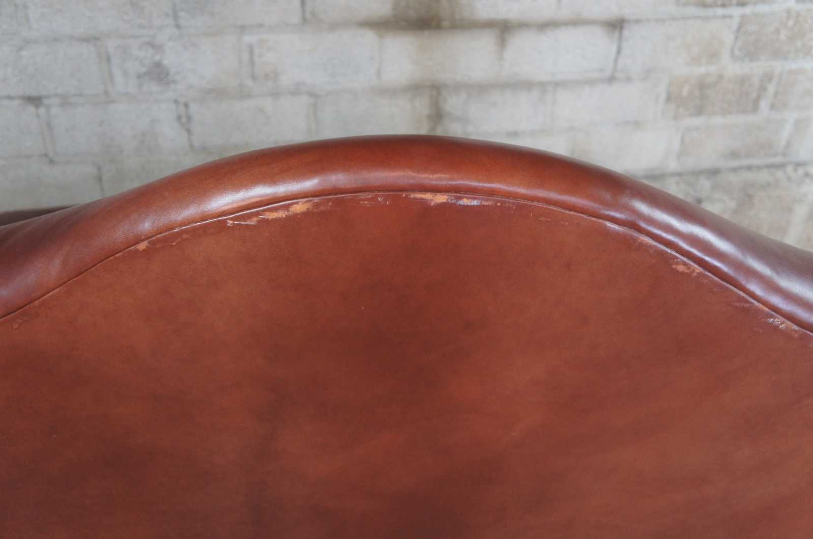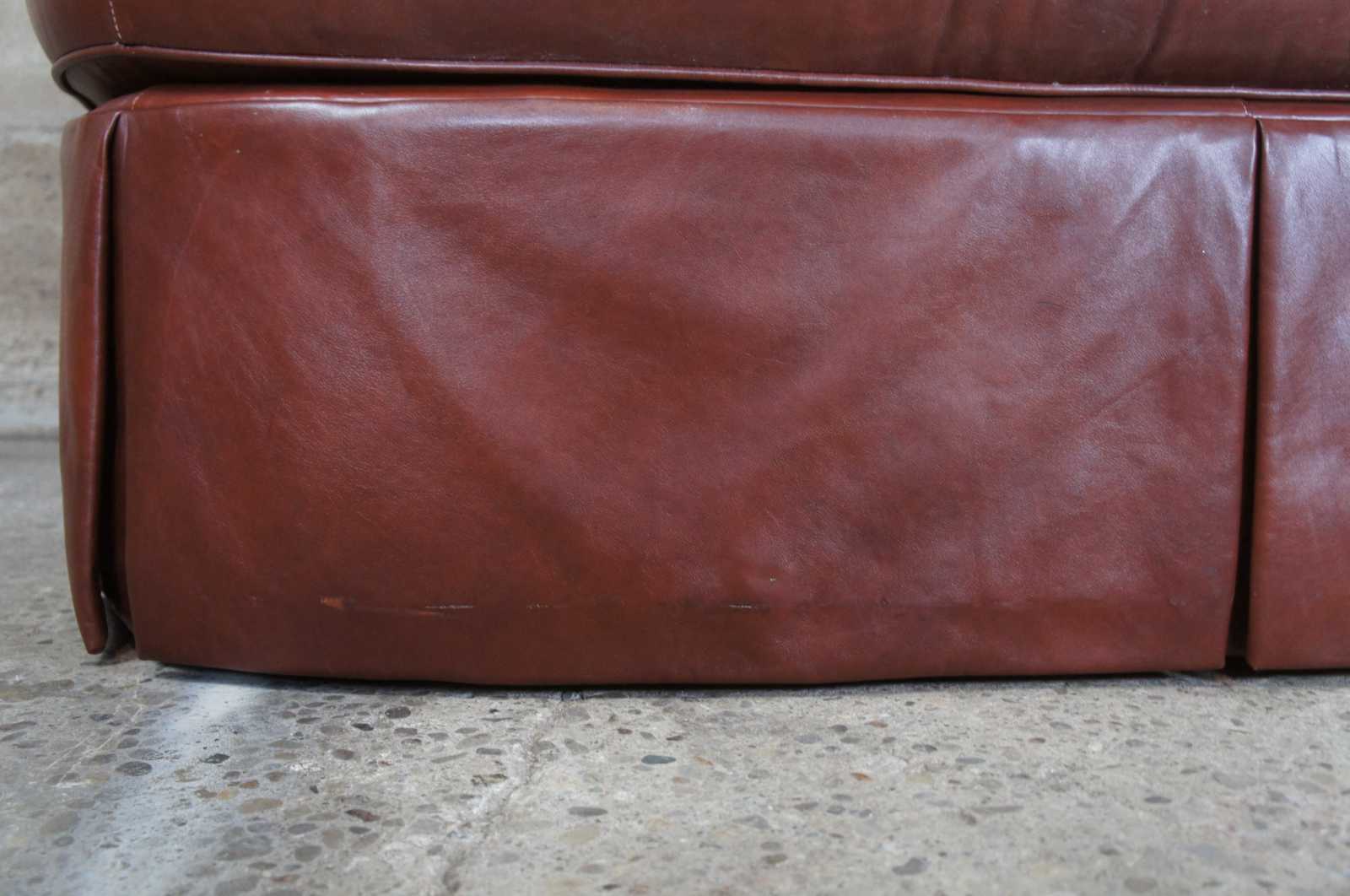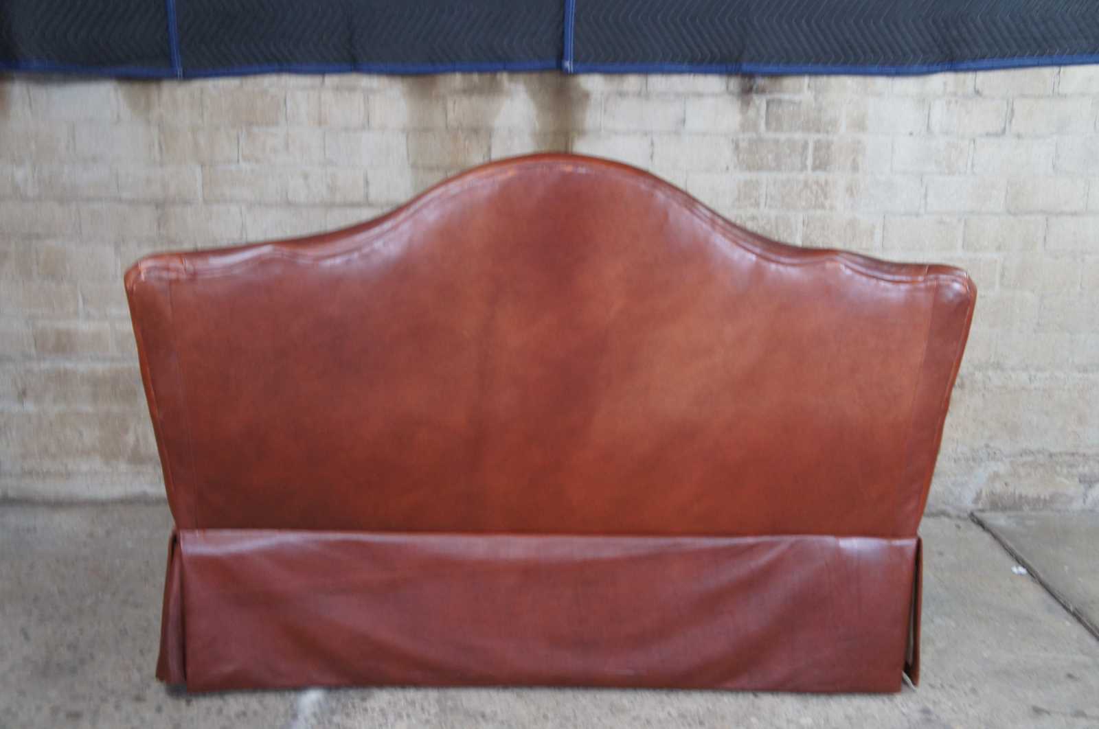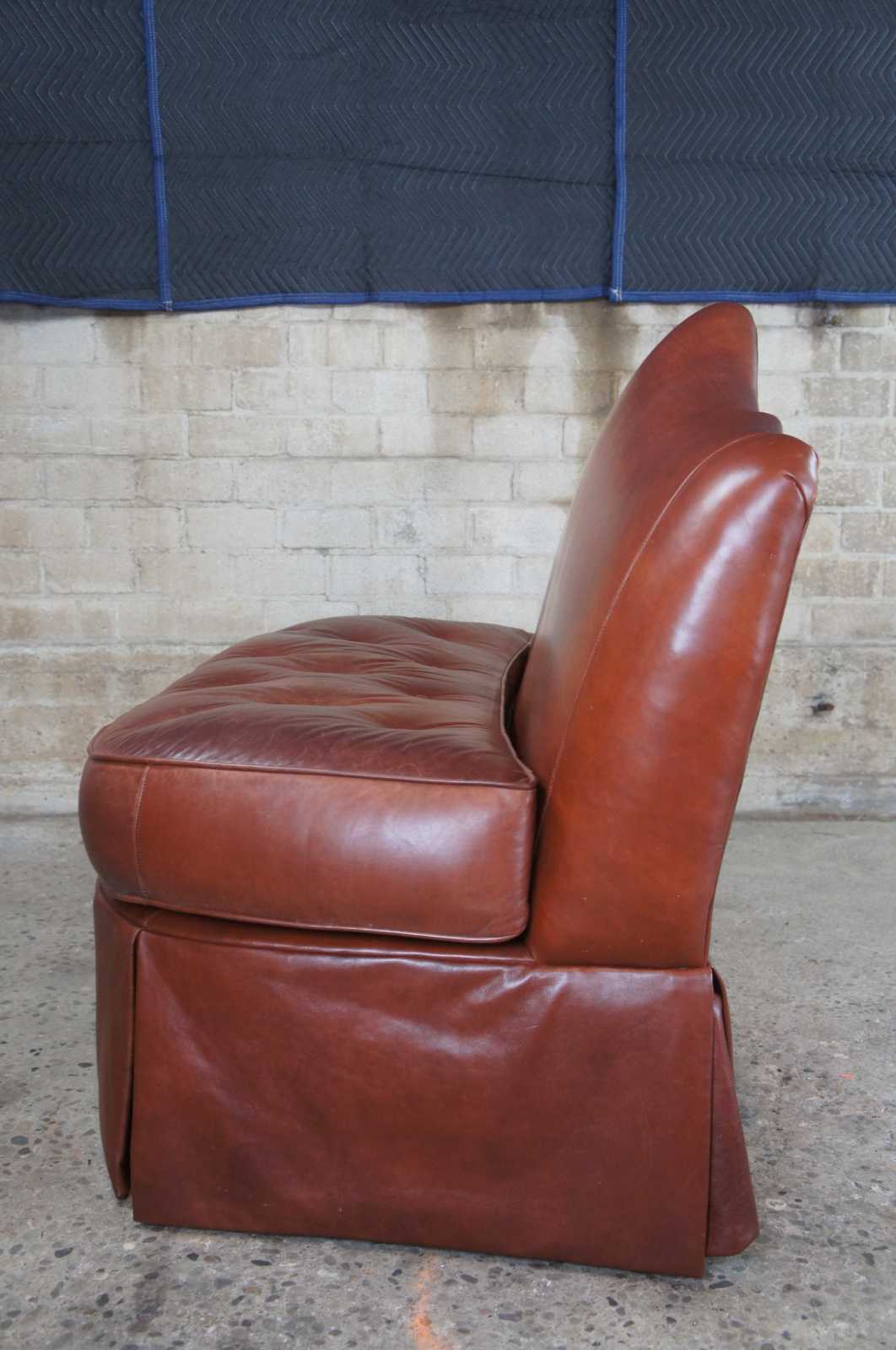 Century Furniture Camelback Banquette/Bench. Made from a warm brown leather with tufted kidney shaped seat. Front legs on casters for ease of movement.