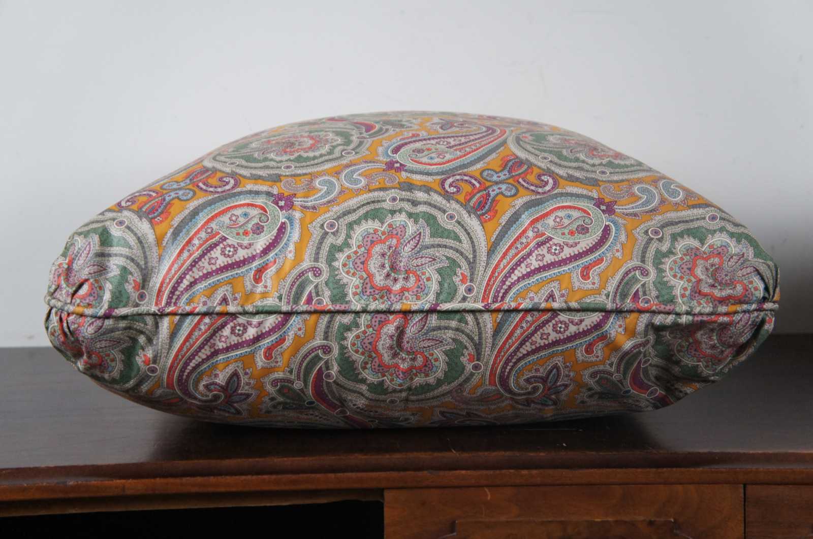 Pair of large down filled throw pillows covered in green, yellow, purple and pink floral paisley fabric.