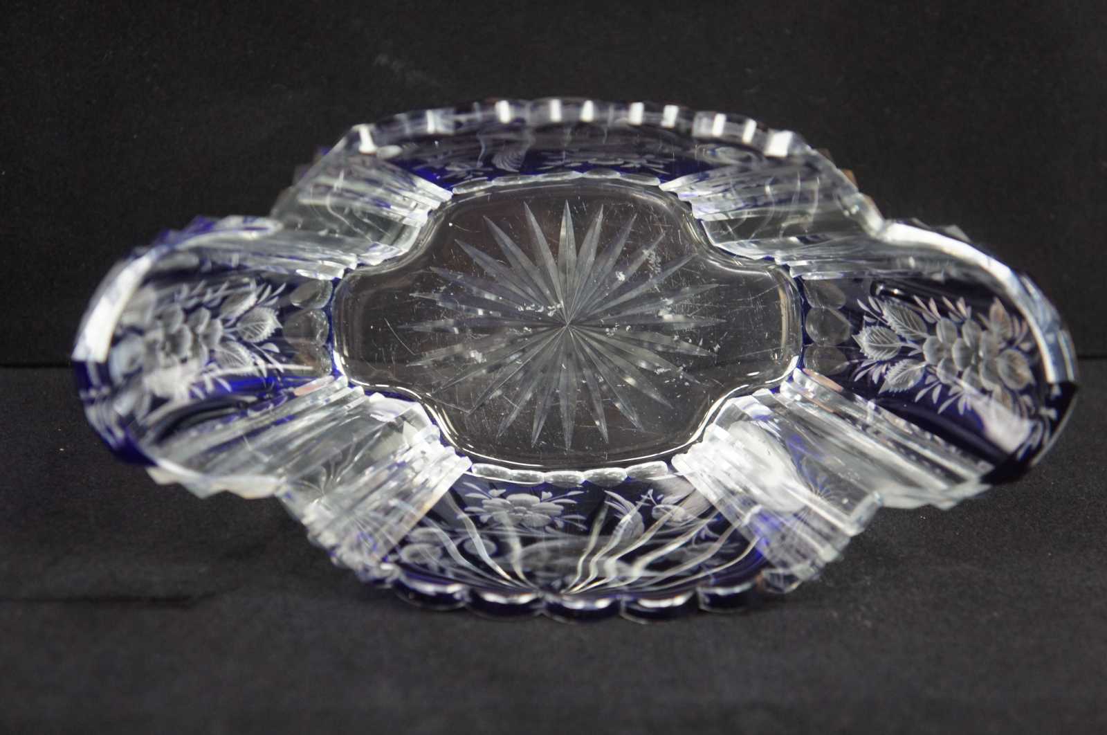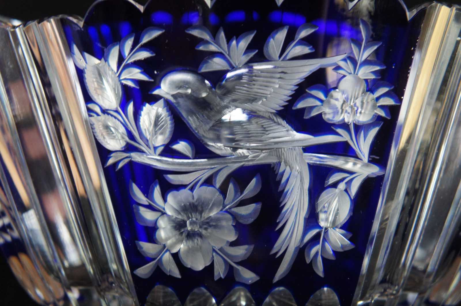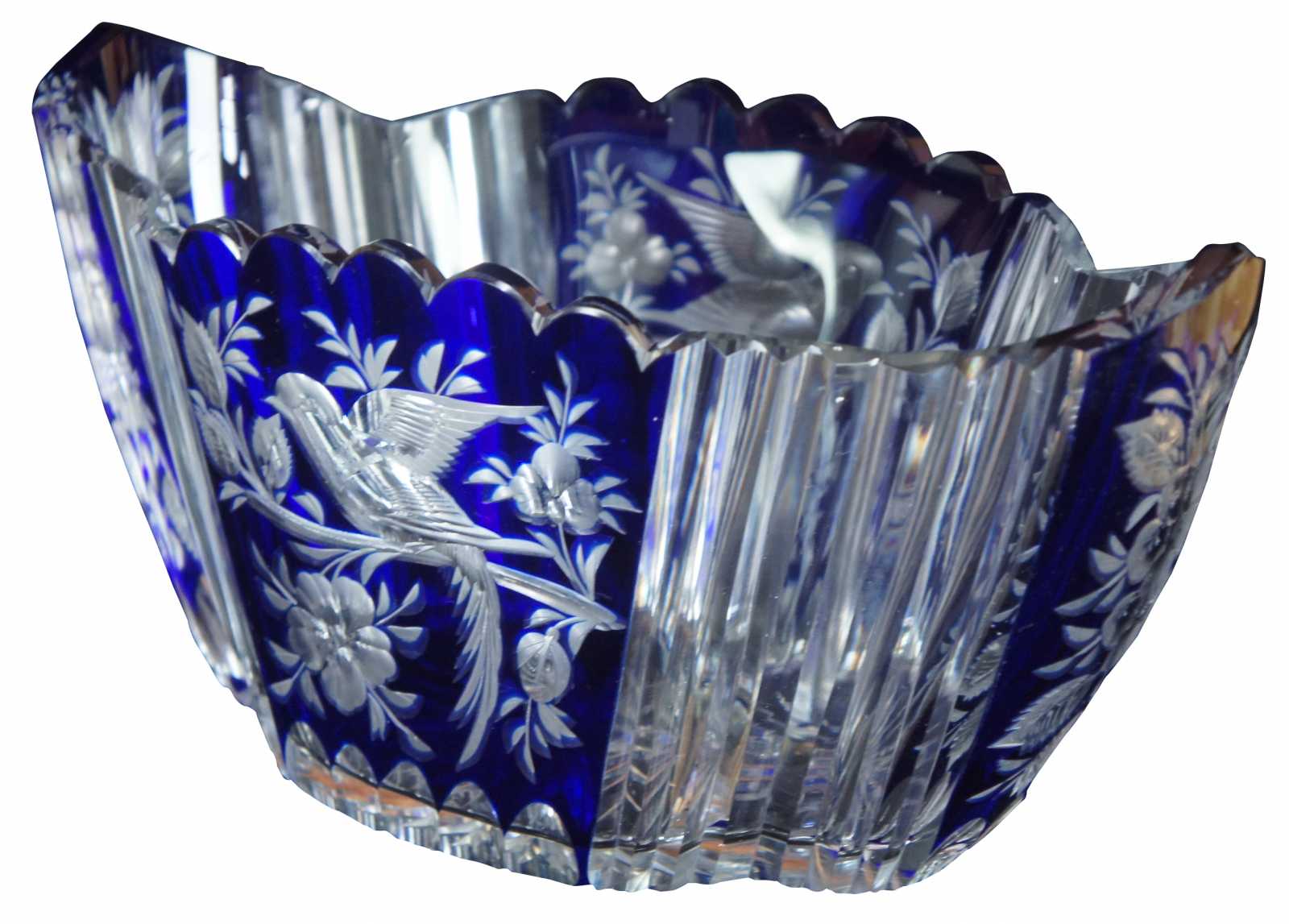 Vintage Bohemian cut to clear cobalt blue oval centerpiece bowl with flowers and birds.