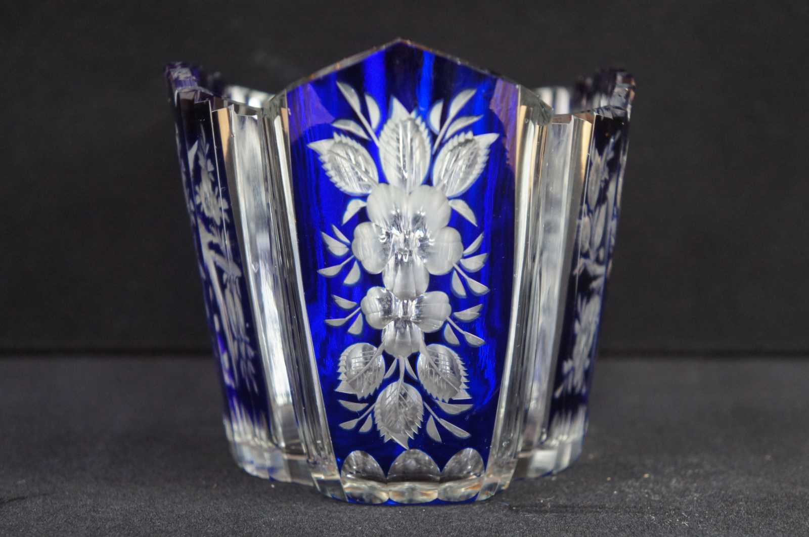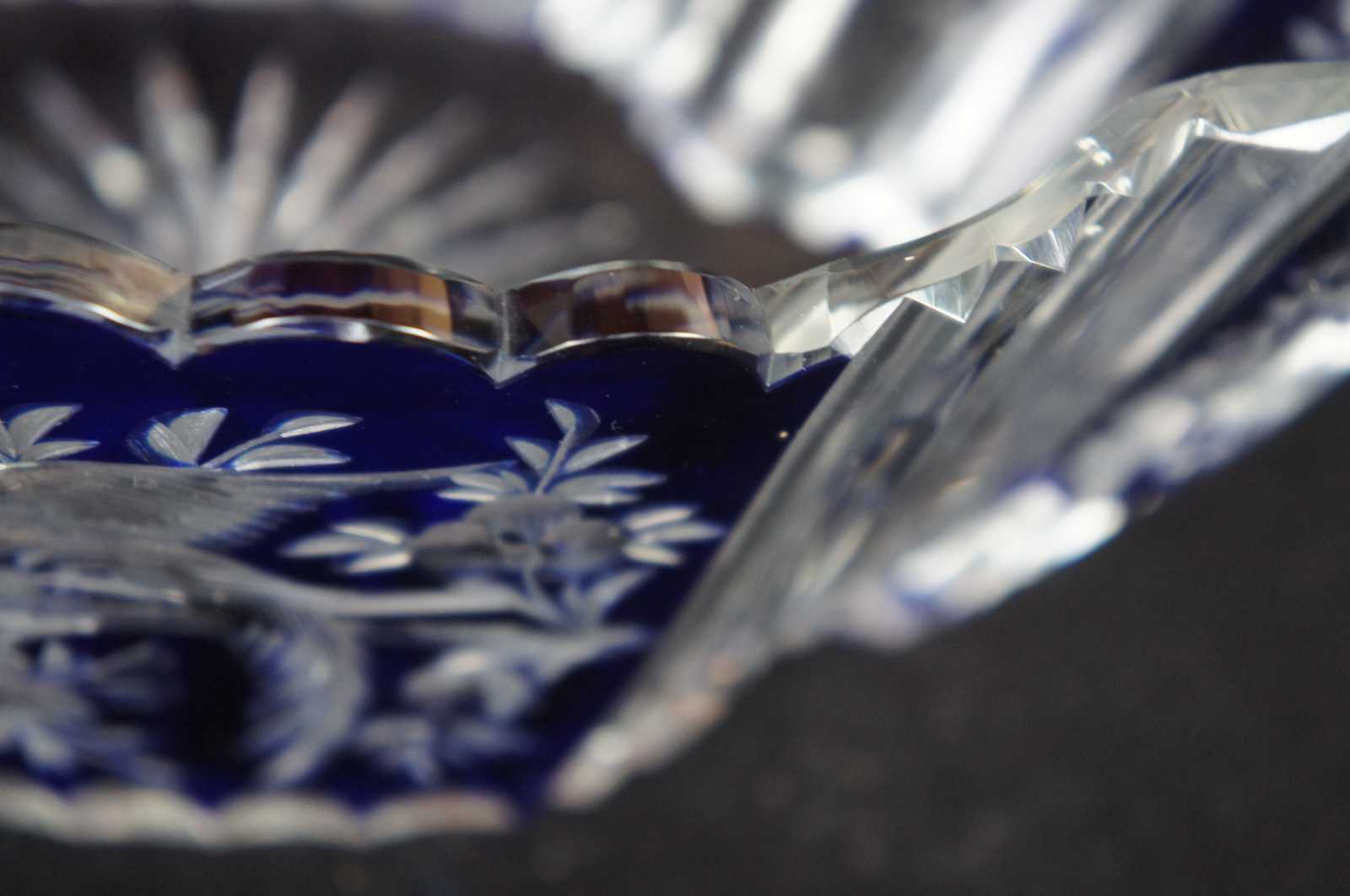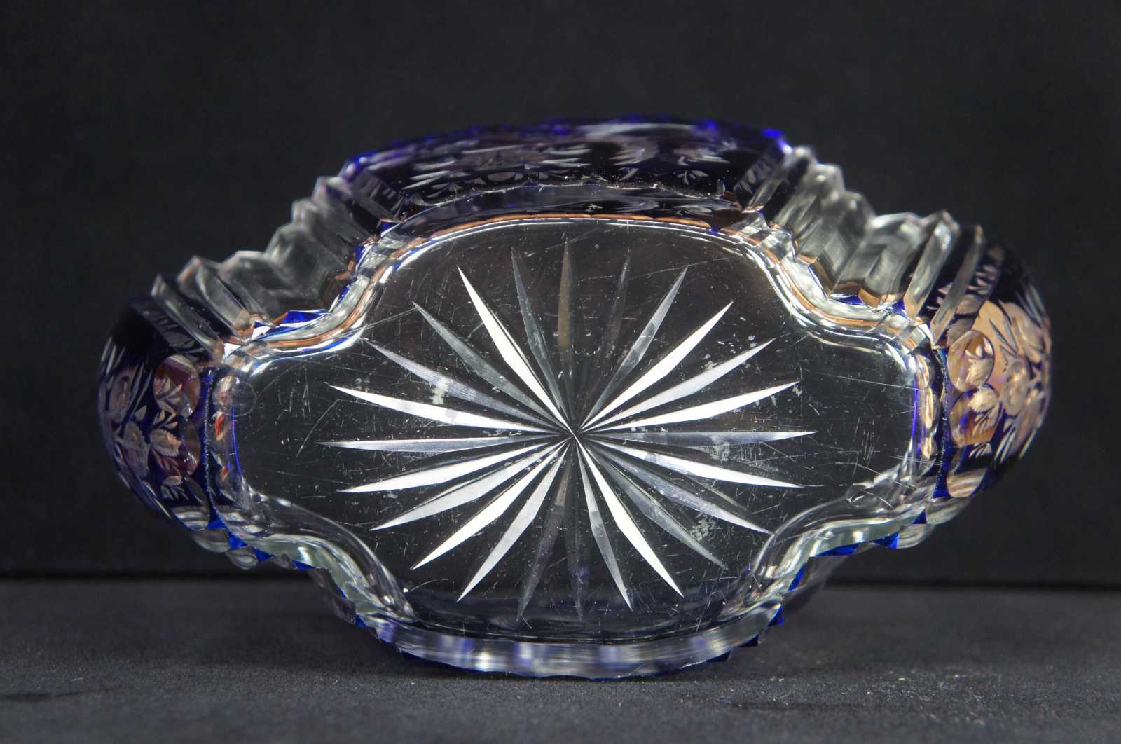Vintage Bohemian cut to clear cobalt blue oval centerpiece bowl with flowers and birds.