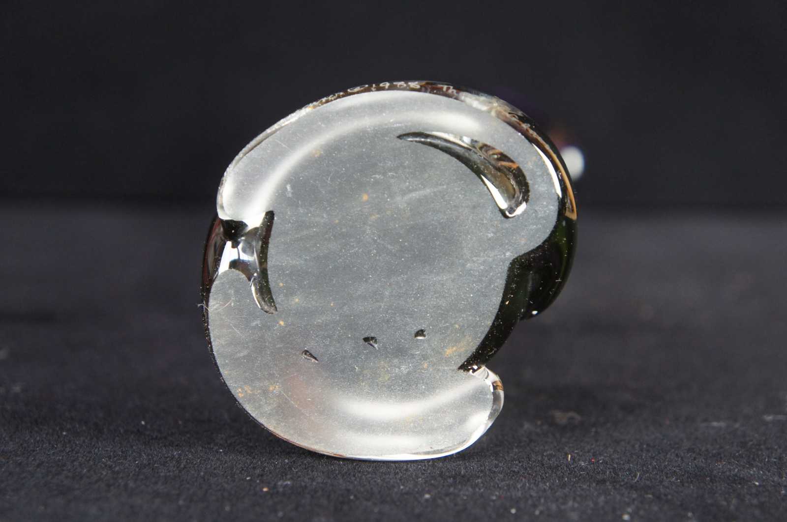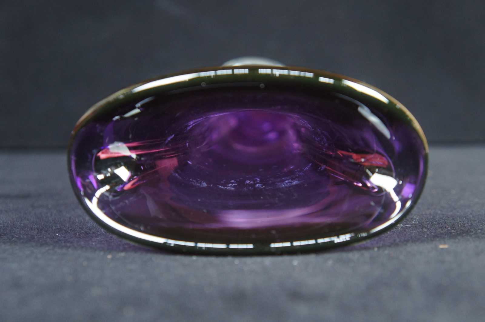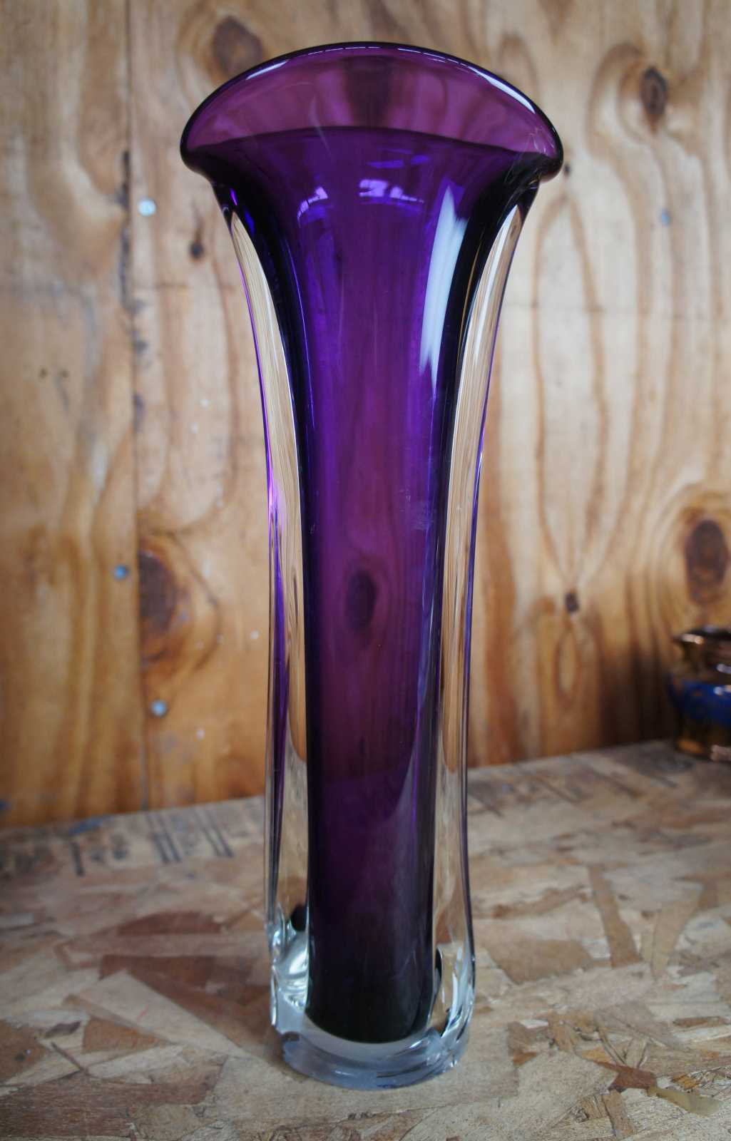 Vintage 1998 signed art glass purple tulip vase by Matthew Buechner for Thames Glass. “For nearly 40 years, Matthew Buechner has dedicated his life to his passion for glassblowing. Born and raised in Corning, New York to father Thomas, a renowned glassblower, painter, and writer and mother Mary, also an artist, Matthew grew up in a life surrounding art. Matthew attributes his appreciation for making and collecting art to his loving, artistic parents.
