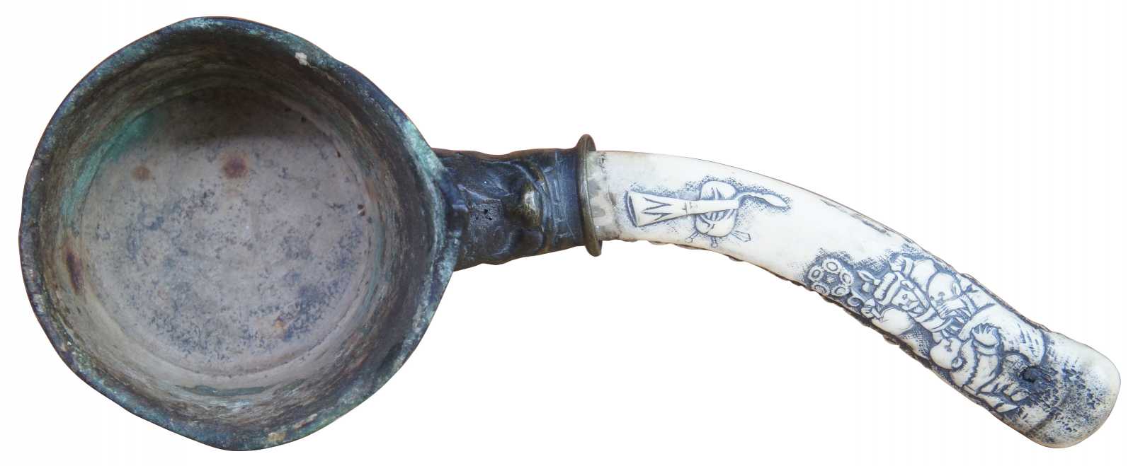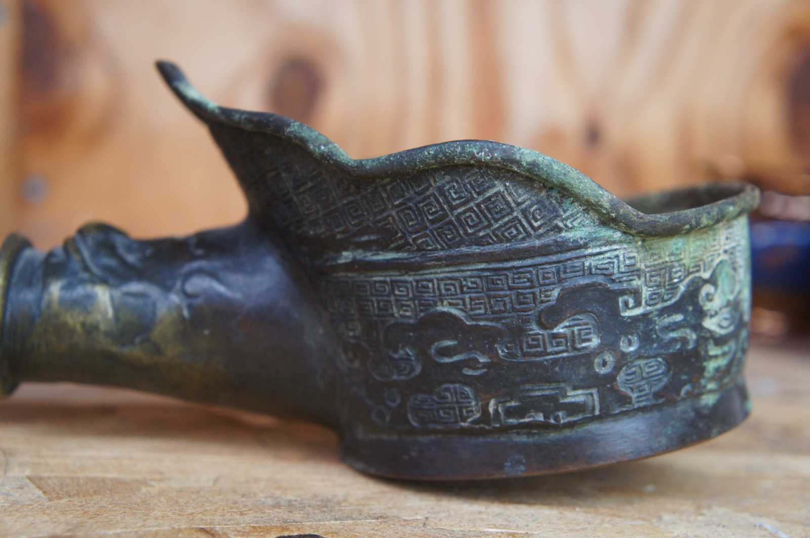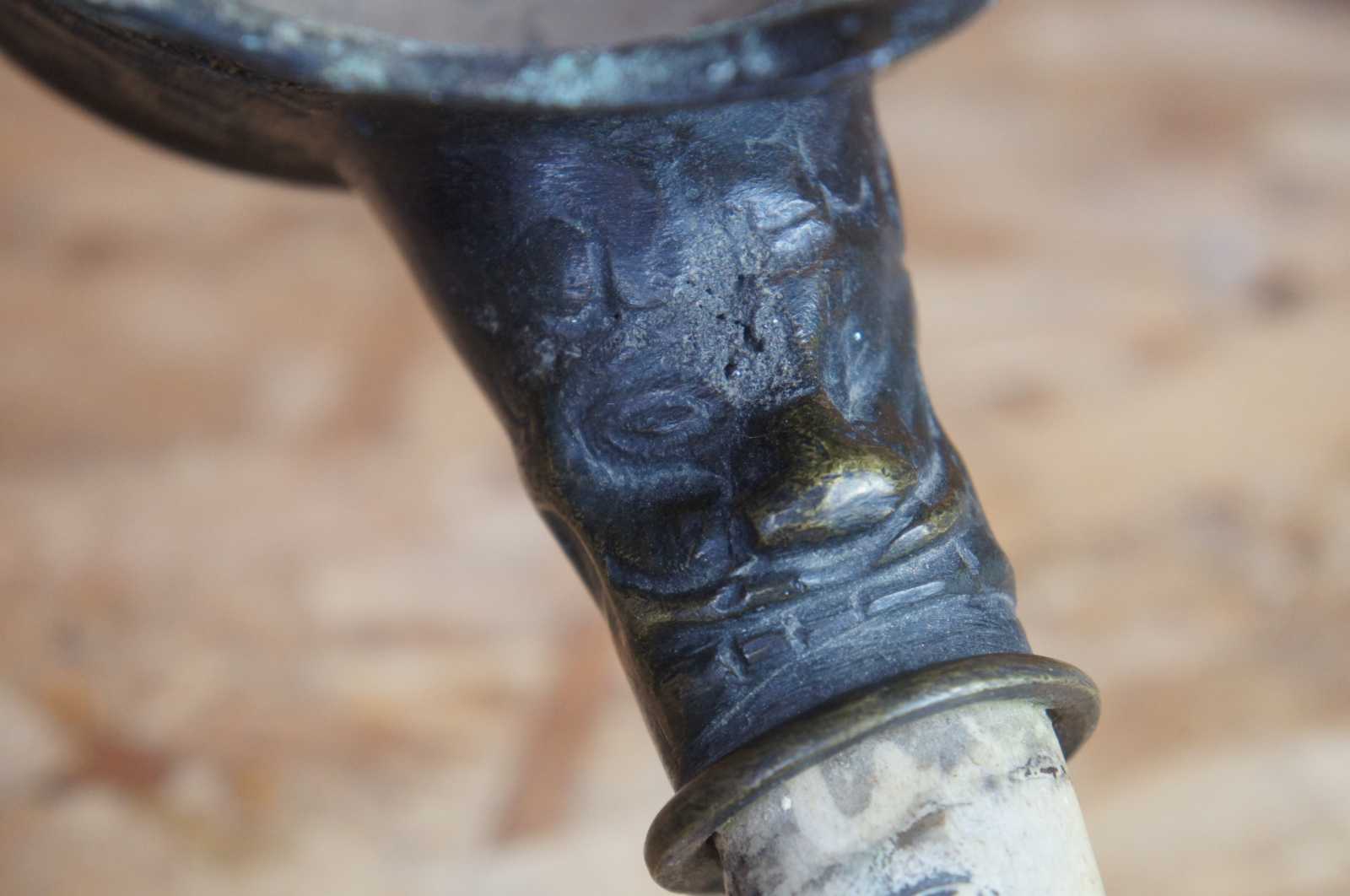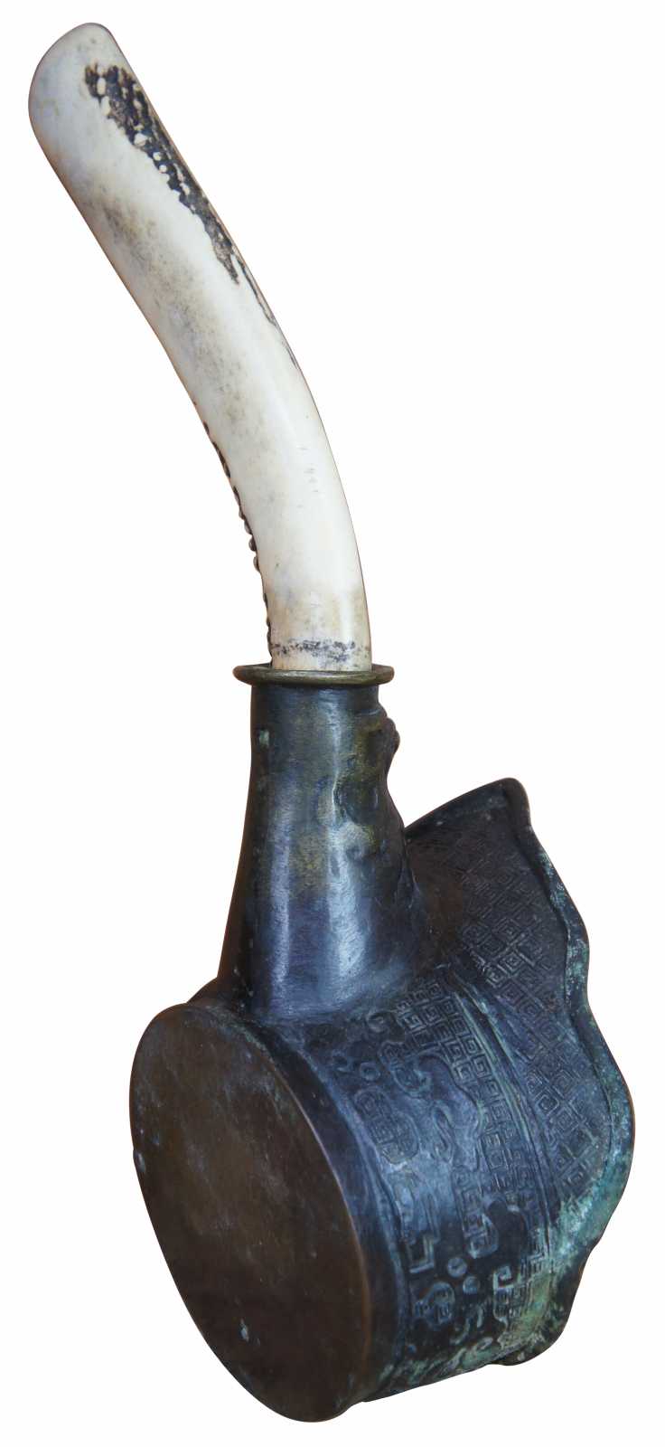 Antique bronze silk iron decorated with geometric patterns and dragons, with a naturally curved horn handle carved with figures and instruments.