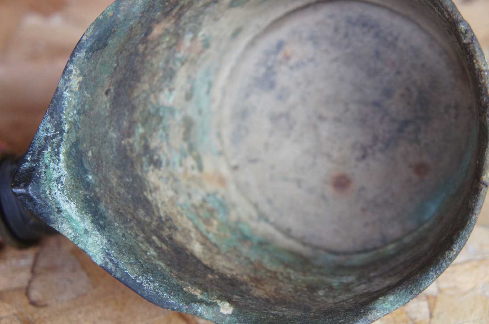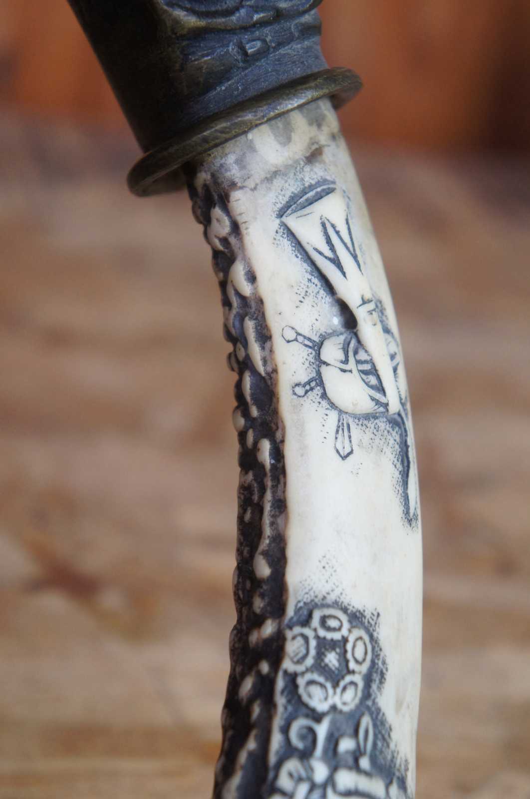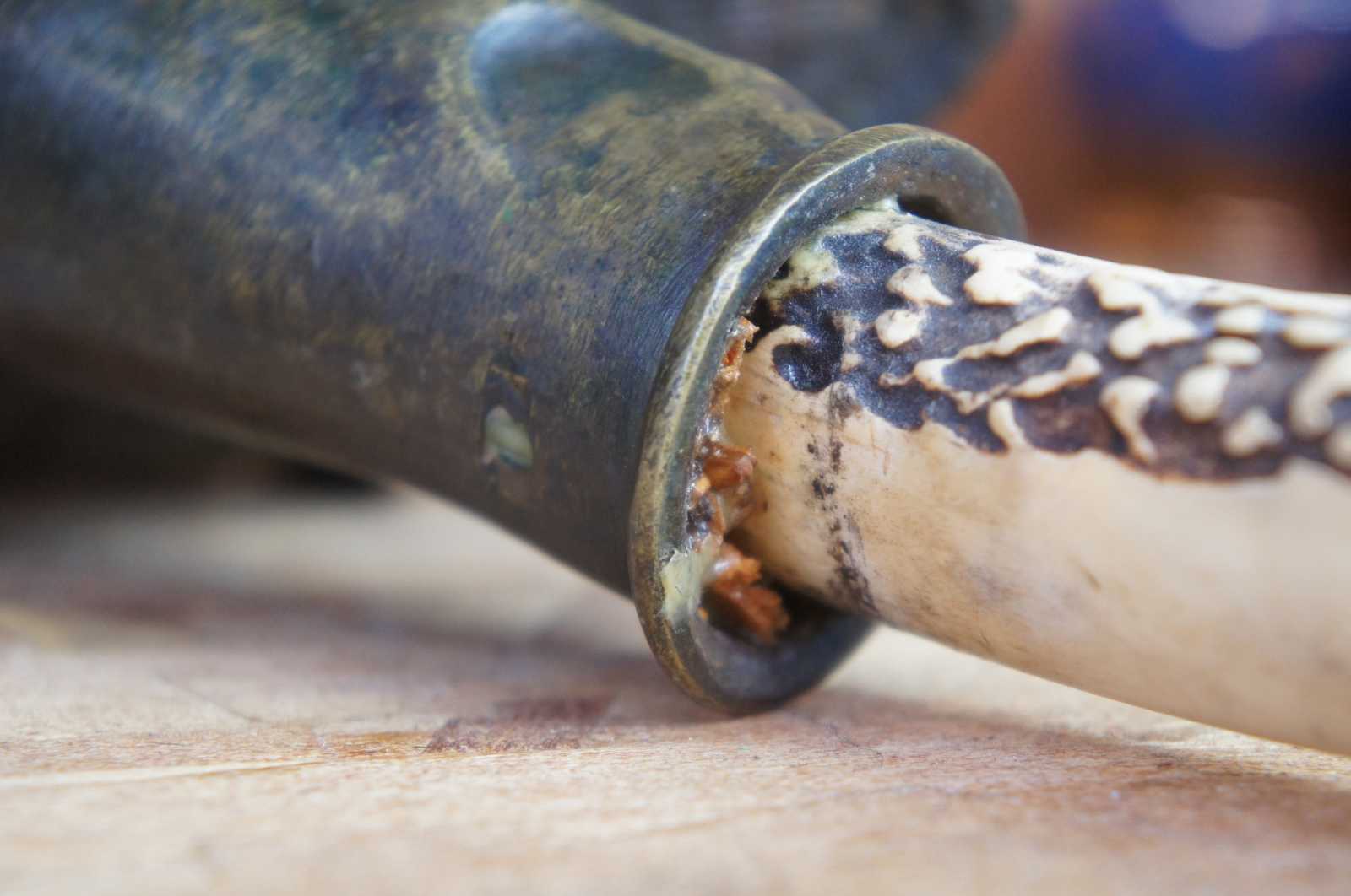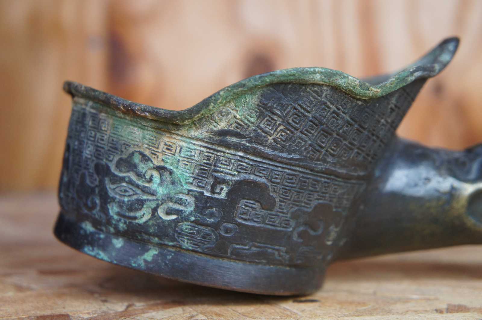 Antique bronze silk iron decorated with geometric patterns and dragons, with a naturally curved horn handle carved with figures and instruments.