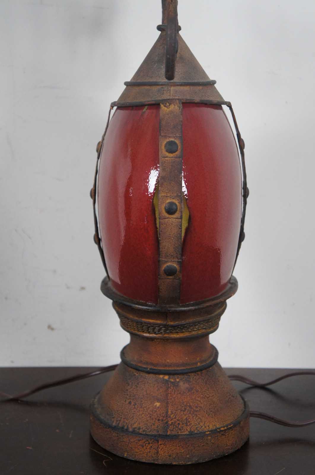 Pair of rustic round oxblood ceramic table lamps with iron bands, bases and scrolled accents.