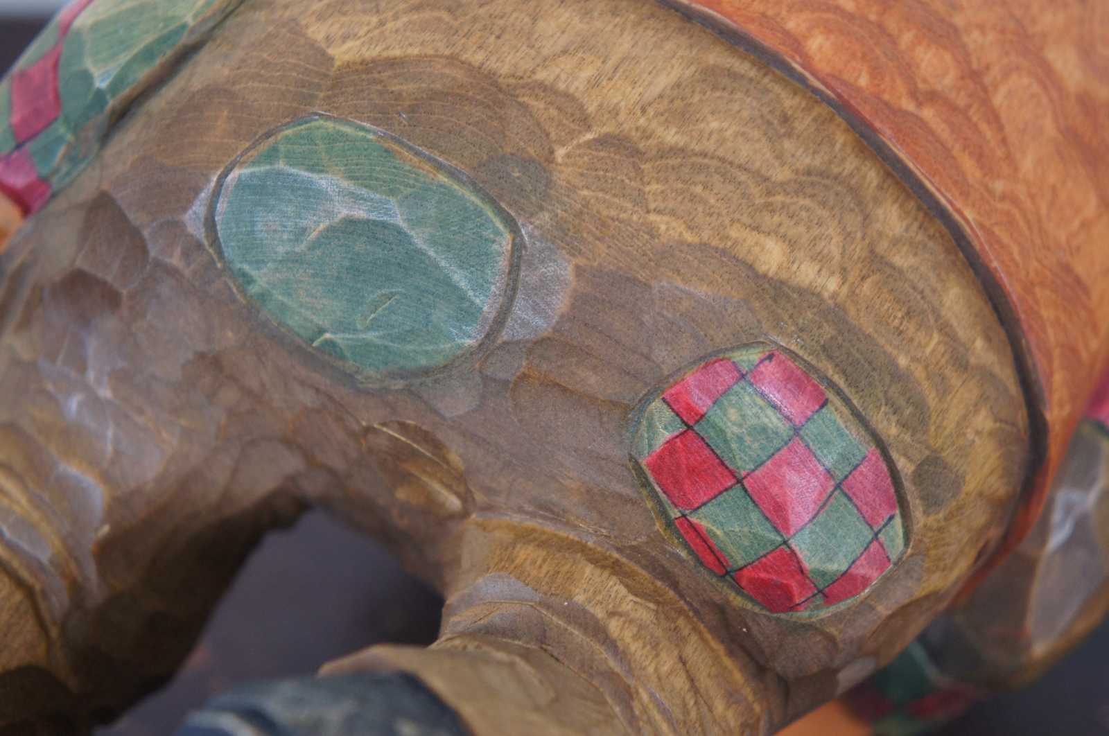 Vintage hand carved wood troll by Anton Sveen, wearing a checkered shirt, patched pants, and brown vest, smoking a pipe and using a walking stick, signed along the edge of one shoe. Marked “Rolp NYC DBC ‘76” by previous owner in pen on base.“Anton (ASv) Sveen (1914 - 2009) was active/lived in Norway. Anton Sveen is known for Hand-carved wooden trolls, folk art.”
