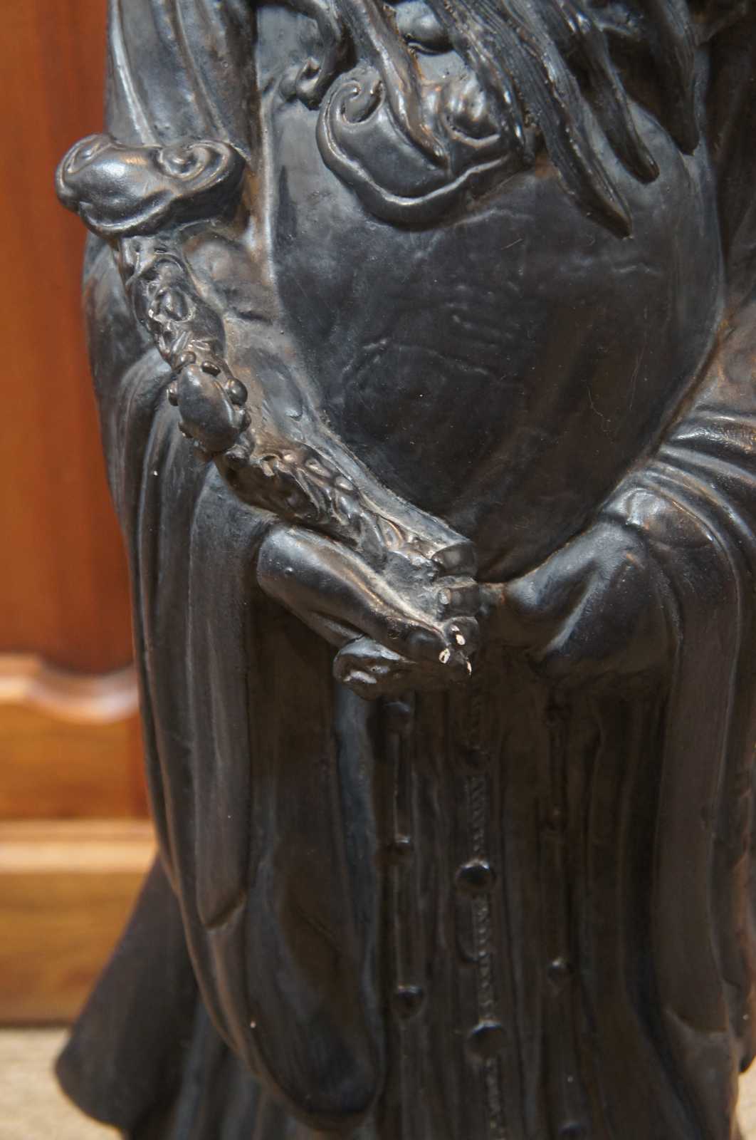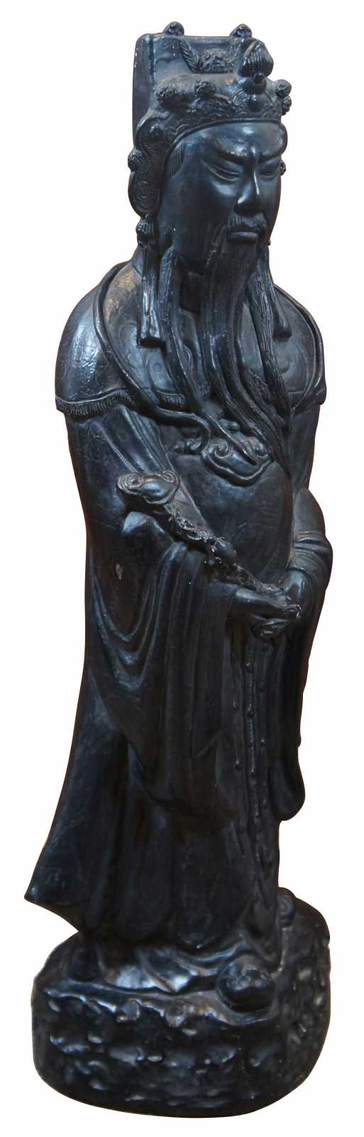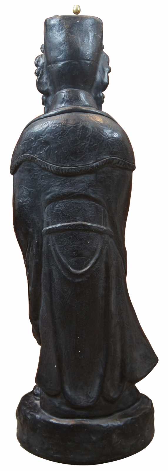Black ceramic sculpture of the Chinese diety Lu Hsing produced by The Museum Company. “Luxing, Wade-Giles romanization Lu Hsing, in Chinese mythology, one of three stellar gods known collectively as Fulushou. He was honoured as a deity who could make people happy through increased salaries or promotions that brought prosperity (lu). In life, Luxing was a scholar who bore the name Shi Fen. In the 2nd century bc he was a favourite of Emperor Jing and was made a high official at the royal court. His family prospered through imperial generosity. Perhaps because the Chinese have many gods of wealth and happiness, Luxing is not nearly so widely honoured as is Shouxing, the god of longevity.”