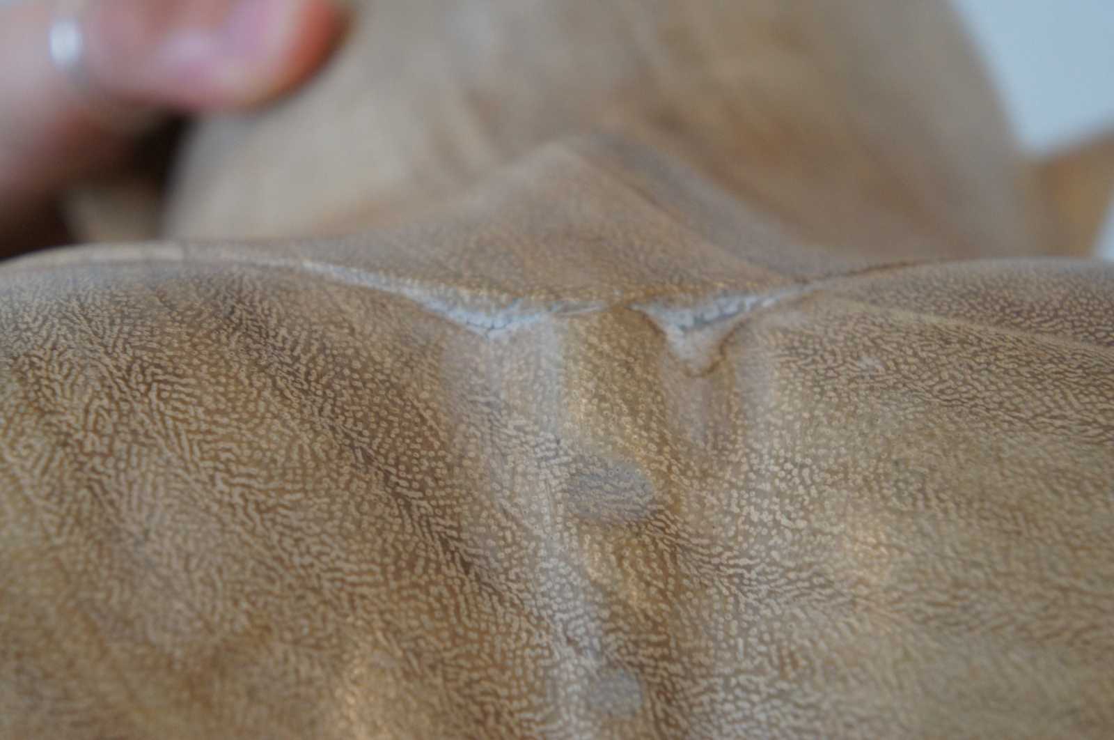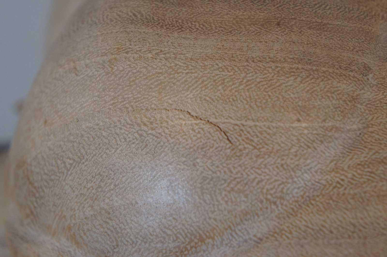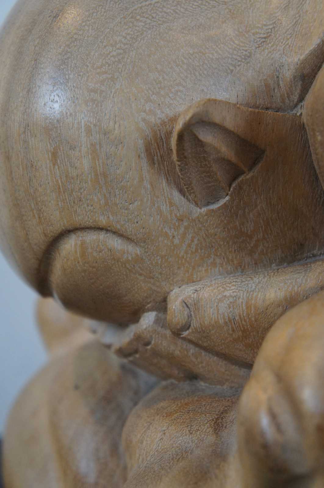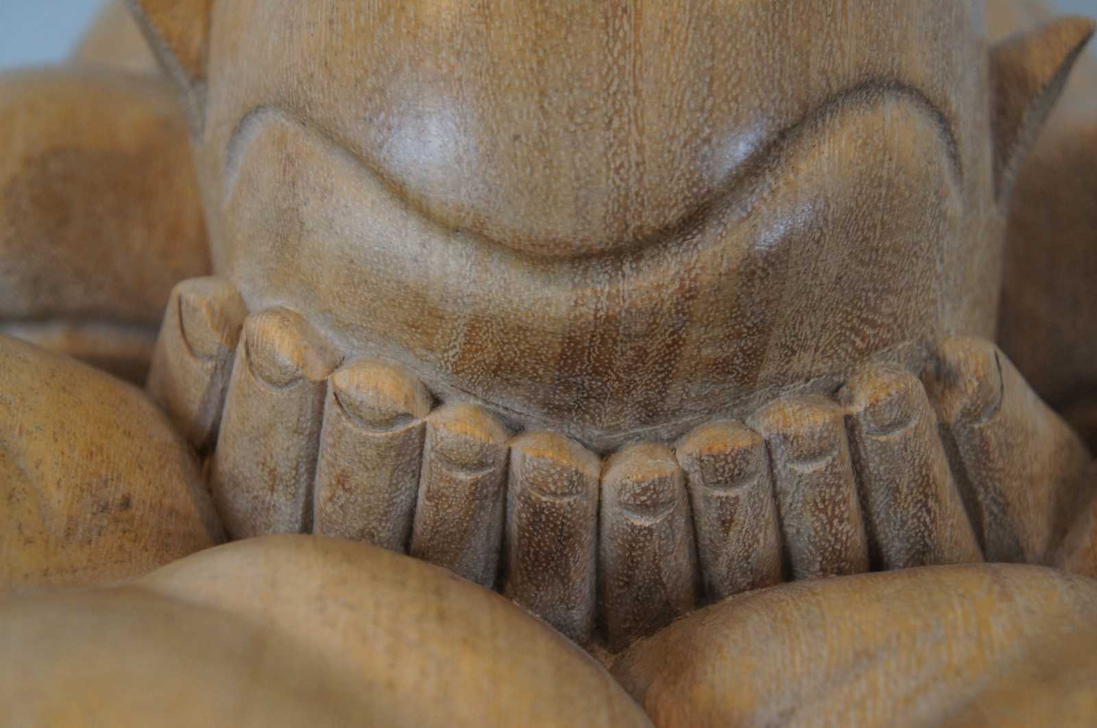 Vintage carved teak sculpture of the Buddha weeping, huddled into a tight ball. “The statue of the weeping Buddha depicts Buddha in a bent over position, covering his face with his hands.