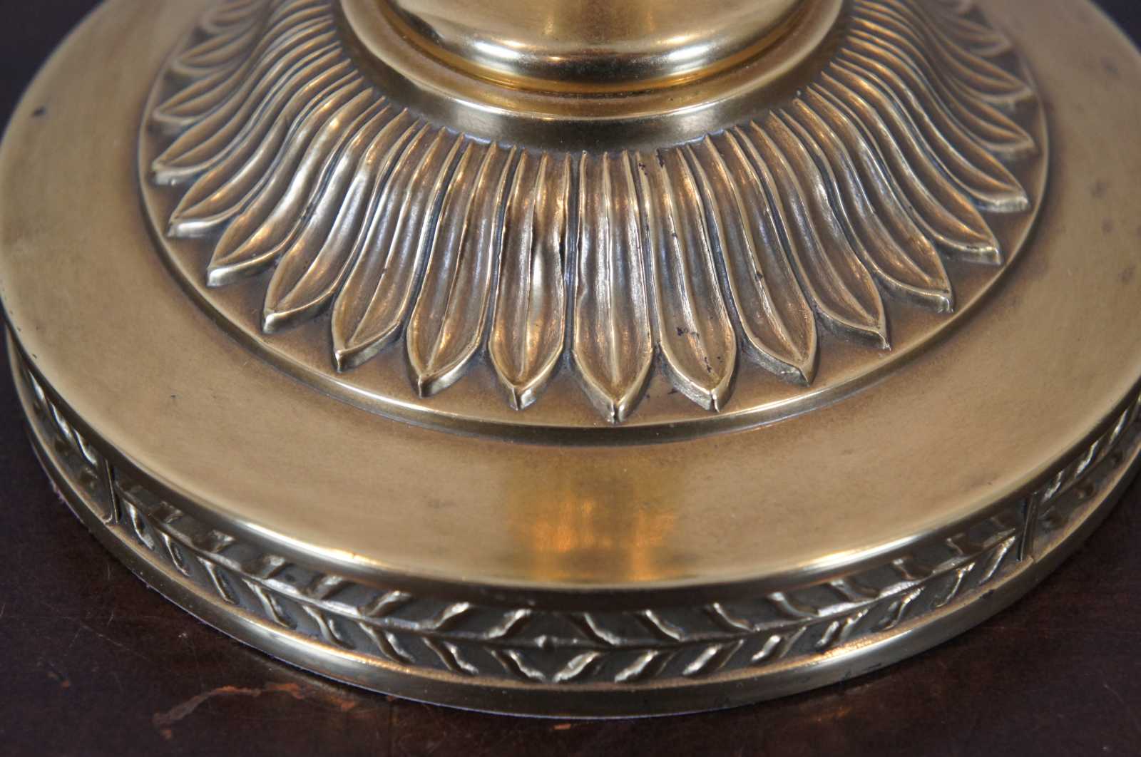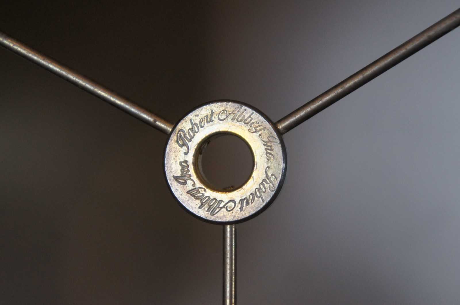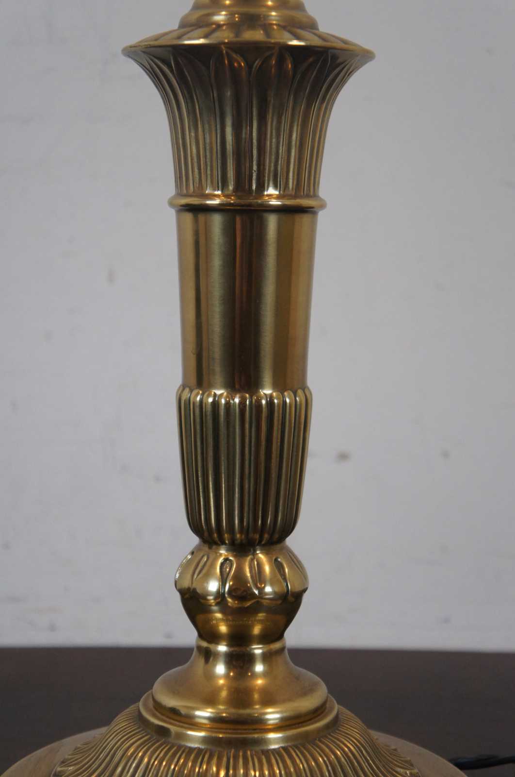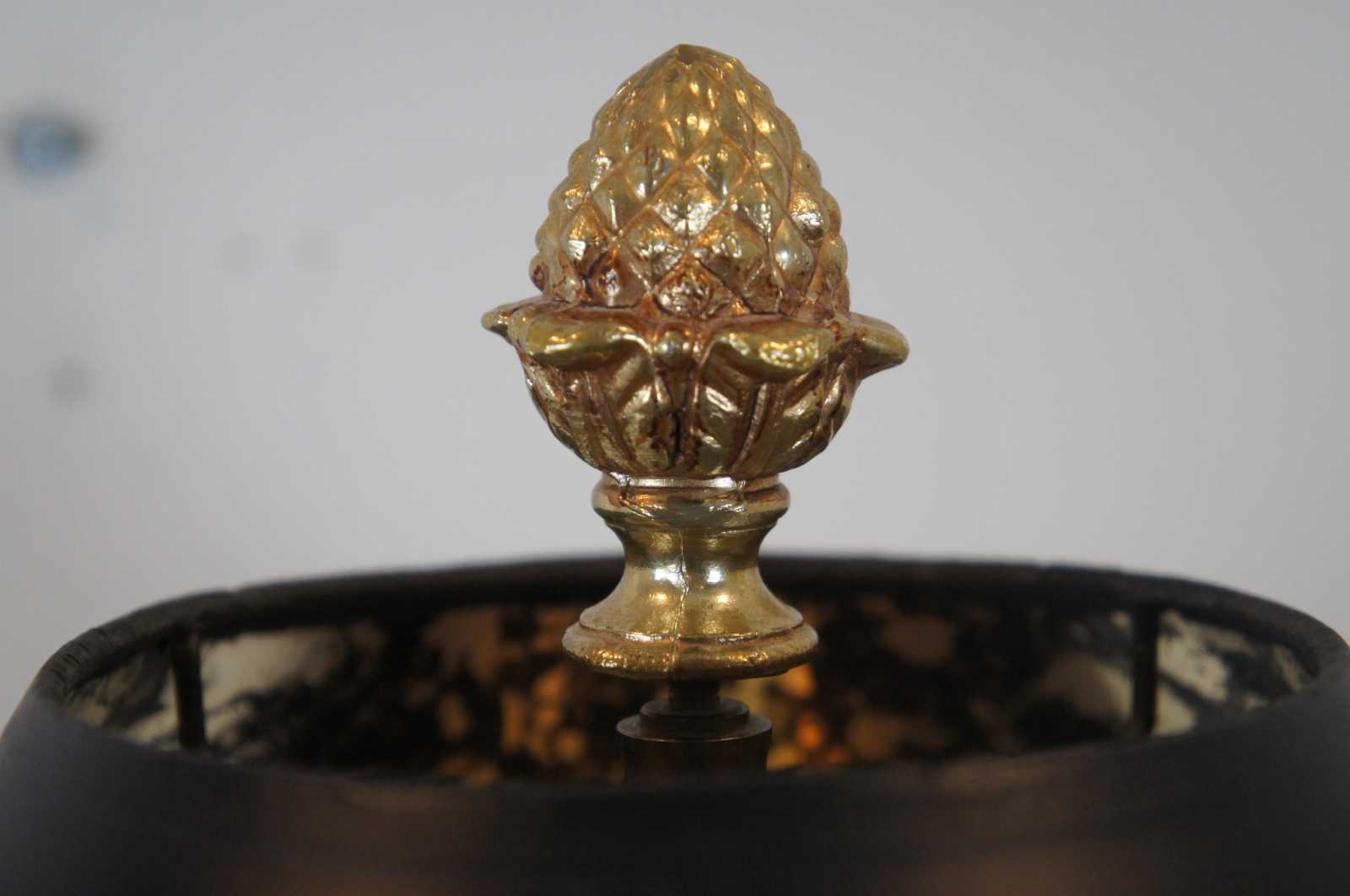 Robert Abbey Inc brass candlestick shaped table lamp with acorn finial and black shade with reflective interior.