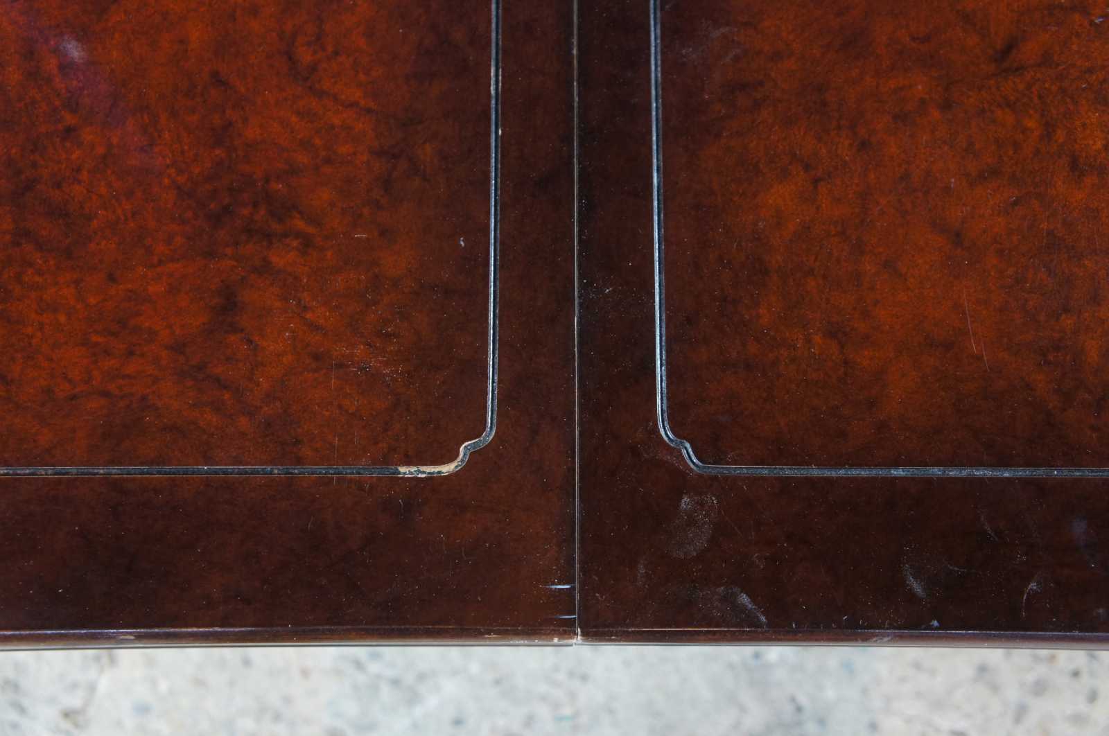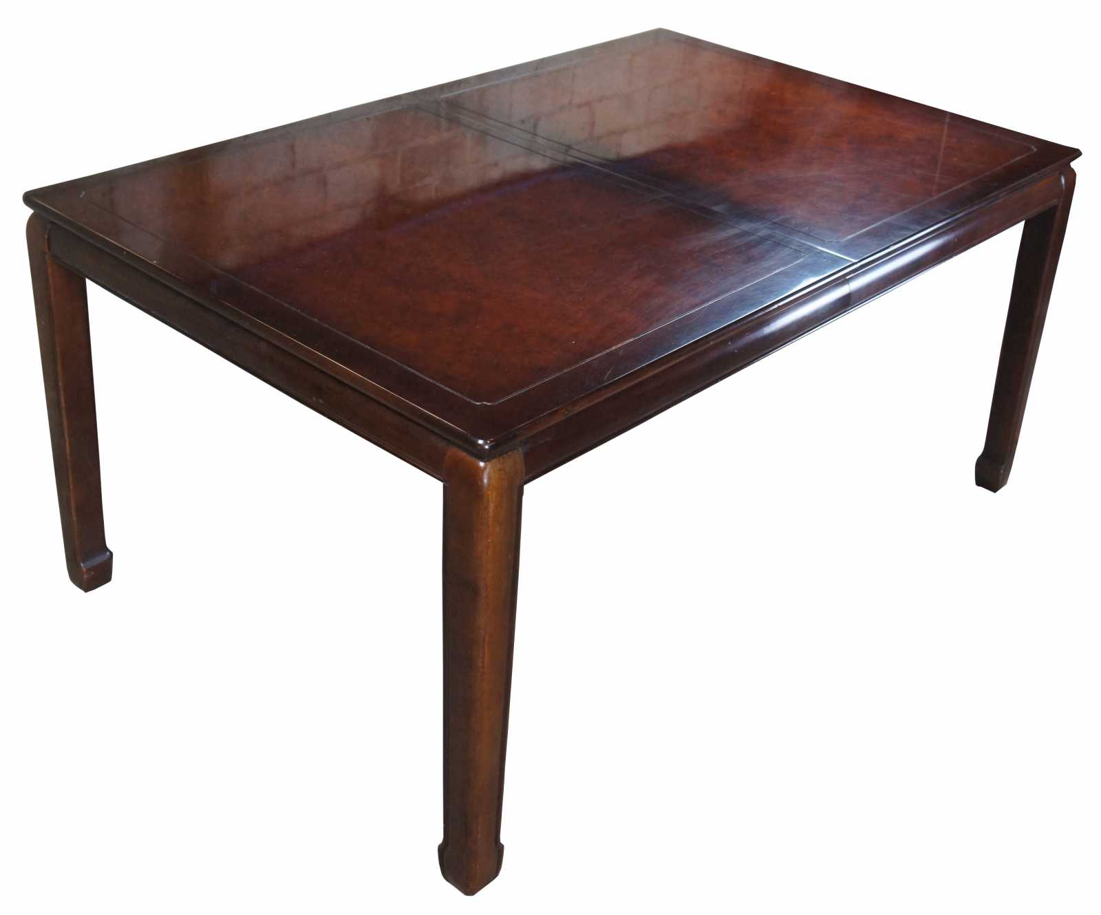 1980s White Furniture Company Mandarin dining table, 330-12. Rectangular form with mahogany and burlwood top. Includes 2 leafs for extensions.